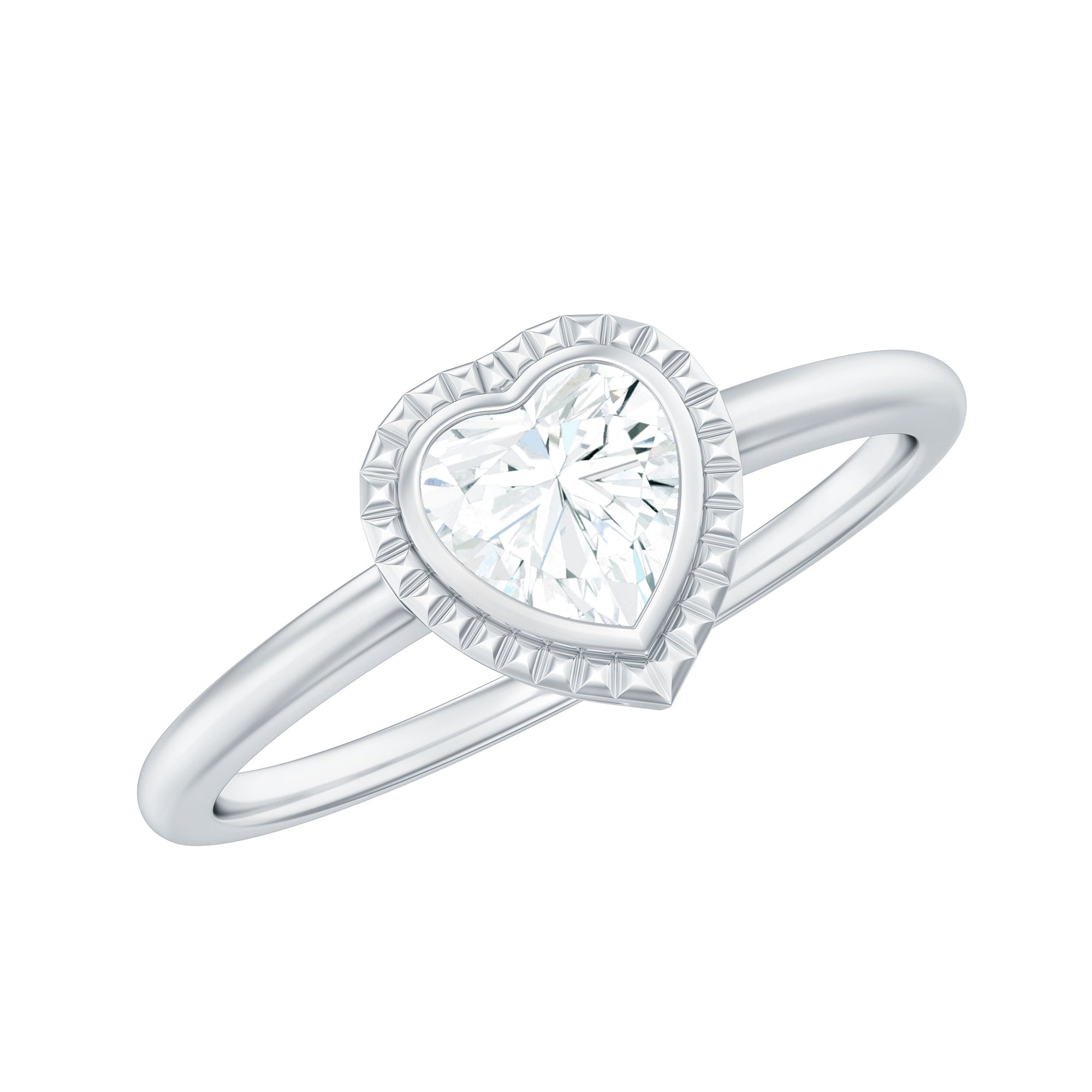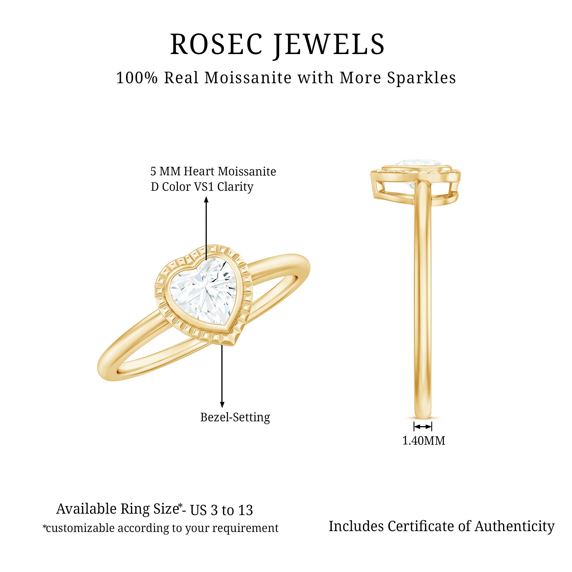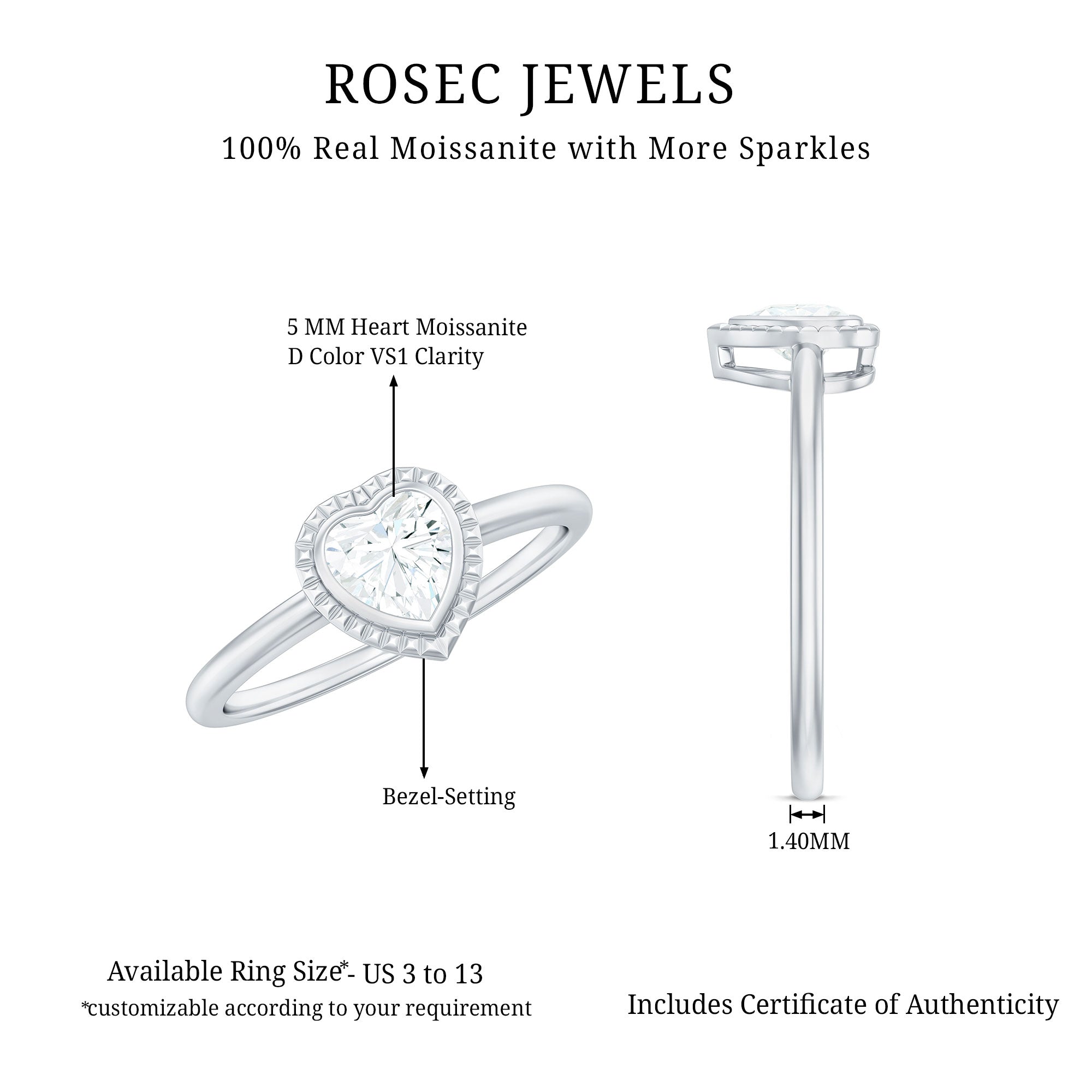 Indulge in the world of sustainable luxury with this exquisite Heart Moissanite Ring. This piece embodies timeless elegance, showcasing the captivating brilliance of moissanites while reflecting a commitment to ethical practices. Crafted by Rosec Jewels, this exquisite piece embodies the concept of everlasting love, featuring a Solitaire Moissanite, making it a perfect selection for a proposal or promise. The Heart Promise Ring highlights a 5MM Heart Shaped Moissanite with D Color and VS1 Clarity, elegantly set in bezel setting surrounded with beaded design, which enhances the sparkle of the center moissanite stone. This 1/2 Carat Moissanite Ring is designed in the classic solitaire style, which is undoubtedly a favorite among women when it comes to jewelry. The Moissanite Promise Ring is available in a range of sizes to ensure a perfect fit. This Jewelry Gift option is budget-friendly, as it shines like a Natural Diamond and is available in a range of precious metal selections to accommodate your financial plan. Present the deep affection you possess with this Solitaire Moissanite Ring for Women, representing love and dedication.