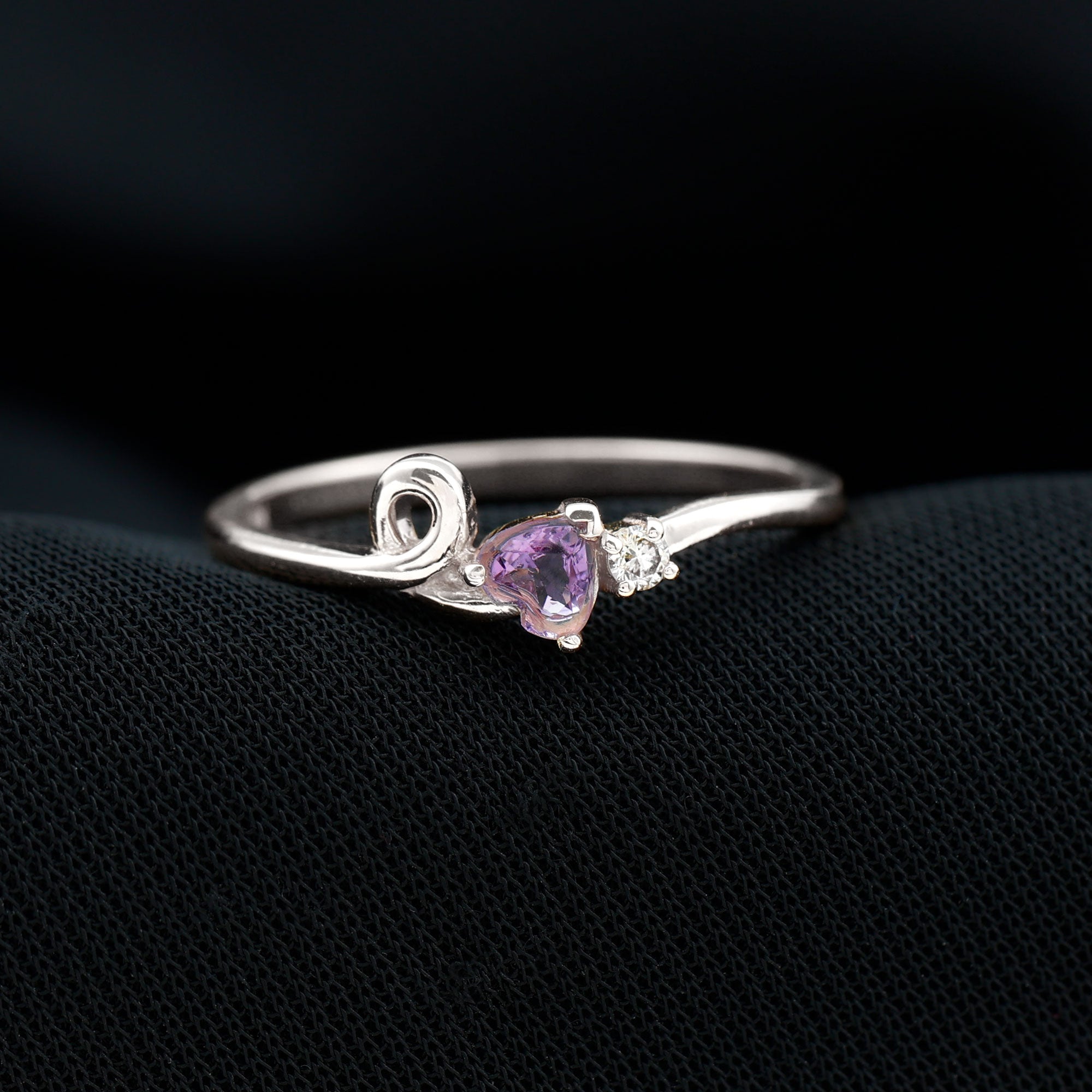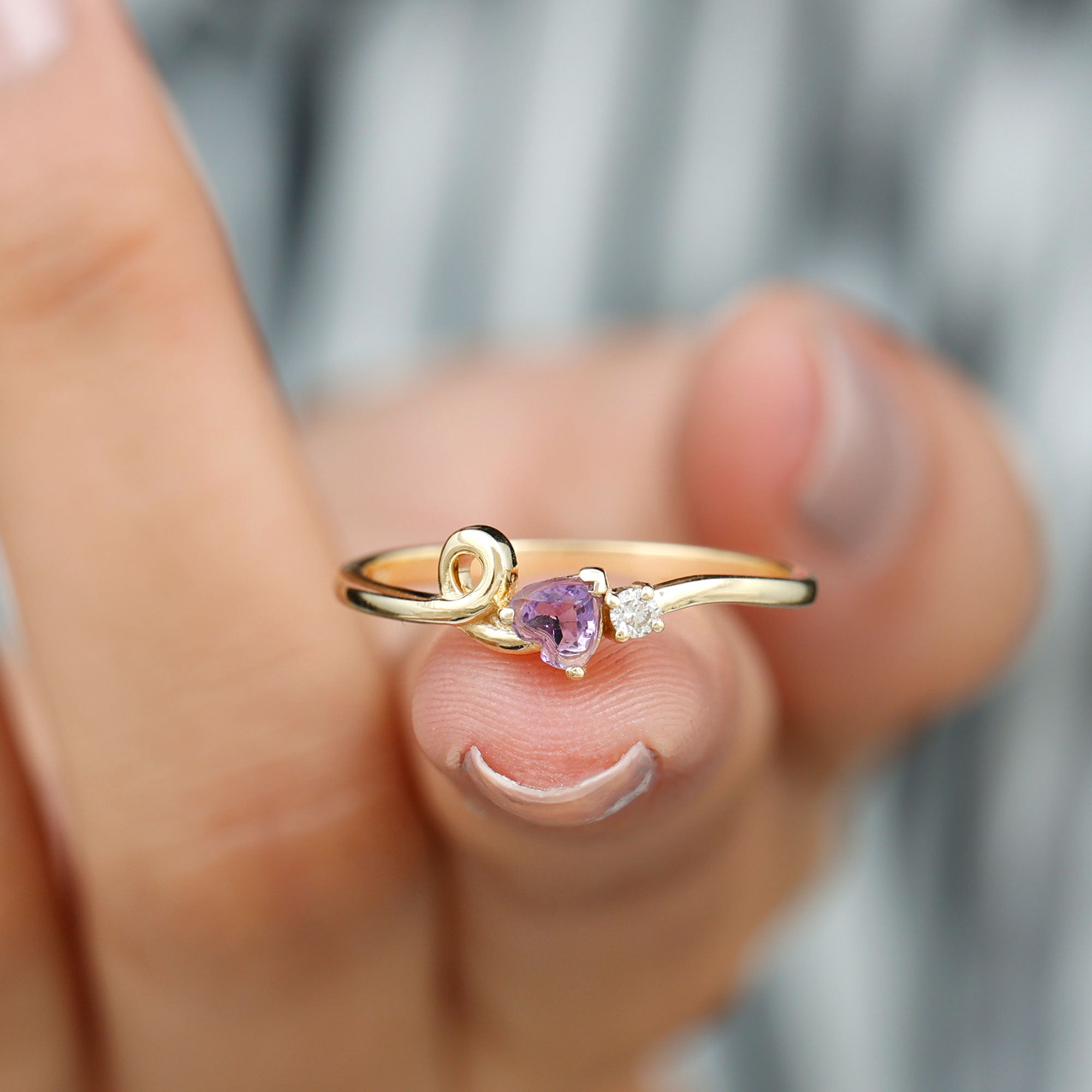 Radiant with brilliance and shimmer, behold the Heart Promise Ring designed for women. It showcases a heart-shaped Amethyst held elegantly in a prong setting, accompanied by sparkling Diamond stone. The ring features an intricately crafted twisted band, all fashioned from high quality metal.