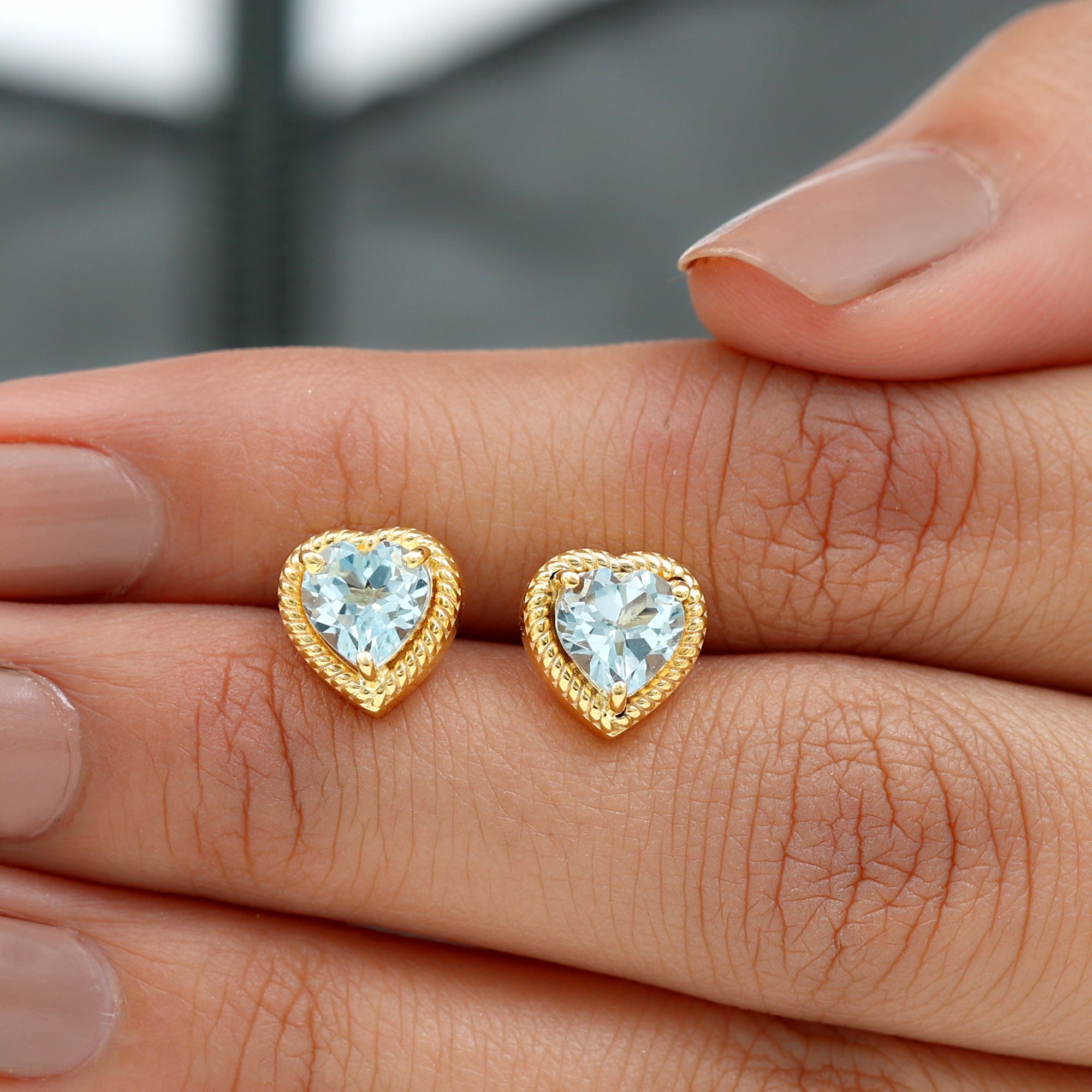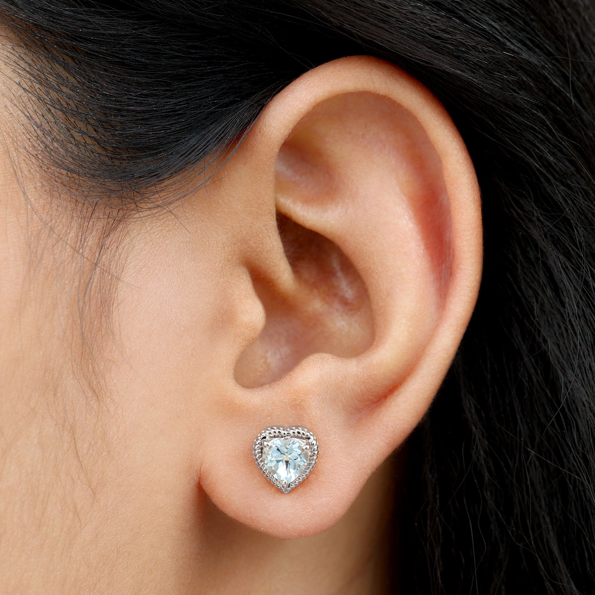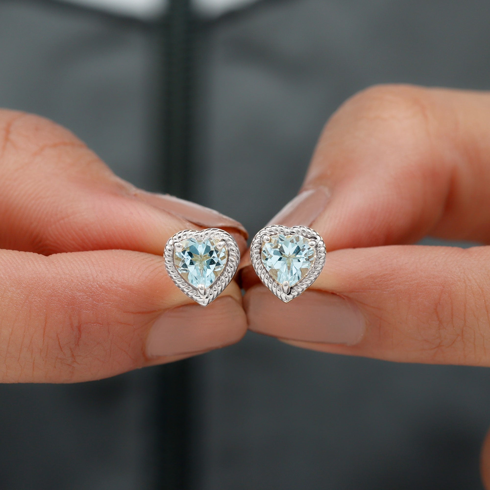 Heart Shape Sky Blue Topaz Solitaire Stud earrings with Twisted Rope Frame