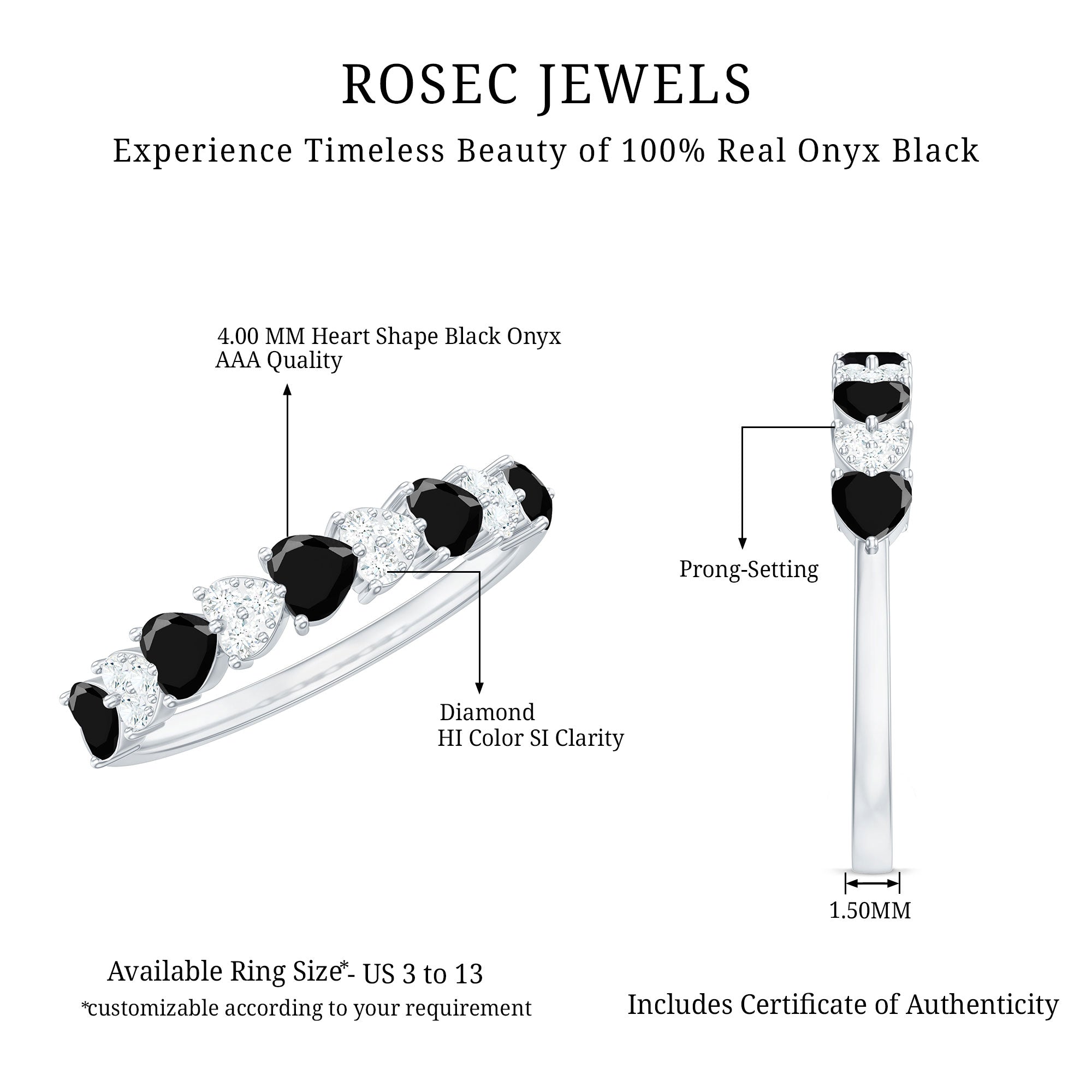 A piece of jewelry that speaks the language of love. This Black Onyx Wedding Band holds meaning in every detail. Designed to honor the bonds that last a lifetime, this Heart Eternity Ring is a graceful symbol of devotion, beautifully crafted to complement your everyday style. It features carefully selected 4 MM heart shaped Black Onyx gemstones, set in secure prong setting. Each black onyx is paired with shimmering round cut diamonds, each placed inside delicate heart-shaped frames. The alternating pattern creates a rhythm of contrast and sparkle, adding a soft romantic glow to the overall design. Made with love and precision, the Heart Wedding Band carries a half eternity style, perfectly balanced and comfortable for daily wear. It is ideal for those who prefer jewelry with a personal touch, carrying both style and sentiment in equal amounts. Whether worn alone or stacked with other rings, it adds a quiet elegance to your hand. The heart motifs add a romantic flair, making it a thoughtful choice for an anniversary, a promise, or just a meaningful gift. This handcrafted Black Onyx and Diamond Band is a gentle reminder of lasting love and the moments shared along the way. Whether you are marking a milestone or simply expressing how much someone means to you, this Black Onyx Stackable Ring is a timeless keepsake, made to be cherished every day.