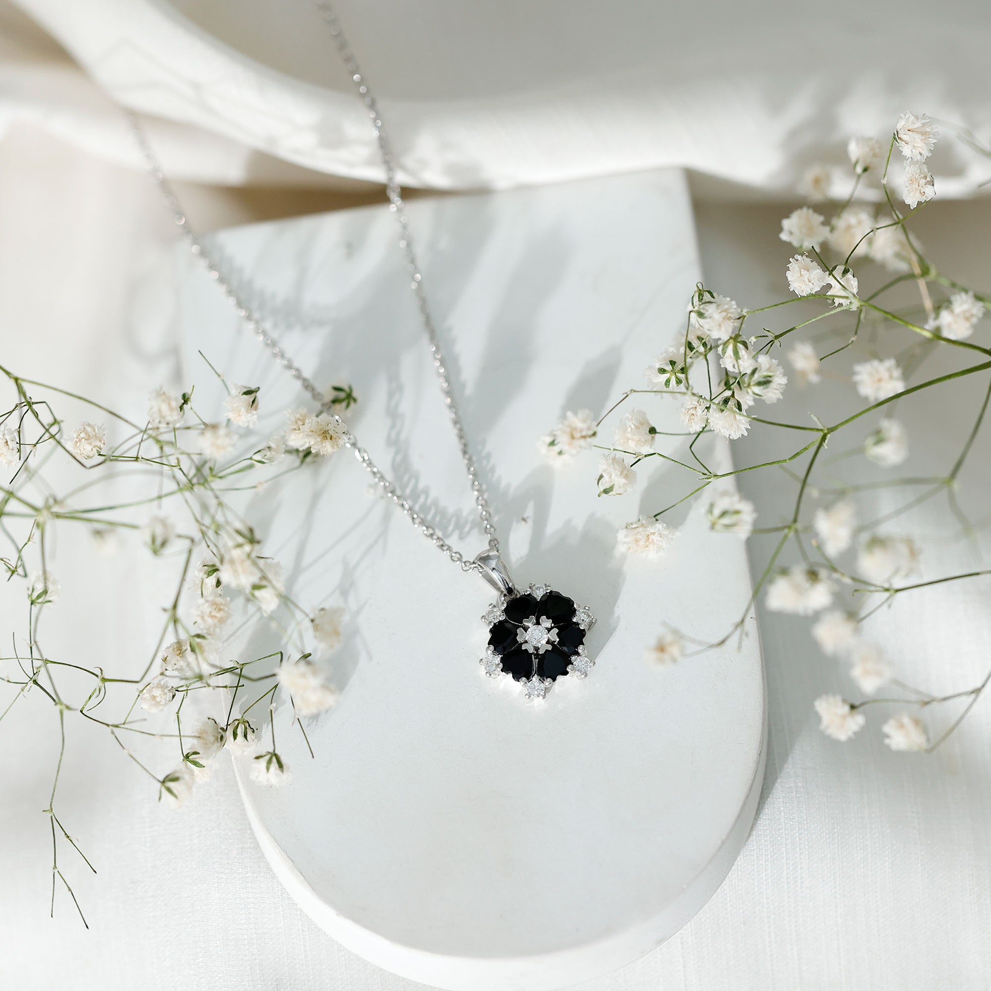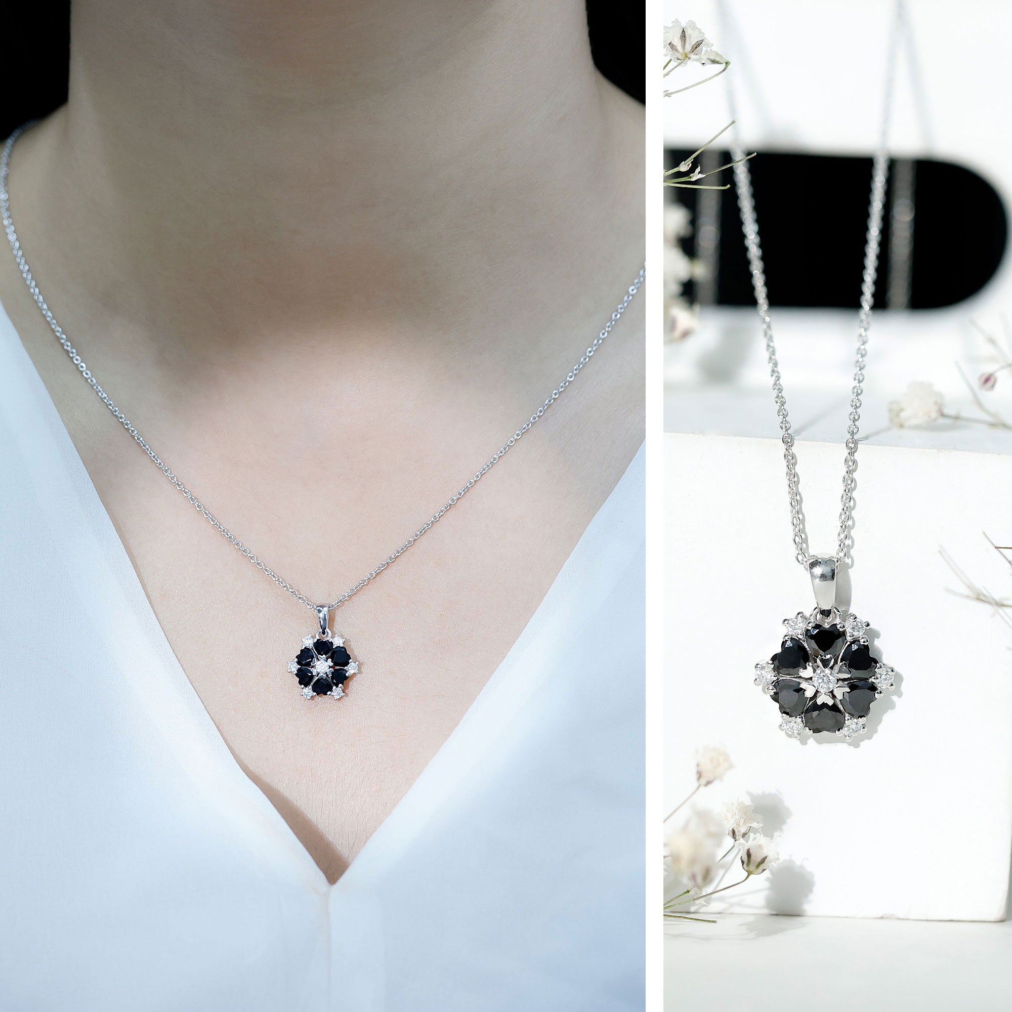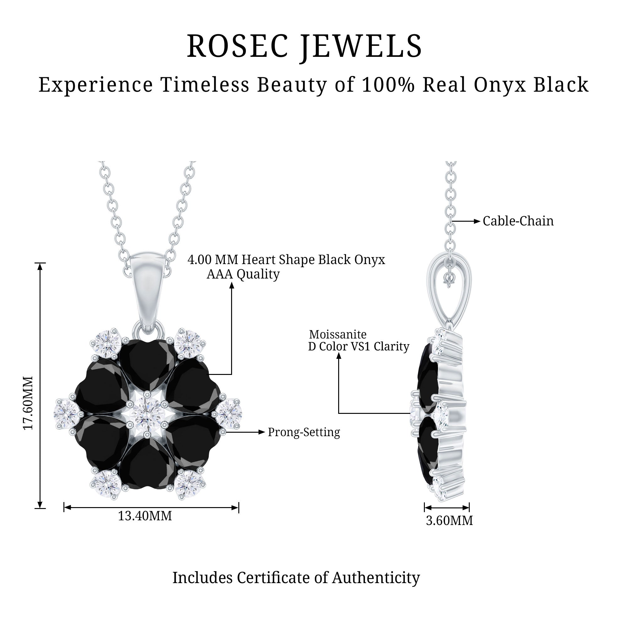 Adorn your neckline with this Black Onyx Pendant Necklace crafted with 14K White Gold Plated Silver. This pendant features Heart Shape Black Onyx gemstones cluster to make a flower pattern. Adorned with the smaller round shape Moissanite. The Flower Necklace holds the classic shine of AAA Quality Black Onyx securely placed in Prong Setting. Pair this pendant with other necklaces to achieve a statement look. This pendant dangles in a sturdy cable chain which makes it perfectly sit on the neckline. This Silver Onyx Necklace dangles with a sturdy cable chain, which makes it beautifully sit on the neckline.
