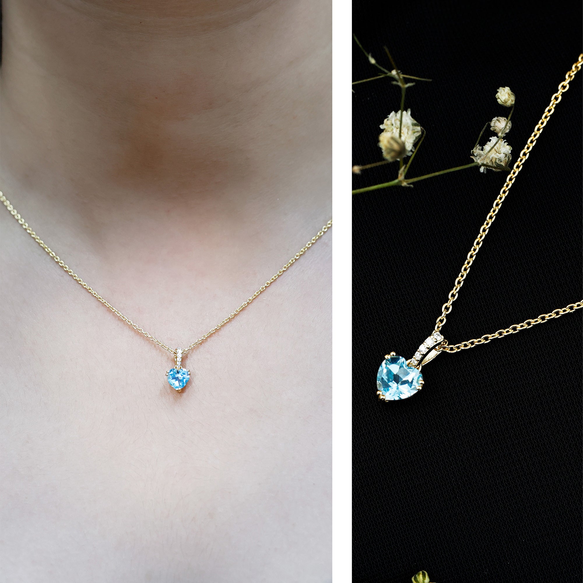 Delicate yet striking, this Swiss Blue Topaz Heart Necklace is a symbol of clarity, connection, and effortless beauty. Expertly crafted in 14k yellow gold plated sterling silver, this elegant Solitaire Pendant features a 6 MM heart shaped Swiss Blue Topaz set securely in double prong setting. Adding an extra layer of sophistication, the Heart Locket Necklace is connected to the chain by a bail adorned with shimmering lab grown diamonds. Suspended from a sleek, durable chain, this Blue Stone Necklace rests gracefully at the neckline, making it ideal for everyday wear or meaningful occasions. Whether worn alone or layered, it adds a personal touch to any outfit, from casual daytime looks to evening elegance. As the birthstone for December, Swiss Blue Topaz symbolizes peace, honesty, and emotional balance, making this Blue Topaz and Diamond Necklace a thoughtful gift for a December born loved one or anyone drawn to jewelry with deeper meaning. Presented in a signature jewelry box, this heart pendant is a beautiful way to mark birthdays, anniversaries, or moments of self-love.