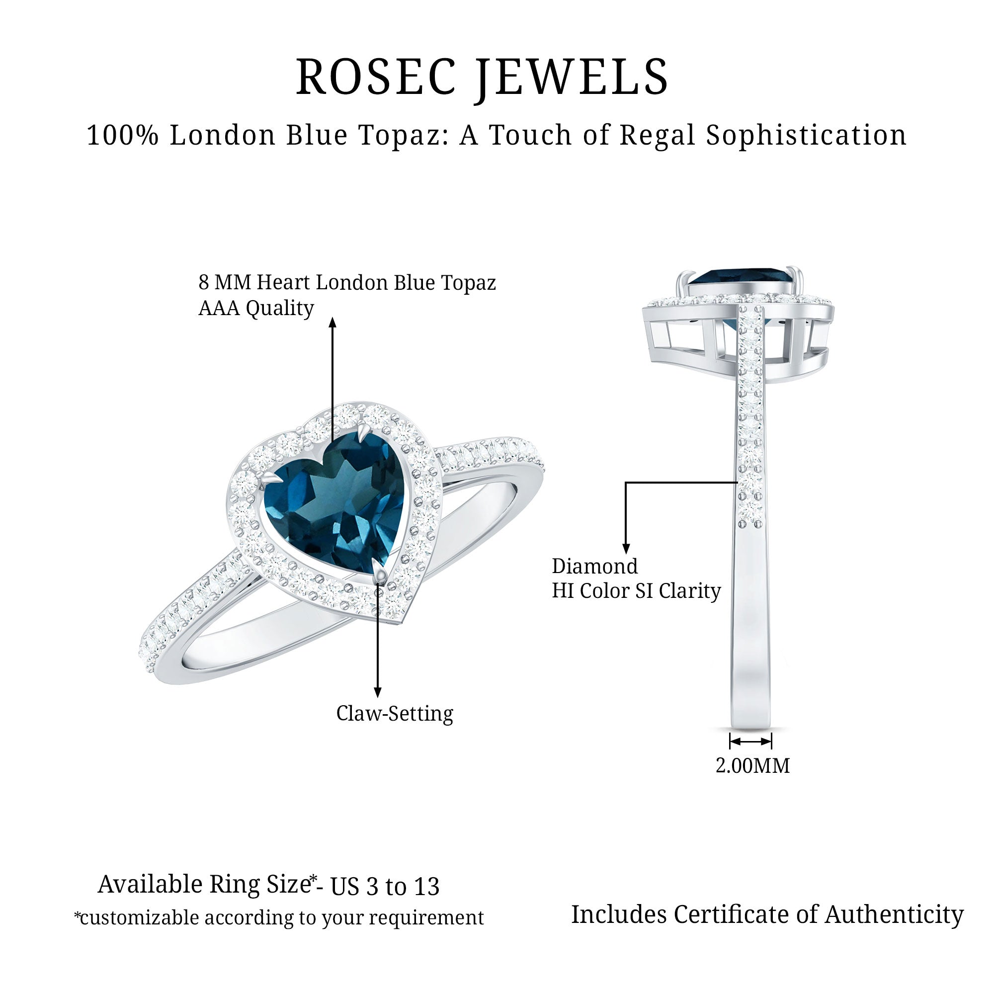 Say it straight from the heart with this lovely Heart Shaped Engagement Ring, made for moments you will never forget. At the center is an 8 MM heart shaped London Blue Topaz, set securely in claw setting. A sparkling diamond halo surrounds the center stone, adding just the right amount of shine without taking away from the beauty of the topaz. The slim band is designed with tiny round diamonds, giving it an elegant sparkle that feels delicate and timeless. This London Blue Topaz and Diamond Engagement Ring is a perfect choice for someone who loves classic styles with a modern twist. Whether you are planning to pop the question or just want to give her a ring that shows how much she means to you, this London Blue Topaz Heart Ring brings a sweet mix of beauty and meaning. It is comfortable for daily wear, but special enough to mark a big moment. The heart shape says it all, love, commitment, and a future together. Made with AAA quality blue topaz and HI-SI quality diamonds and careful attention to detail, this Heart Engagement Ring is more than just jewelry, it is part of your story. It comes packed in a beautiful jewelry box, ready for gifting or that unforgettable YES moment.