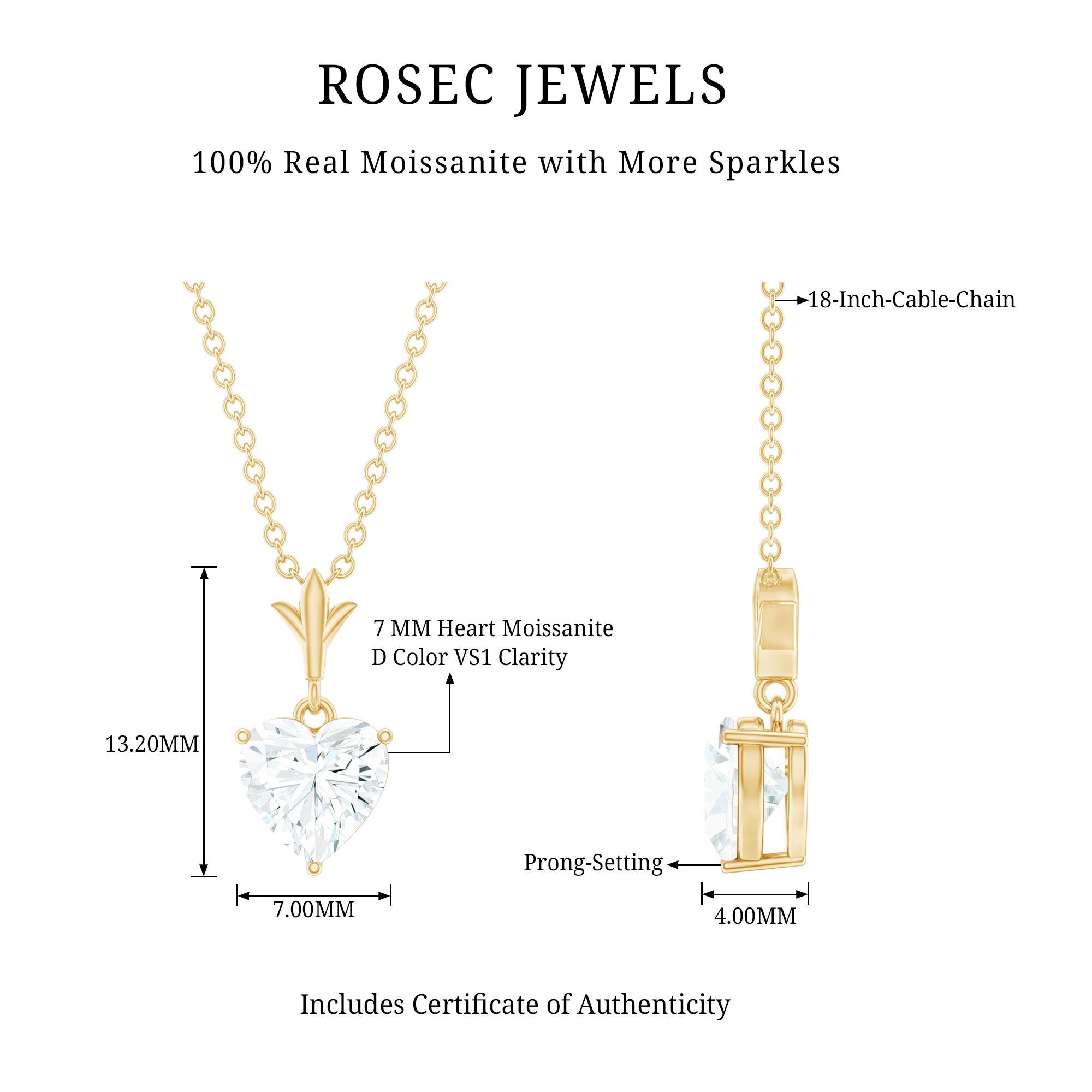 Add a touch of sparkle to your everyday look with our Moissanite Heart Necklace, made from 14k yellow gold plated silver that beautifully combines timeless romance with modern artistry. At the heart of this elegant piece is a dazzling 7 MM heart shaped moissanite, rated D color and VS1 clarity, skillfully cut to reflect light with incredible fire and brilliance. Set in prong setting, the gemstone shines effortlessly, embodying heartfelt emotion with every glance. Designed for both lasting impact and daily wear, this Heart Pendant Necklace is a meaningful keepsake. Whether you wear it as a daily reminder of love or save it for special occasions, its romantic shape and polished finish make it a versatile addition to any outfit. The Solitaire Heart Necklace hangs beautifully from a delicate, adjustable chain, ensuring the perfect fit whether you wear it alone or layered with other pieces. Thoughtfully presented in an elegant jewelry box, it is ready to be a treasured gift. Whether you are celebrating Valentine’s Day, a romantic anniversary, a birthday, or simply honoring self-love or friendship, this Solitaire Moissanite Necklace is a wonderful gesture. A true solitaire statement, it brings joy with every wear, the kind of piece that garners compliments, sparks smiles, and makes you feel wonderfully appreciated.