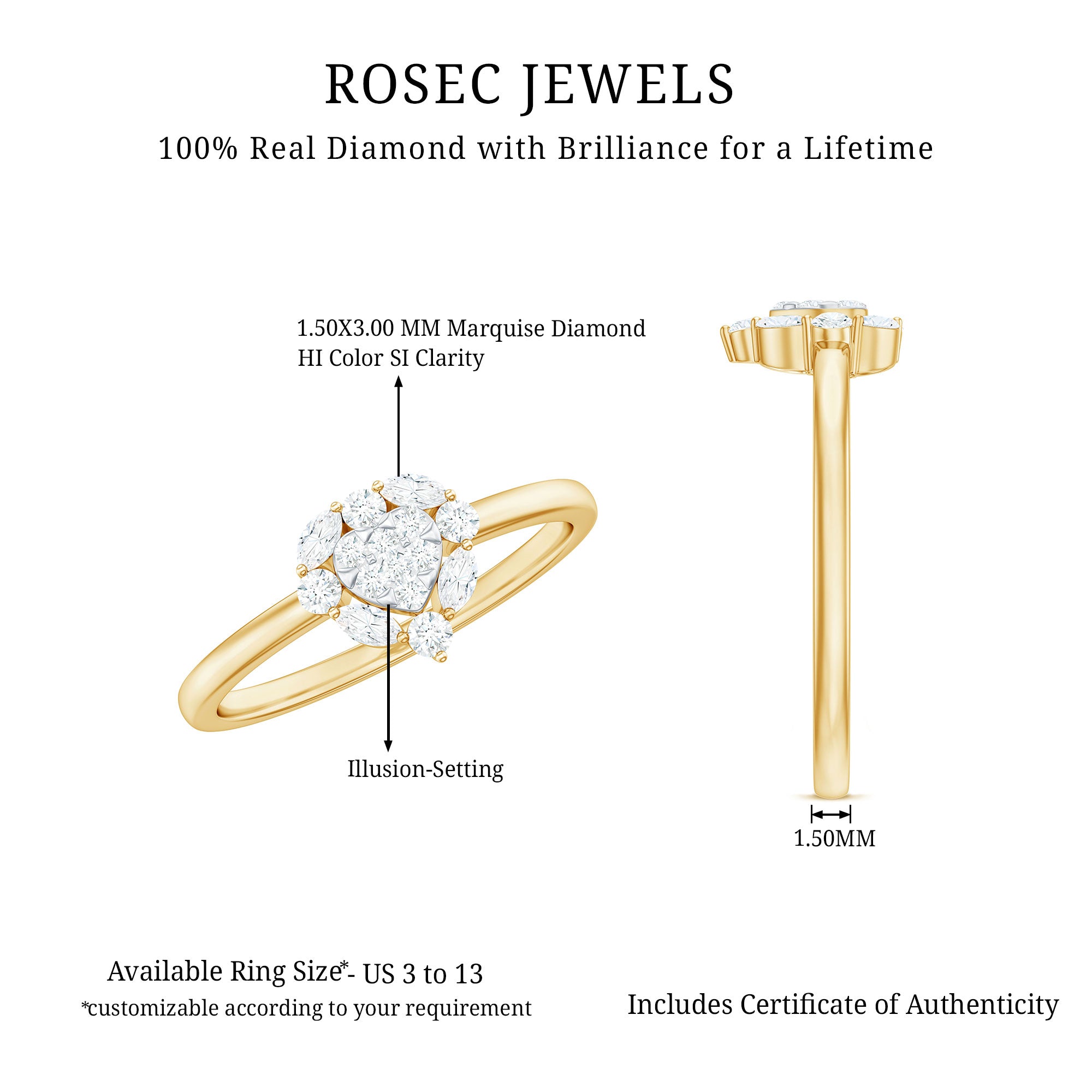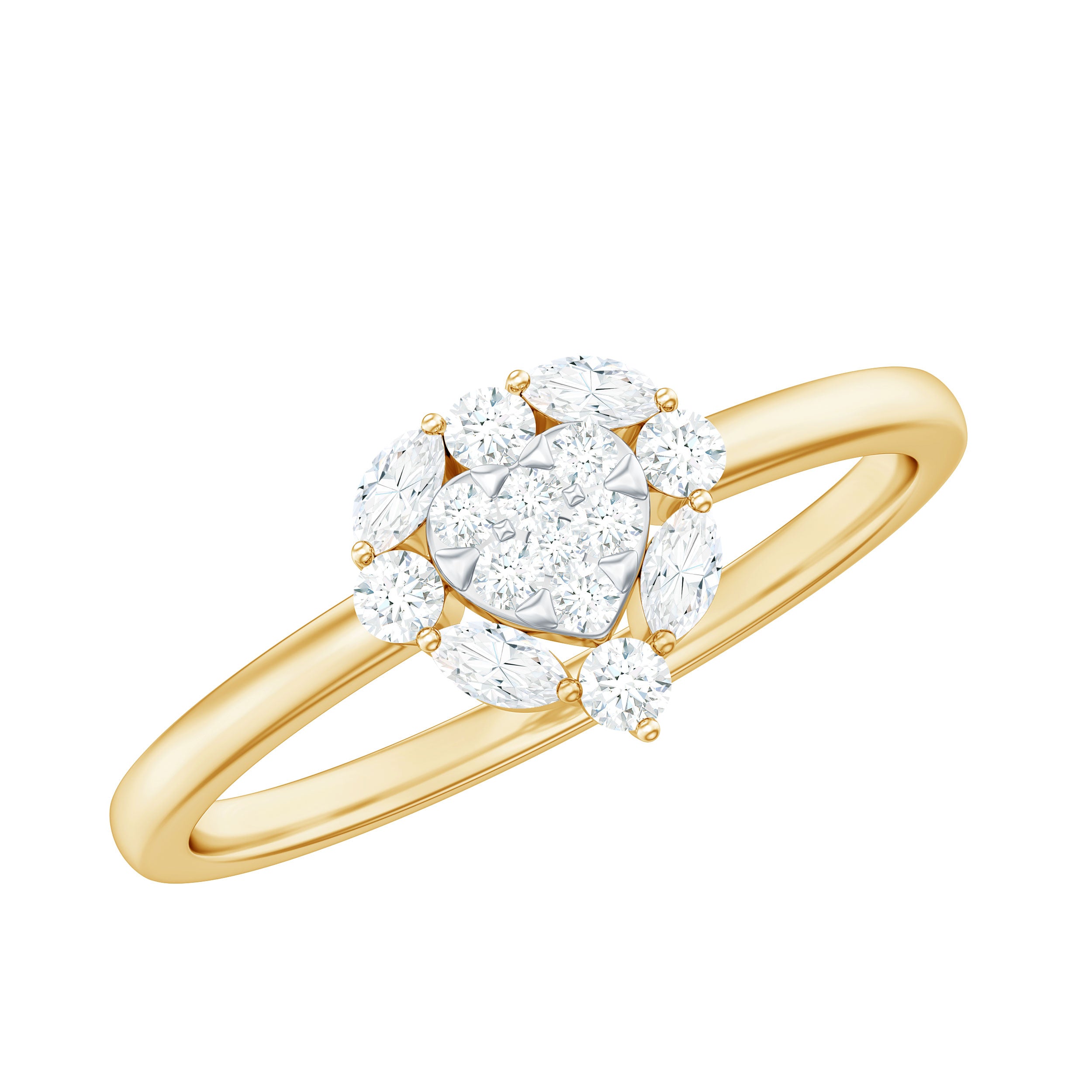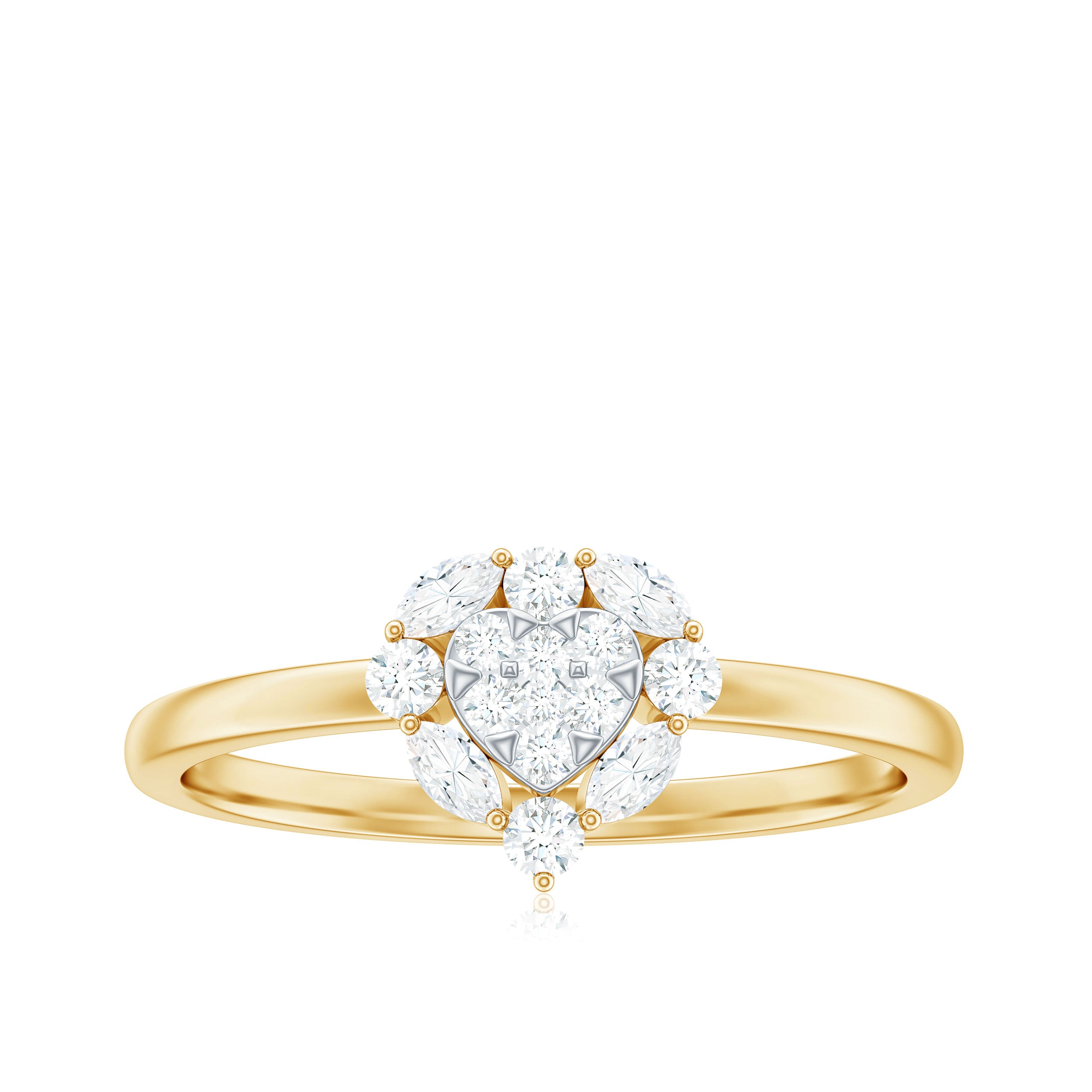 A pure magic on her finger, this Diamond Promise Ring is a show-stopping accessory that lets you embark on a new journey. This Heart Ring promises an endless, dazzling adventure while holding a delightful secret. As a beautiful Illusion Setting, a Diamond on a Heart Shape is a grandeur for the love that already feels boundless. To adorn this Heart Shape Ring are the Round brilliant cut Diamond Halo, accentuating the unique heart frame. As a testament to the idea of togetherness, which is a dazzling promise of your ever-expanding love. This Diamond Cluster Ring reflects the grand scale of your affection and the beautiful, growing future you envision together. It is meticulously crafted to capture every glimmer of light and every beating moment of your devotion. Let the timeless beauty of this ring symbolize your everlasting love and affection. Beyond what meets the eye is the promise, which is as big as your heart. The magic of a magnified love is perfectly promised to make its heart shimmer even brighter.