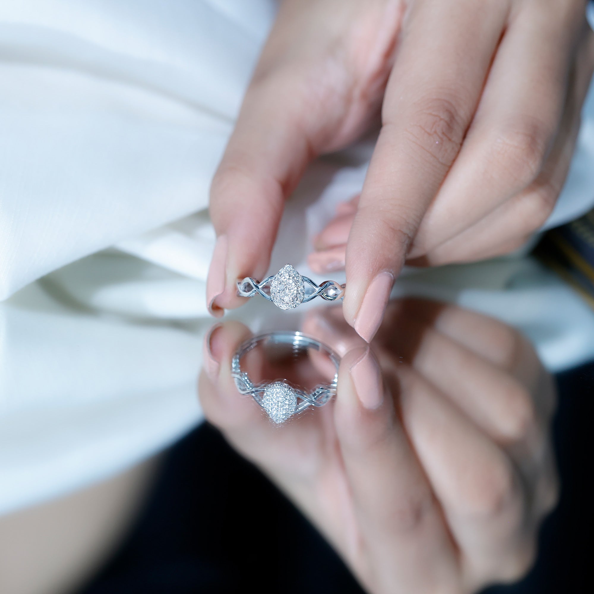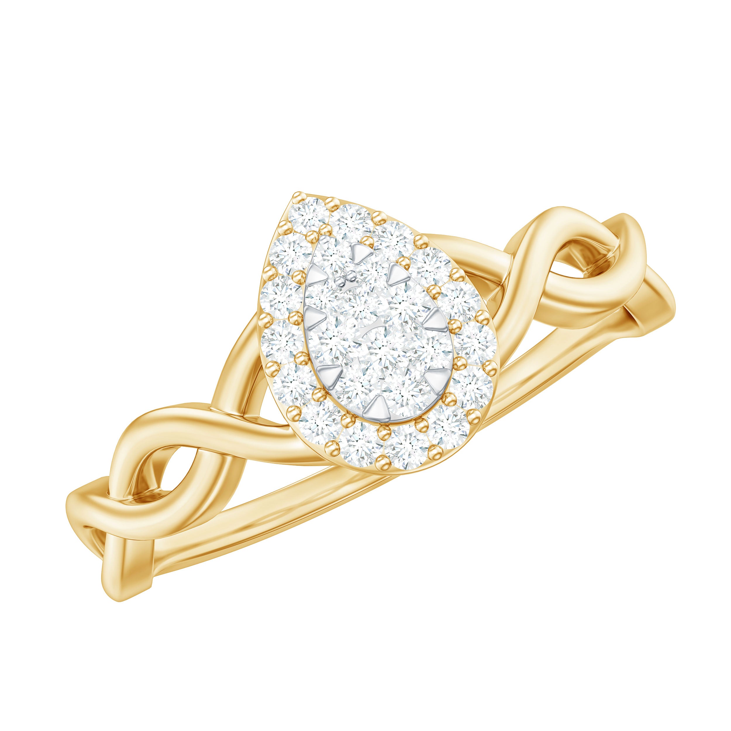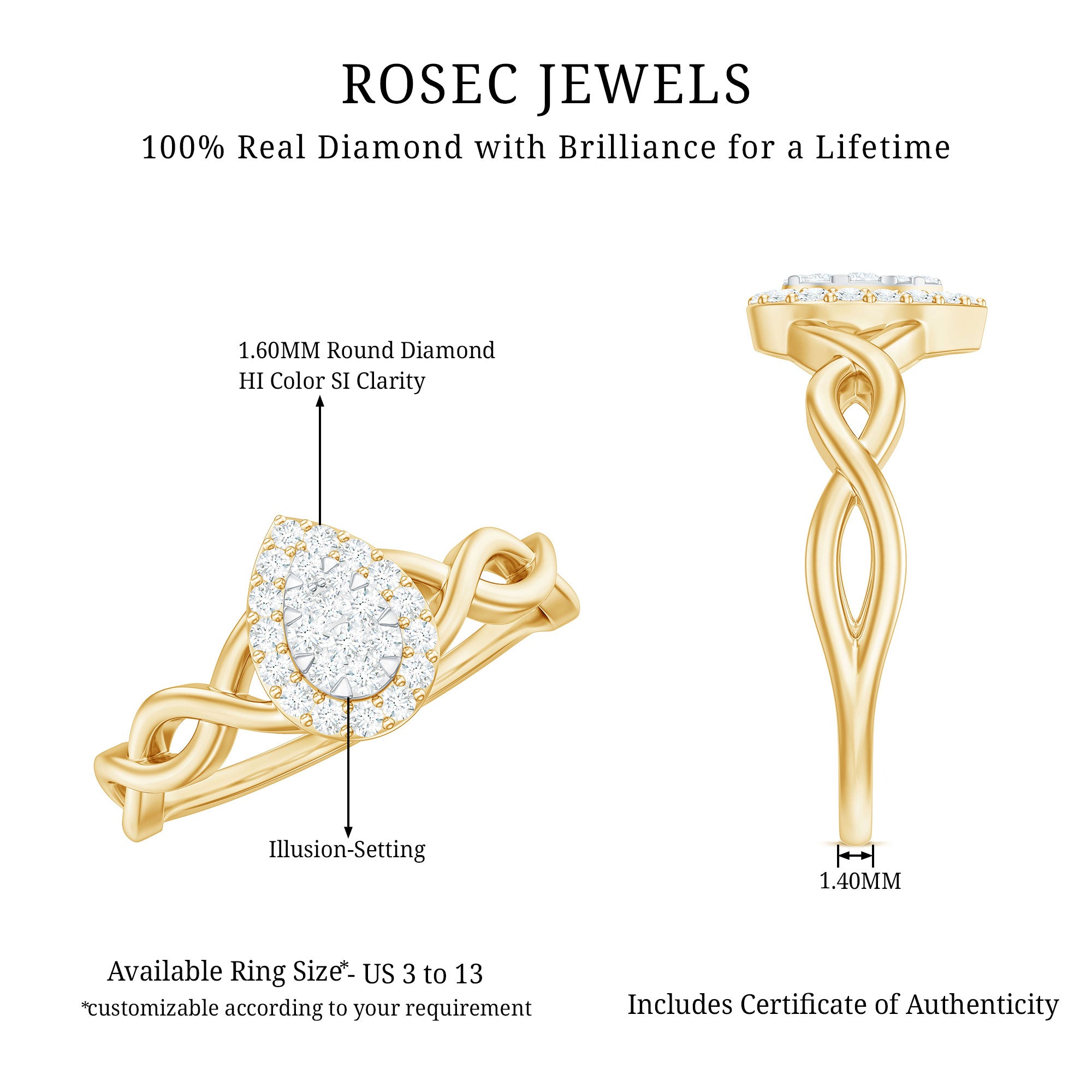 As a beautiful journey of love and commitment, this Diamond Engagement Ring symbolizes a unique love story. The distinct and graceful gemstone radiates the undeniable charm, which is designed to celebrate your one-of-a-kind affection. It is beautifully adorned with Round Shape Diamond in an Illusion Setting, sitting in a teardrop frame. The stunning Halo design also reflects the deep bond between partners. The gorgeous Teardrop Engagement Ring has a Criss Cross shank, representing the everlasting nature of love. Exuding sophistication, it makes you stand out in a crowd. Feminine and romantic, this Halo Engagement Ring has a unique style with the traditional design, which is super sparkly and catches the light with a twist. Elegant and dazzling, this Diamond Crossover Ring takes center stage with a touch of sparkle as a symbol of pure and enduring love, ideal for those with a timeless and refined personality who appreciate the beauty of simplicity. A true classic in every possible way.