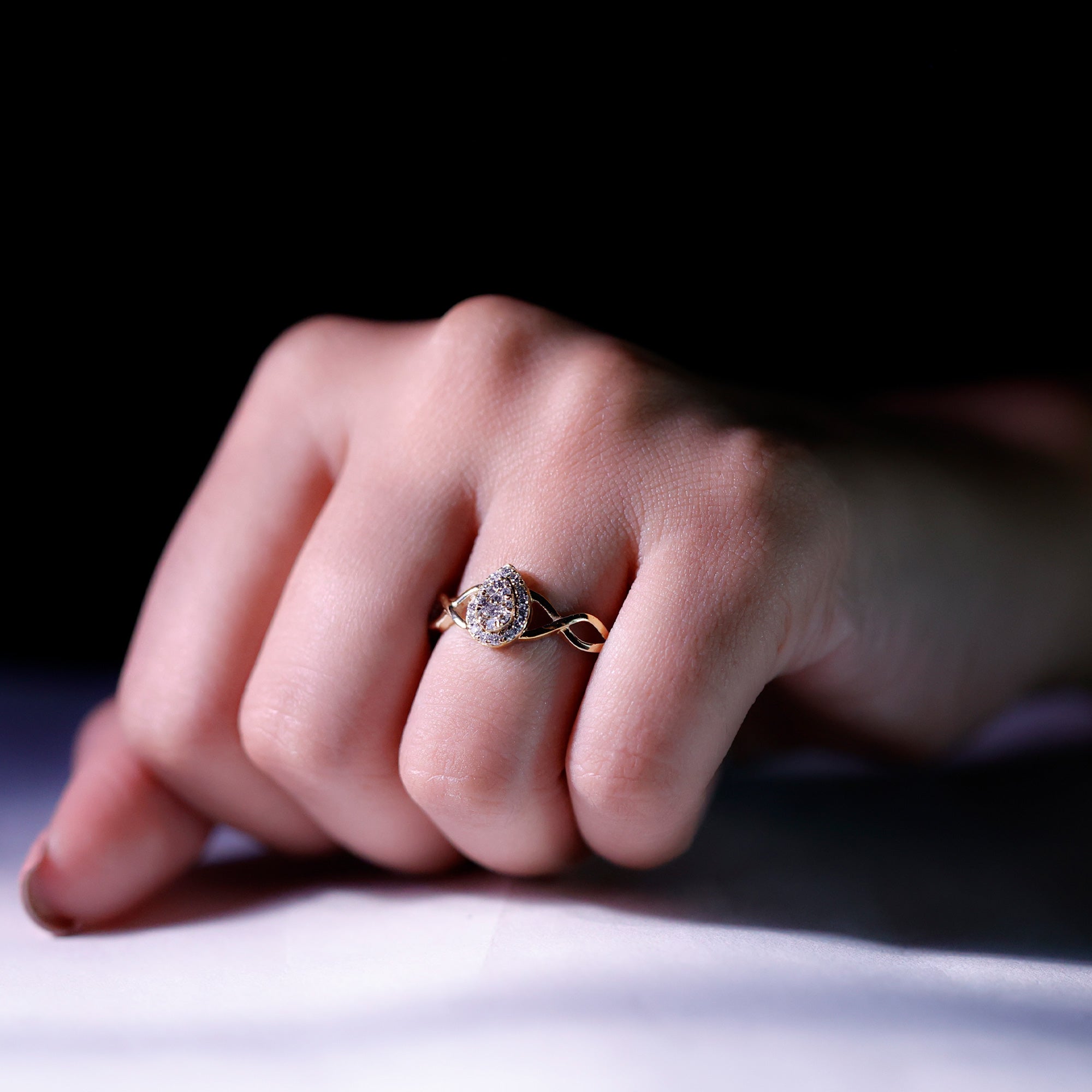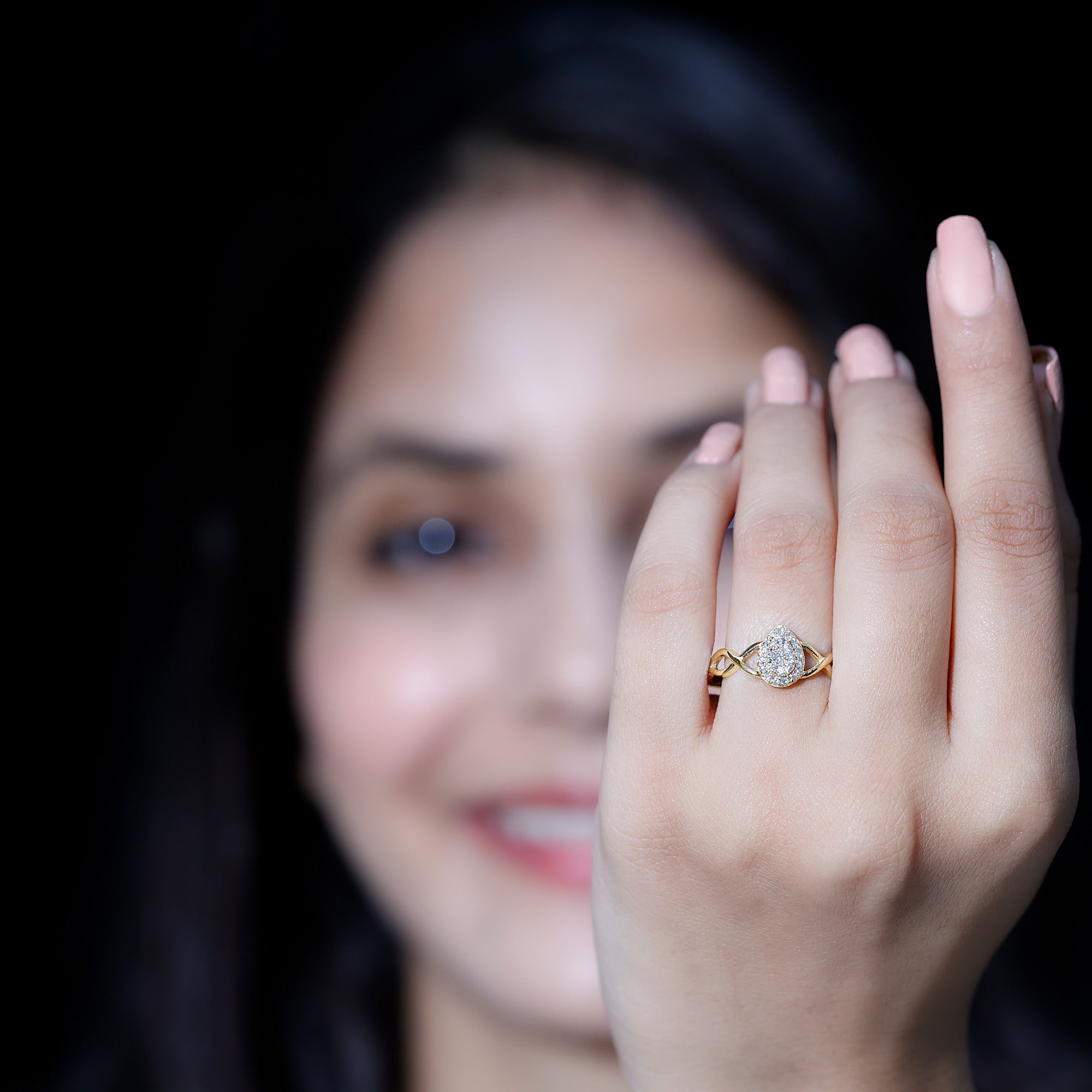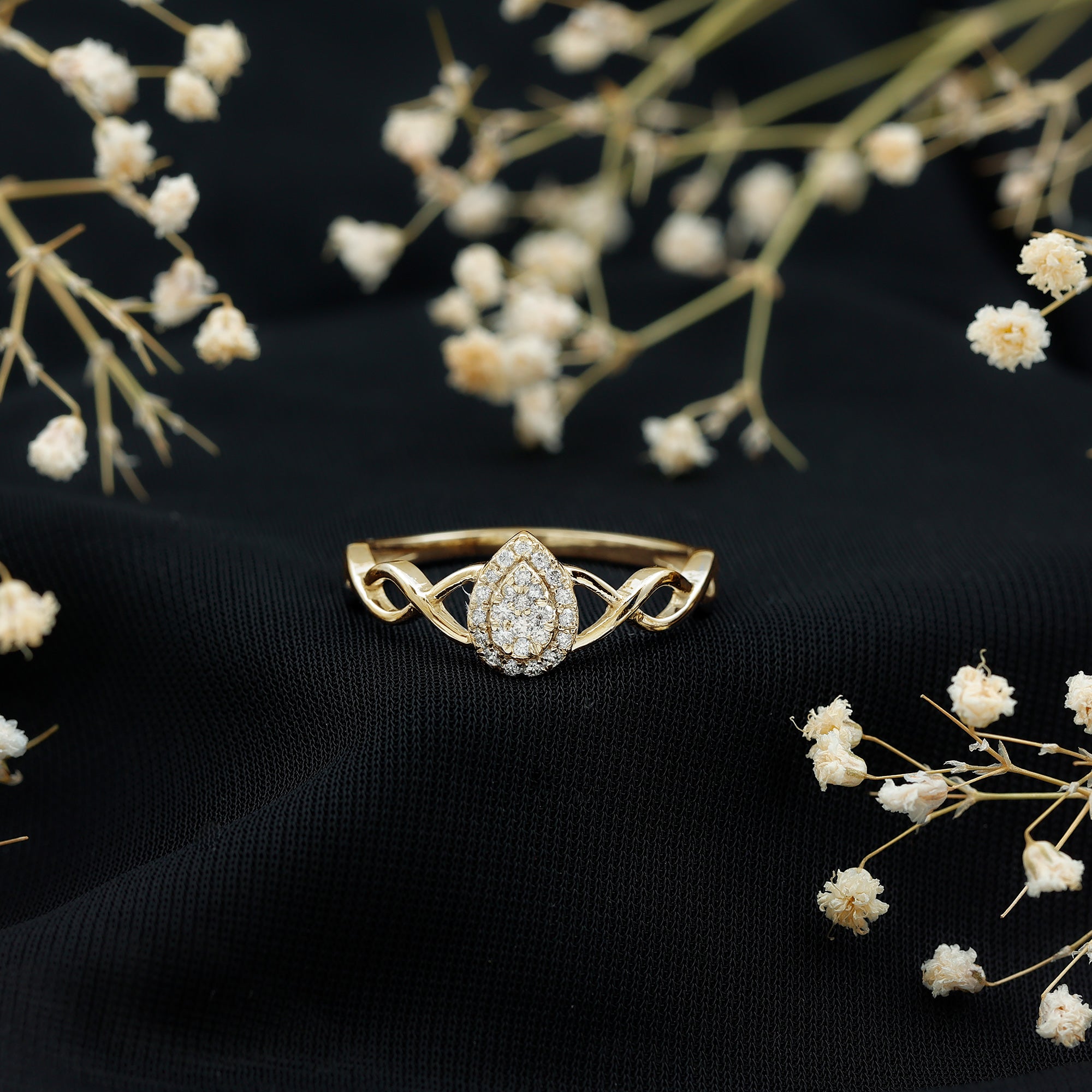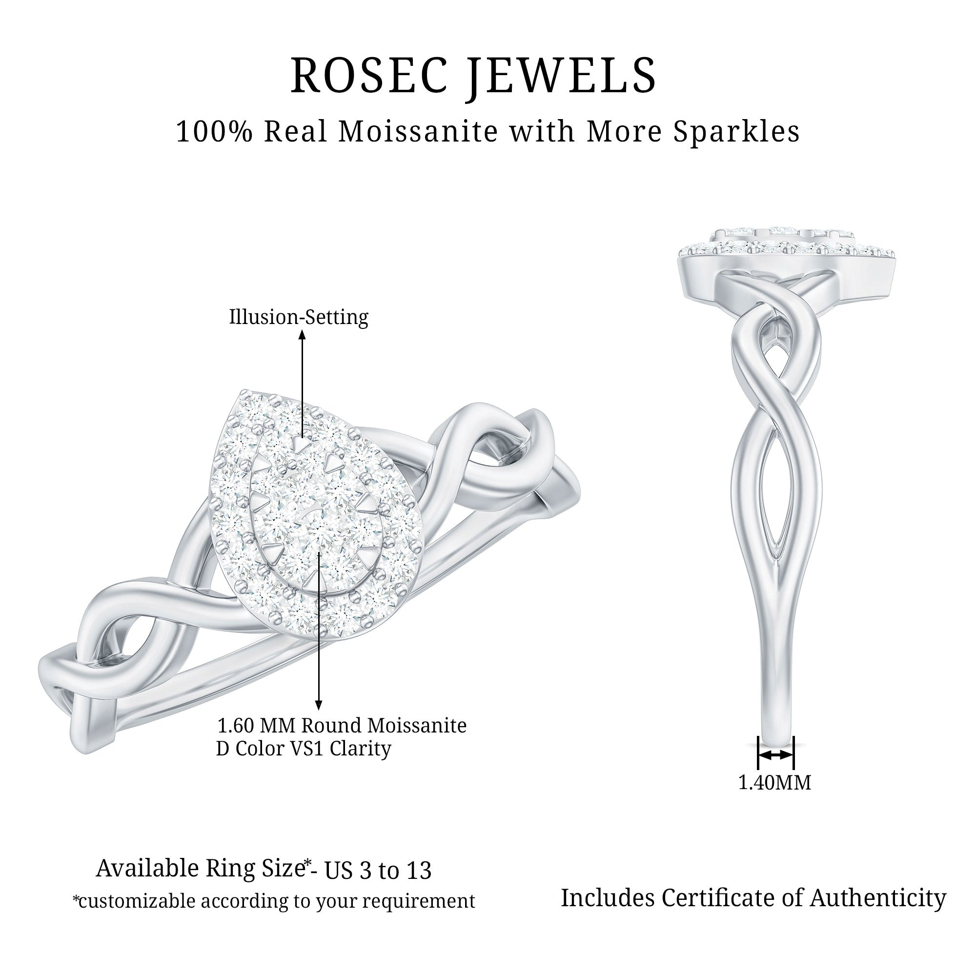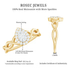 Get this beautiful Crossover Halo Engagement Ring for your special day. This Engagement Ring is adorned with Round Shape Moissanite in the center in an illusion setting with Round Moissanite in a halo setting with a gold crossover shank. This Moissanite Engagement Ring is available in gold metal.