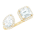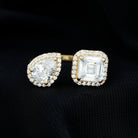 This stylish cuff ring is inspired by Kylie Jenners trendy fashion sense. The ring features two dazzling pear and asscher cut zircon stones set in a unique and modern design with zircon halo. The gold metal cuff adds a touch of elegance and sophistication to the piece, making it perfect for dressing up any outfit. The zircon stones provide a brilliant sparkle that catches the eye and adds a glamorous touch. This cuff ring is perfect for those who love to make a statement with their jewelry, and it is a great choice for adding a touch of elegance and sparkle to any look.