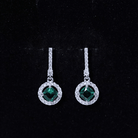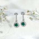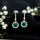 These Lab Grown Emerald Drop Earrings are perfect to be styled on special occasions. These earrings feature a 6 MM Cushion Cut Lab Created Emerald of AAAA Quality placed at the center of circular frame studded with smaller Moissanite Stones of D-VS1 Quality. A gemstone-studded metal bar accentuates these Dangling Earrings, which gives a structured look. These Classic Earrings have screw back closure which keep them on place throughout the day. These Earrings can be presented as a gift to the May-born ladies and to someone who is celebrating their 20th anniversary.