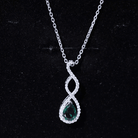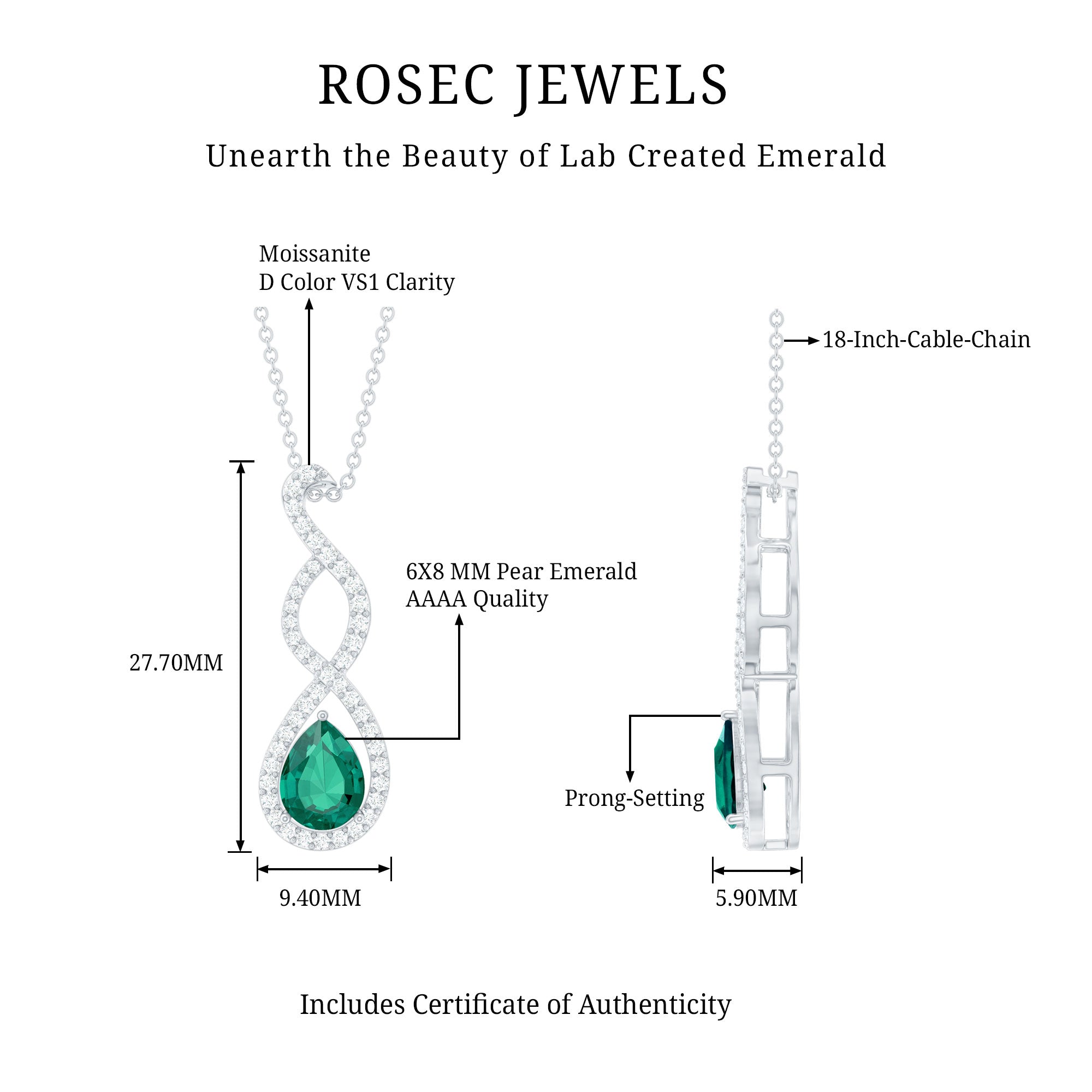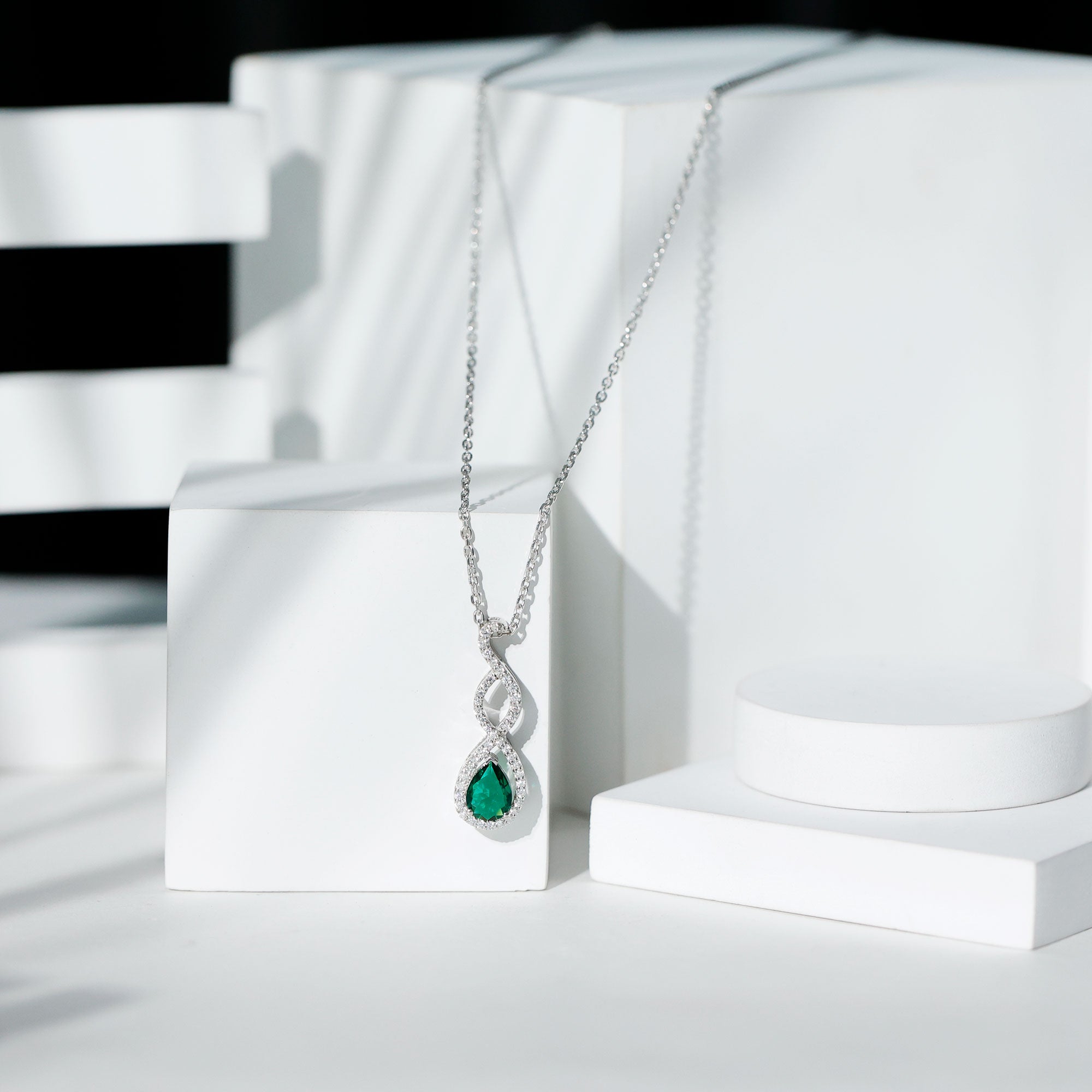 This Infinity Emerald Pendant perfectly combines elegance and shine, giving your outfit a fresh sparkle while adding a hint of sophistication. At the bottom of a gently twisted infinity sign, a 6X8 MM pear-shaped lab-created emerald is securely prong set, representing eternal love. Moissanite accents elevate the design, providing just the right touch of brilliance. This Teardrop Pendant is understated enough for daily wear, yet special enough to be cherished for a lifetime. Incorporate this Lab Created Emerald Necklace into your everyday look and select a piece of jewelry that holds significance for you and remains with you throughout your life. Like a true and everlasting love, it is carefully crafted in 14k white gold plated silver and dangles from a cable chain to reflect a refined style that embodies the essence of romance. This AAAA quality lab created emerald and D-VS1 quality moissanite sparkle from the pendant, making it a standout piece of jewelry. Brighten her day with joy by gifting this Designer Pendant Necklace today.