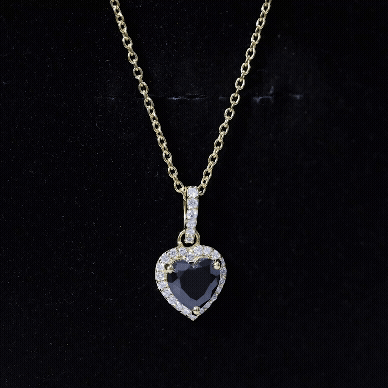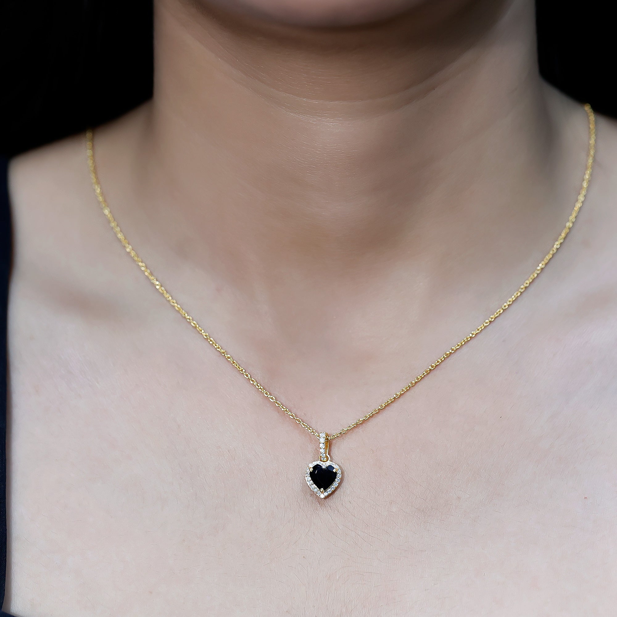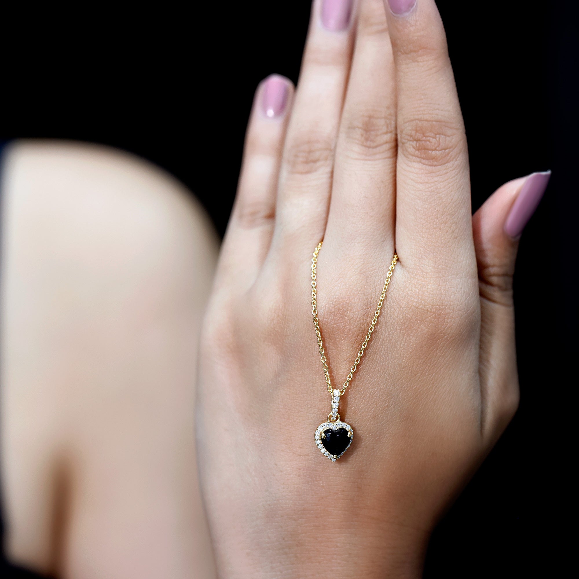 This Black Diamond Heart Necklace is one of those rare finds that speaks softly but powerfully. Crafted with care in 14k yellow gold plated silver, the design blends emotion with elegance in the most beautiful way. At the center lies a 7 MM heart shaped lab grown black diamond, securely set in prong setting. Surrounding it is a graceful lab created white diamond halo, forming a sparkling border that gives a soft contrast and highlights the beauty of the centerpiece. The bail of the Black and White Pendant is also carefully adorned with round lab grown white diamonds, giving it a decorative touch that adds to the charm without overpowering the design. The Heart Pendant Necklace flows effortlessly into a delicate cable chain, sitting just right on the neckline, making it suitable for both everyday elegance and meaningful occasions. It is a thoughtful choice for anniversaries, milestones, or simply as a piece that says what words can not. Set with AAAA quality lab created black diamond and EF-VS quality lab grown white diamonds, every element of this Heart Shape Necklace is selected for brilliance and beauty. It arrives in a signature jewelry box and comes with a certificate of authenticity, making it ready to gift or treasure.