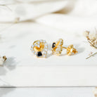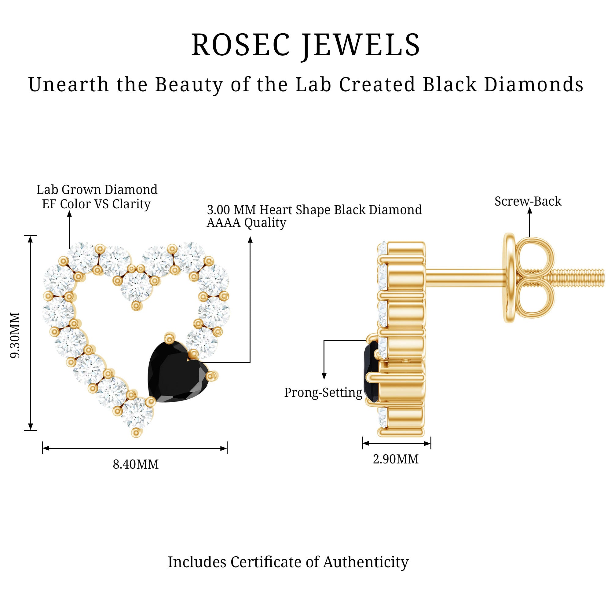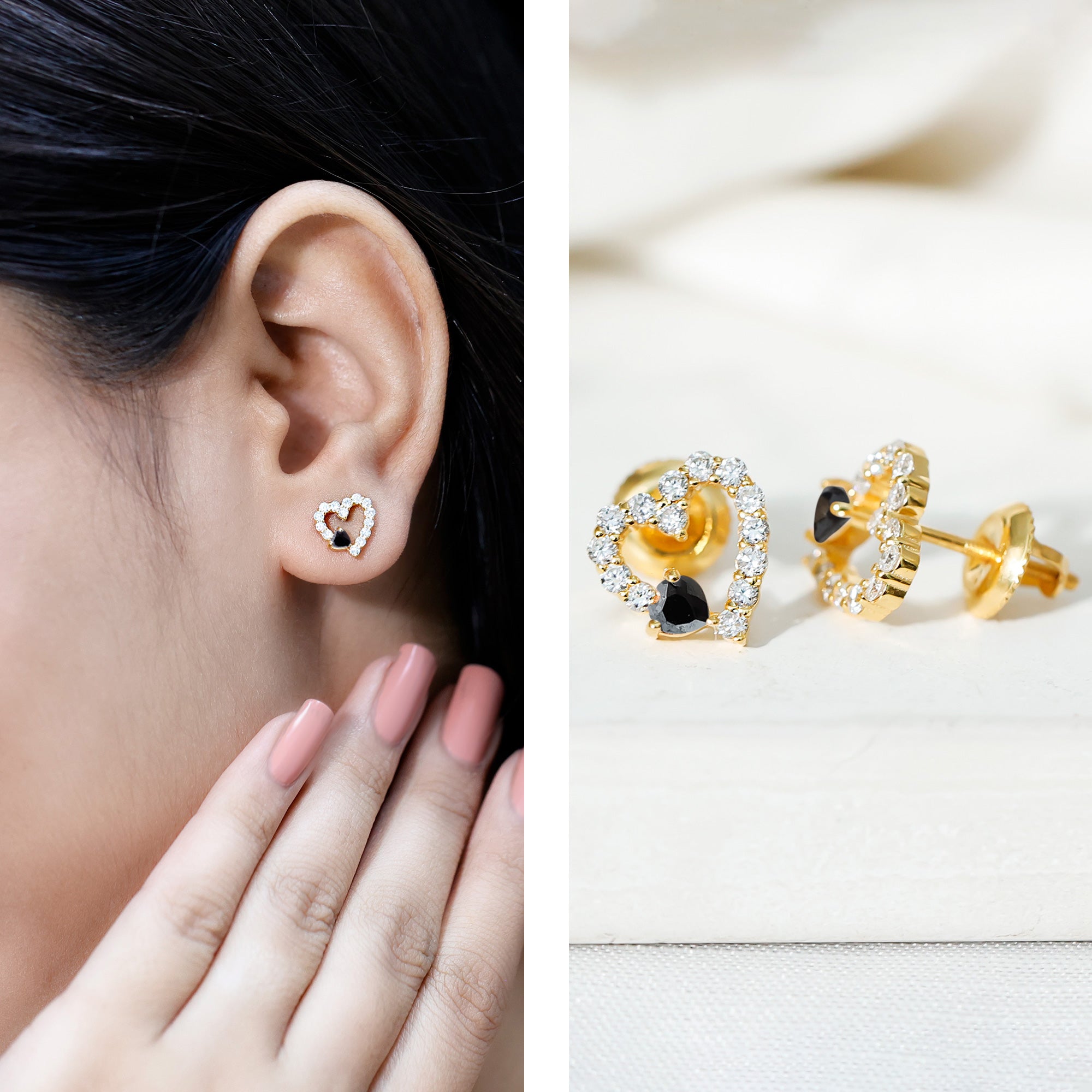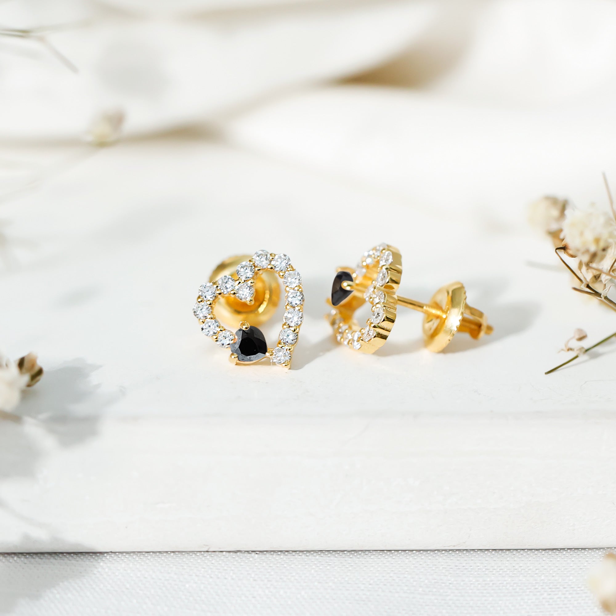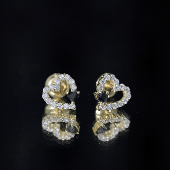 Love takes a bold turn with these stunning Heart Stud Earrings, where passion meets contrast in the most elegant way. Designed in the universal symbol of love, these Open Heart Earrings feature a captivating play between light and dark, crafted to celebrate your story with style and strength. At the base of each heart lies a rich, lab created black diamond, cut into a perfect heart shape and securely nestled in prong setting. Further, the studs are decorated with round cut lab grown white diamonds, creating a perfect shape of an open heart and sparkling like stars in a midnight sky. Expertly crafted in 14K yellow gold plated silver, these Black and White Diamond Earrings are a beautiful balance of luxury and everyday wearability. The high-polish finish complements the sparkle of the stones, while the secure screw back closures ensure they stay comfortably in place all day long, ideal for special occasions or daily elegance. Perfect for anniversaries, birthdays, Valentine’s Day, or just because, they arrive in a premium jewelry box with a certificate of authenticity, ensuring peace of mind with every purchase. Stylish, symbolic, and unforgettable, these Black Diamond Heart Earrings are a little piece of emotion you can wear. A reminder that love can be soft and strong, light and dark, all at once.