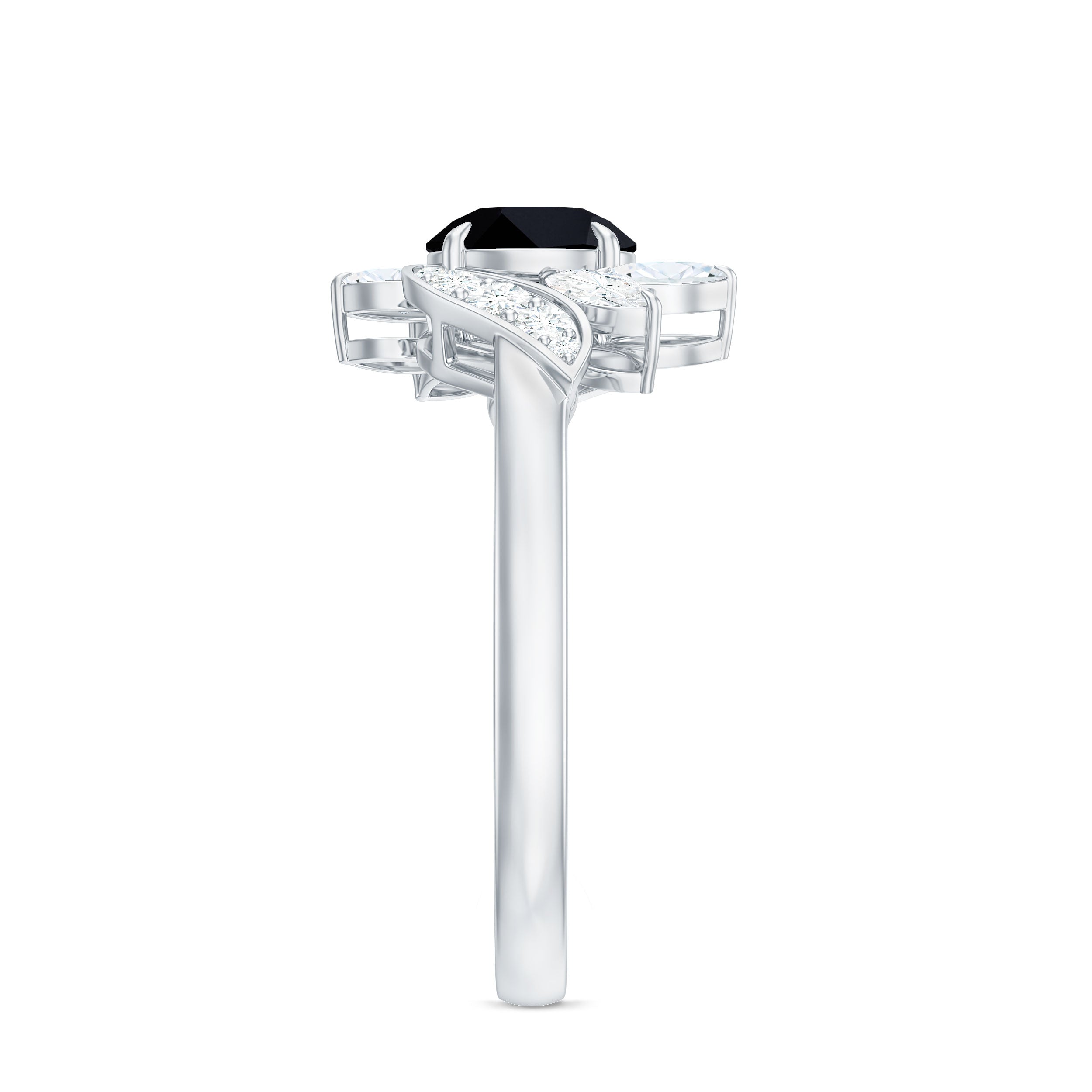 Every moment of yours is worth celebrating, so why not celebrate it with an alluring fine jewelry. This Created Black Diamond Engagement Ring is exactly what your are looking for your partner, Round Created Black Diamond and Marquise Diamond is held in Claw Setting and Round Diamond is held in prong setting are featured in leaf pattern. Show your love to your partner with this Vintage Created Black Diamond Ring.