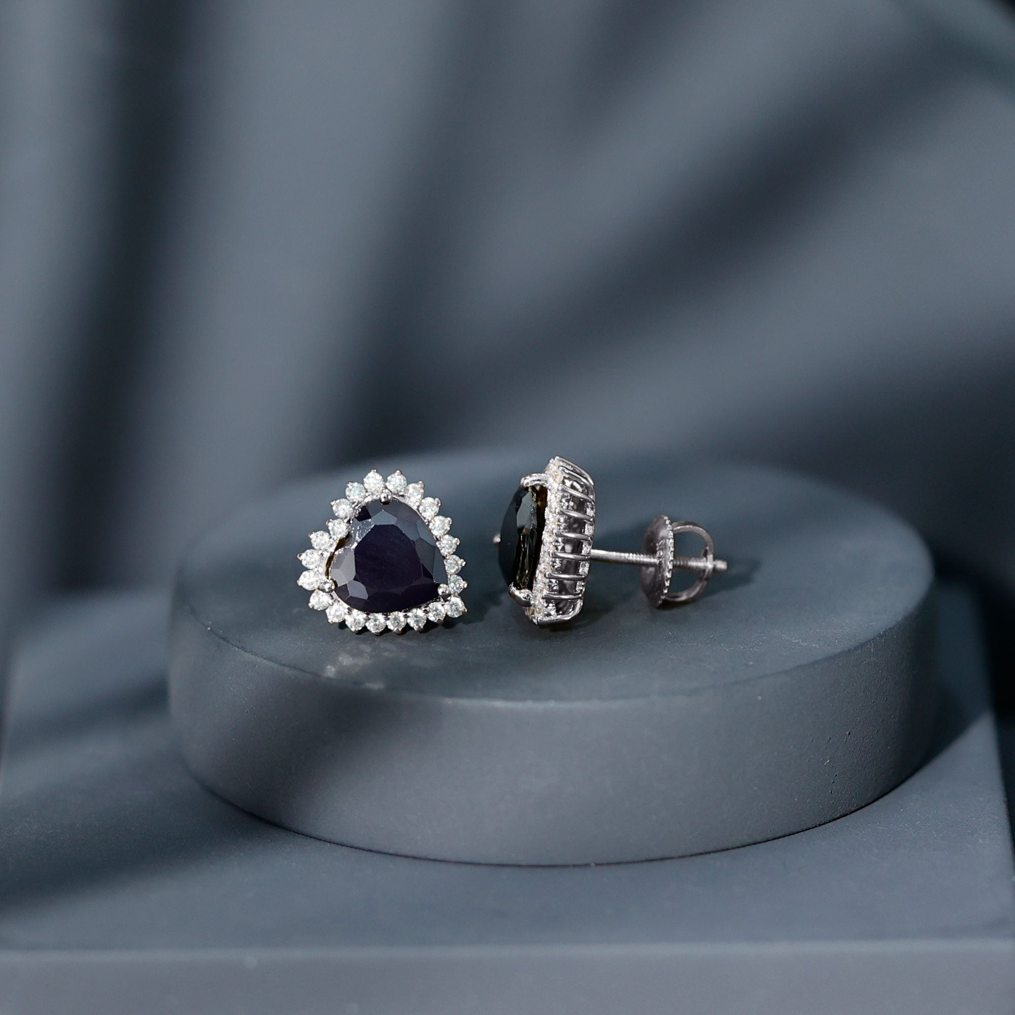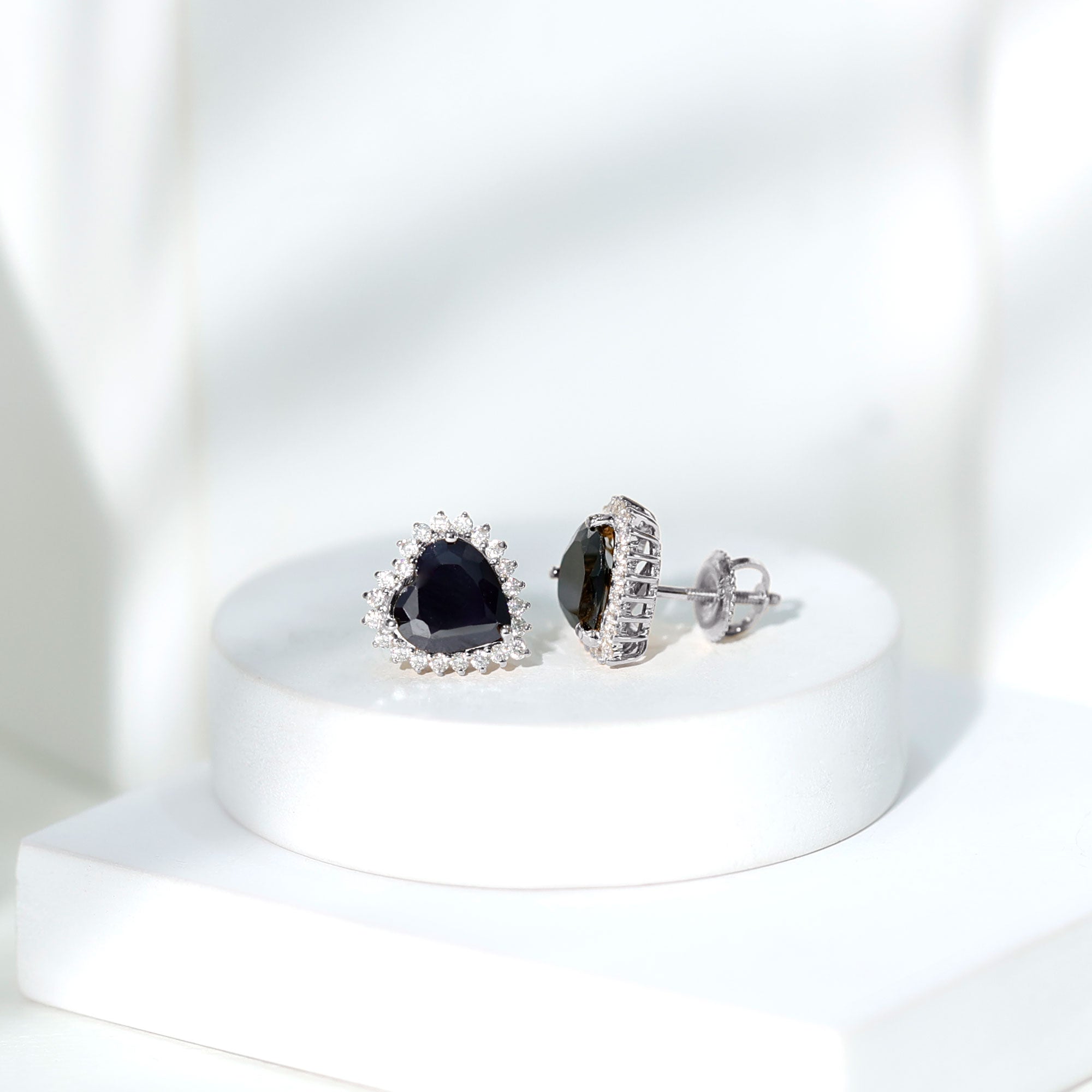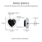 Experience the beauty of our Black Diamond Heart Earrings, showcasing an 8 mm heart-shaped lab-created black diamond held in prong setting encircled by round-shaped moissanite, exhibiting sparkling allure. Illuminate your style with these heart earrings exquisitely adorned with screw-back closures, so you can go from day to night with ease and comfort. The black diamond studs are a perfect blend of timeless grace and sophistication. From date nights to evening parties, flaunt these elegant black studs every time you go out, heads will turn, and make your day truly memorable.