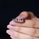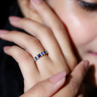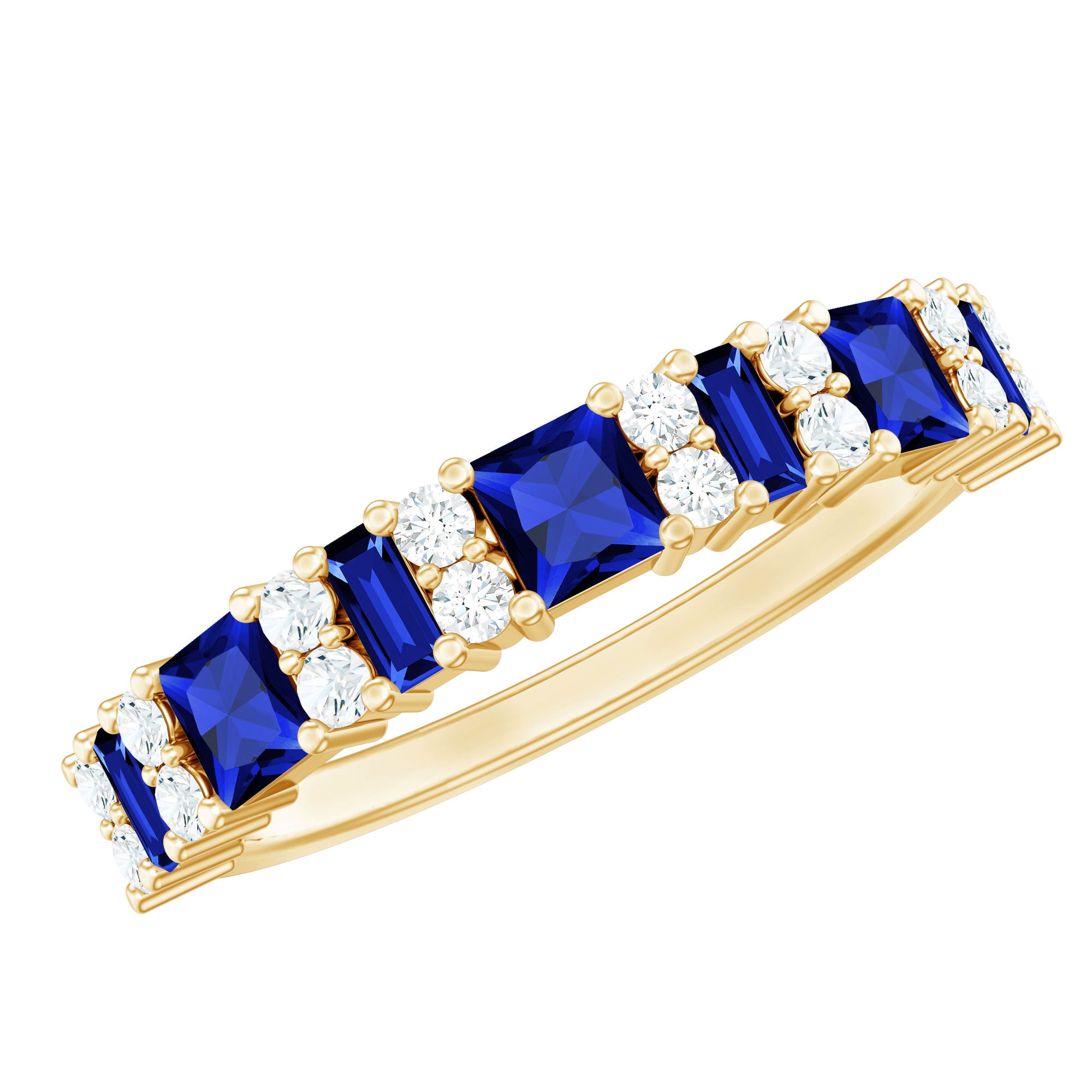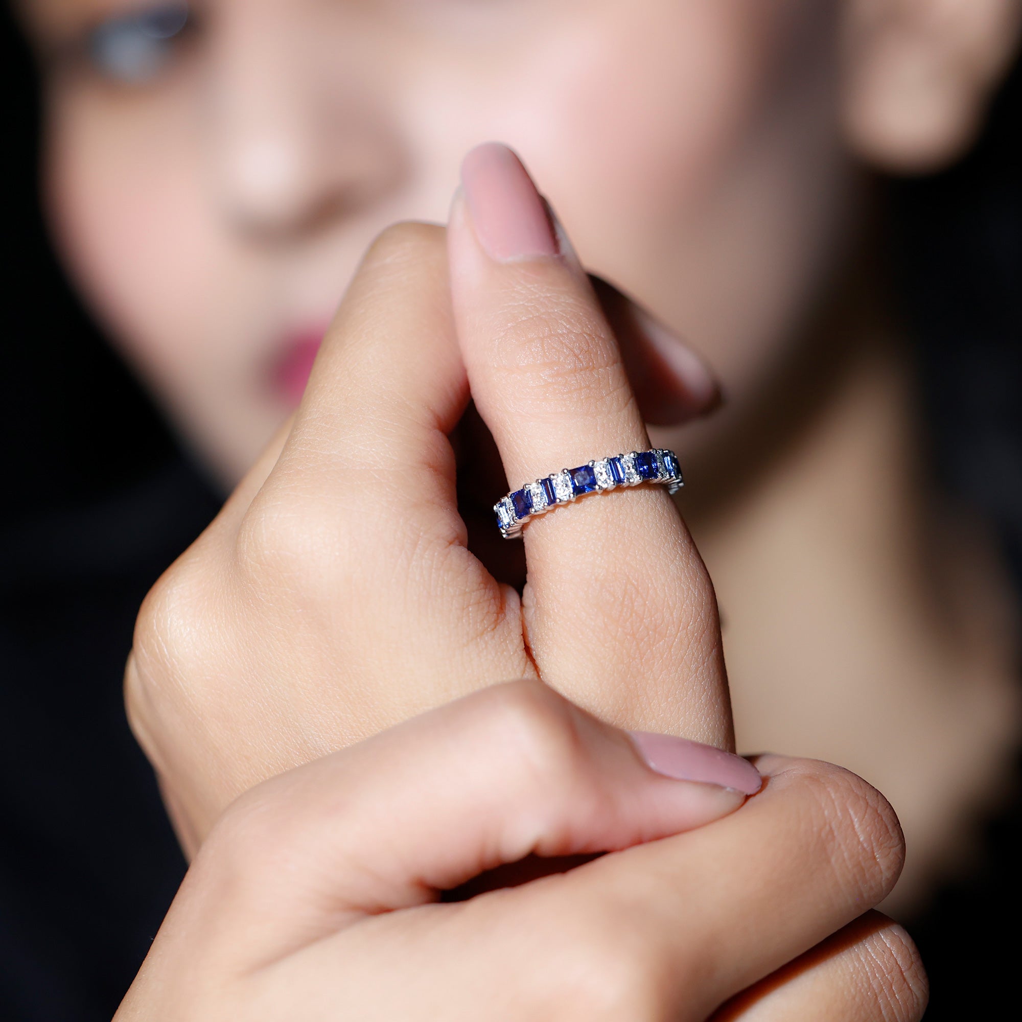 This is a stunning eternity band ring that features a combination of princess and baguette cut lab-created blue sapphire and round Diamond. The eternity ring is crafted with a timeless and sophisticated design that is perfect for any occasion. The created blue sapphire and Diamond are expertly set in prong setting, creating a beautiful and sparkling look that is sure to turn heads.