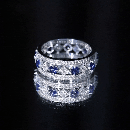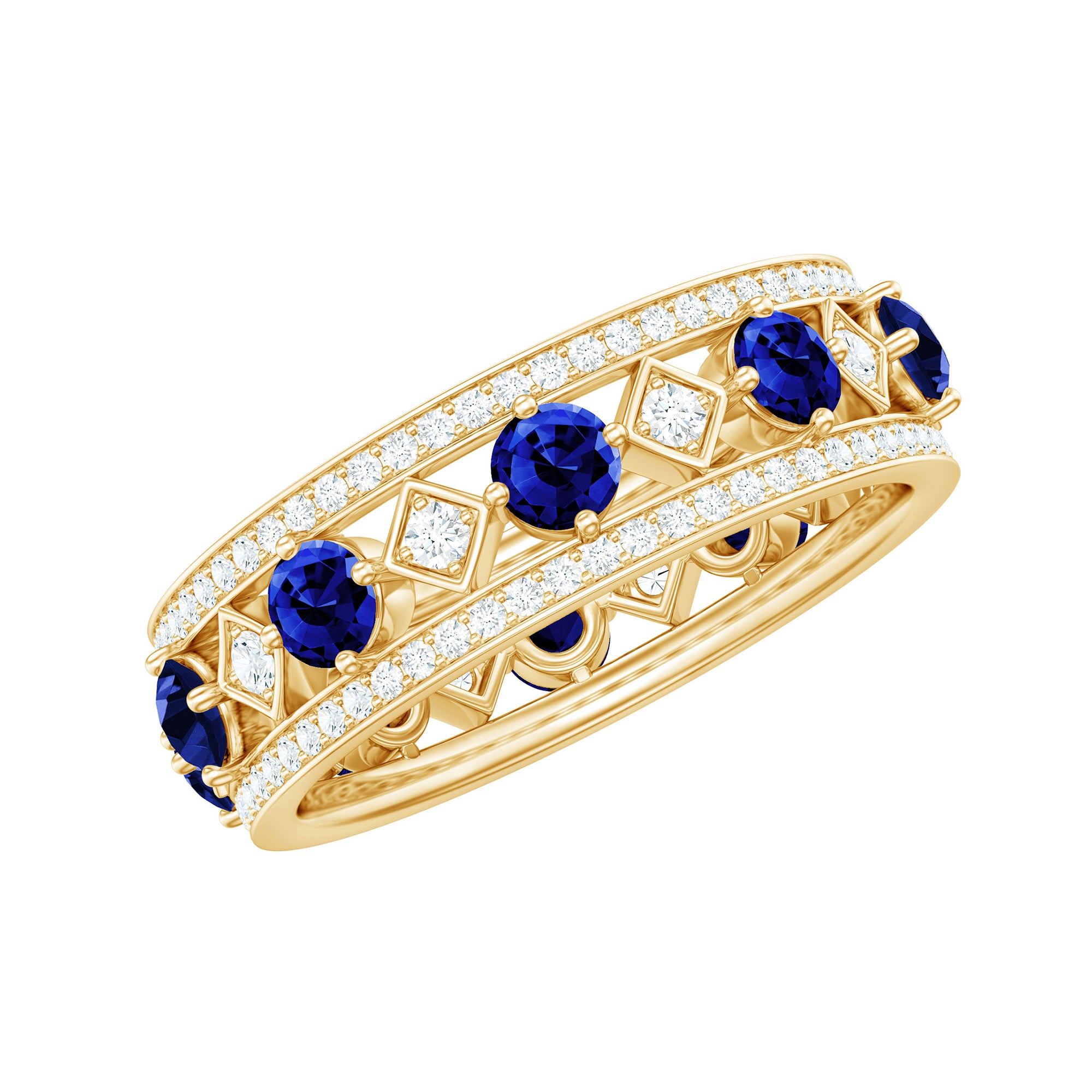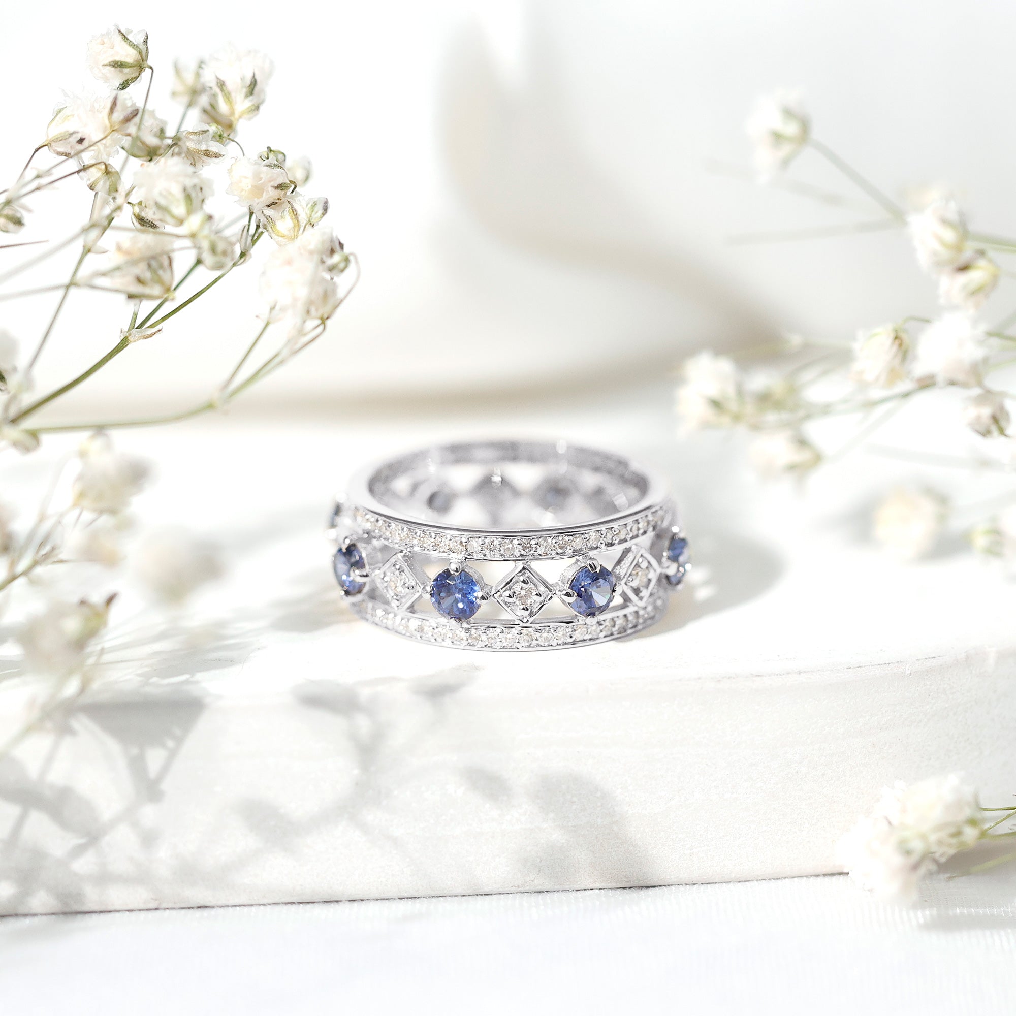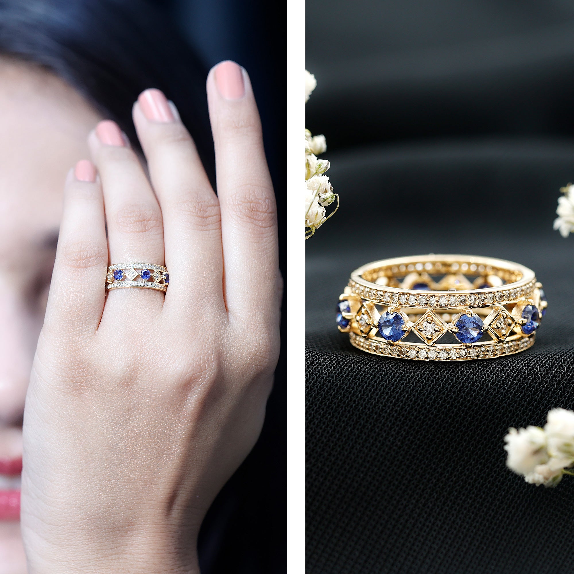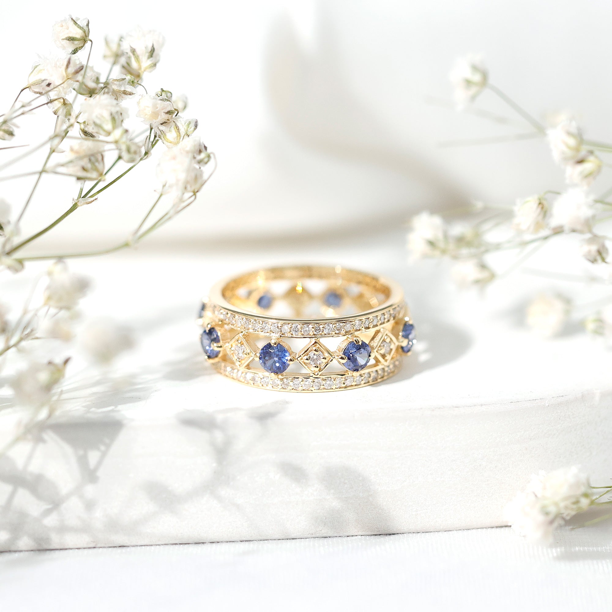 Are you in search of a ring that combines sleekness with a vibrant personality? Allow us to introduce your new favorite: the Lab Created Blue Sapphire Ring, which embodies modern elegance with a hint of luxury. This Full Eternity Ring is distinguished by its striking design, showcasing round shape lab created blue sapphire stones interspersed with dazzling round cut diamonds, all set in an alternating pattern. Whether you seek a distinctive wedding band or a wide band ring to complement your existing collection, this piece is an ideal choice. It boasts a modern aesthetic while offering enough sparkle and boldness to capture attention. Furthermore, the combination of Created Blue Sapphire and diamonds creates a stylish contrast that is both sophisticated and edgy. The Lab grown sapphire stones impart a rich essence, while the diamonds contribute the perfect touch of brilliance. Together, they form a ring that is both understated and elegant, suitable for daily wear or special events. This Created Sapphire and Diamond Ring serves as a testament to your style and self-assurance. Whether you are presenting it as a gift to a loved one or indulging yourself, this Vintage Eternity Band is designed to be worn, cherished, and admired. So why choose the ordinary when you can showcase a band that is both fashionable and entirely unique.