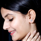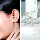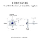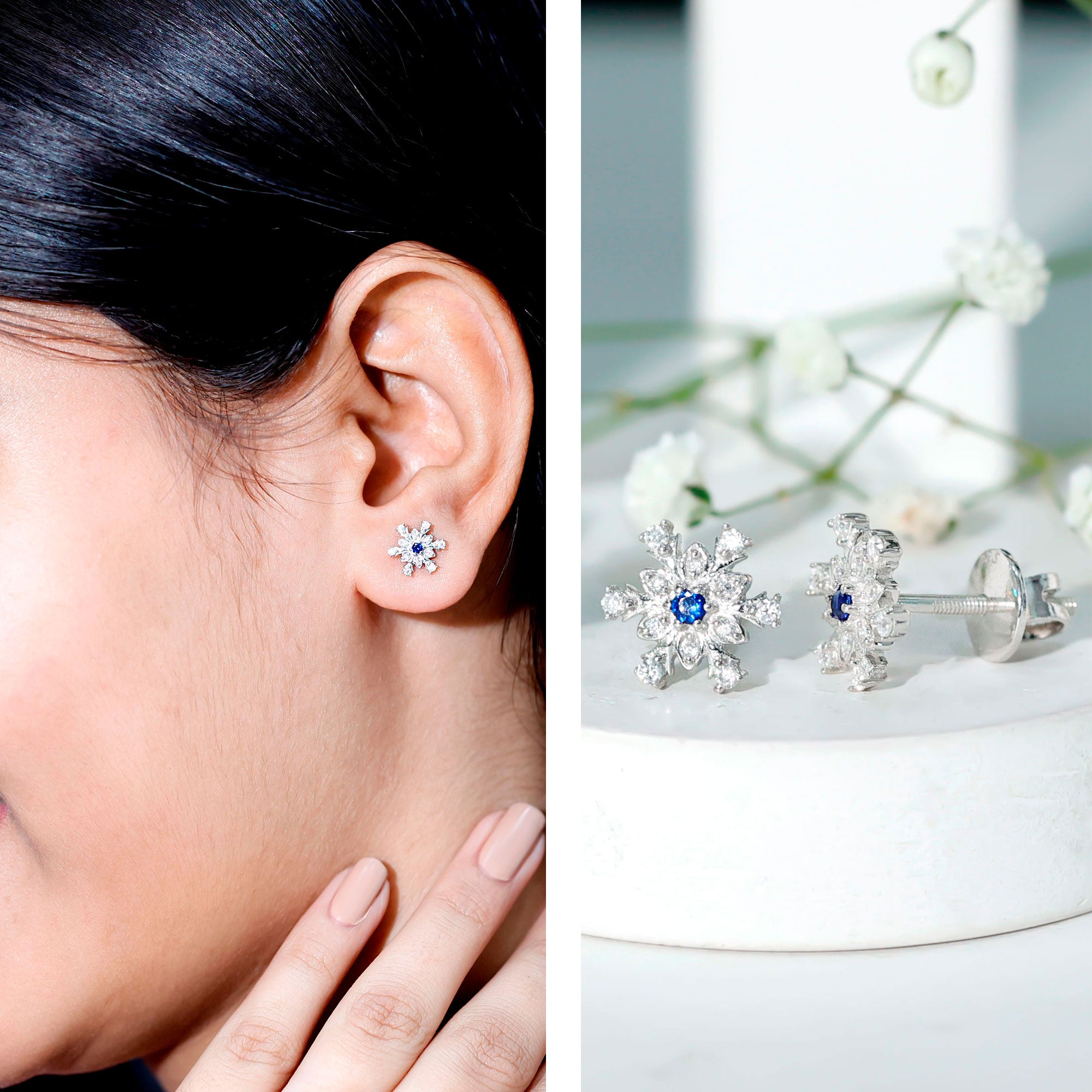 The beauty of winter is compiled in these Lab Cultured Blue Sapphire Earrings, crafted in the design of Snowflake with 14K White Gold Plated Silver. It features a small round shape Lab Grown Blue Sapphire placed at the center of a metallic flower motif decorated with smaller Moissanites. The stud beholds the classic shine of AAAA Quality Lab Made Blue Sapphire and D-VS1 Quality Moissanite embedded in the earring. These Snowflake Stud Earrings will complete your Christmas party look. Pair them with your winter outfit and feel the vibes of being a snow queen. These Earrings with Screw on Backs will stay in place throughout the day.