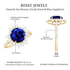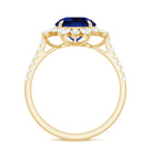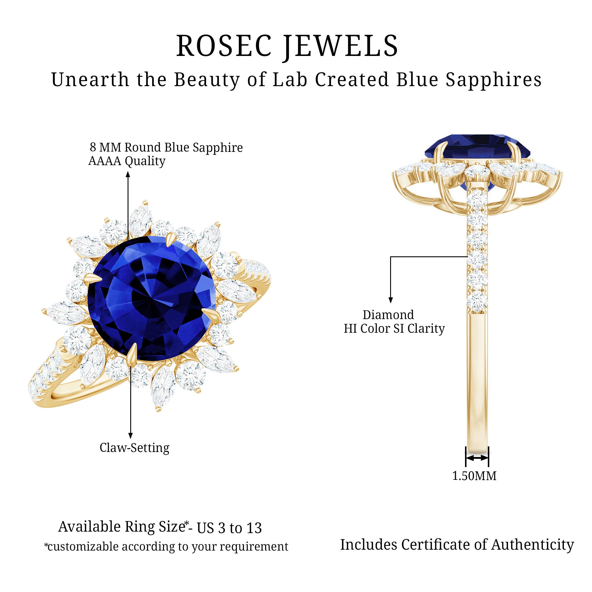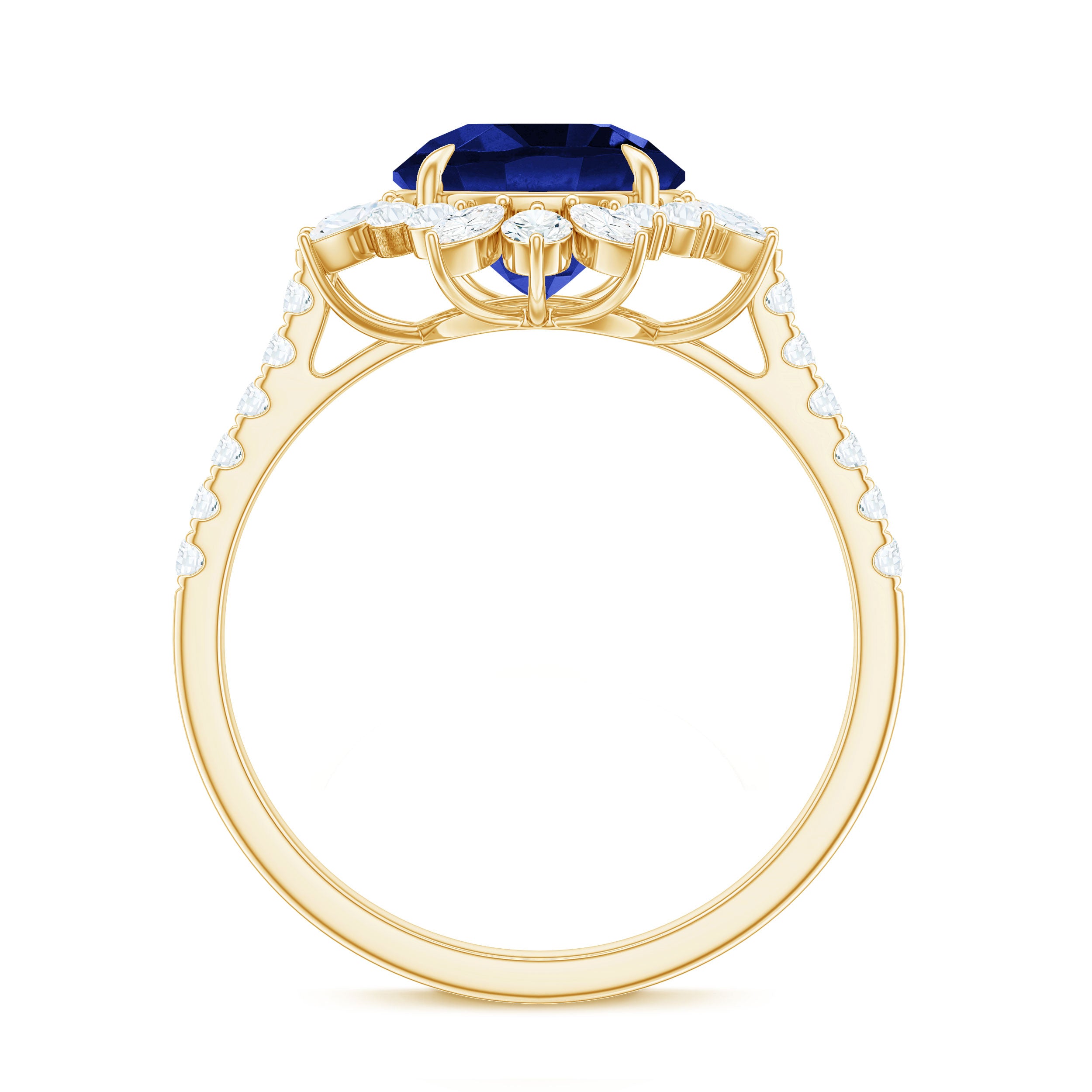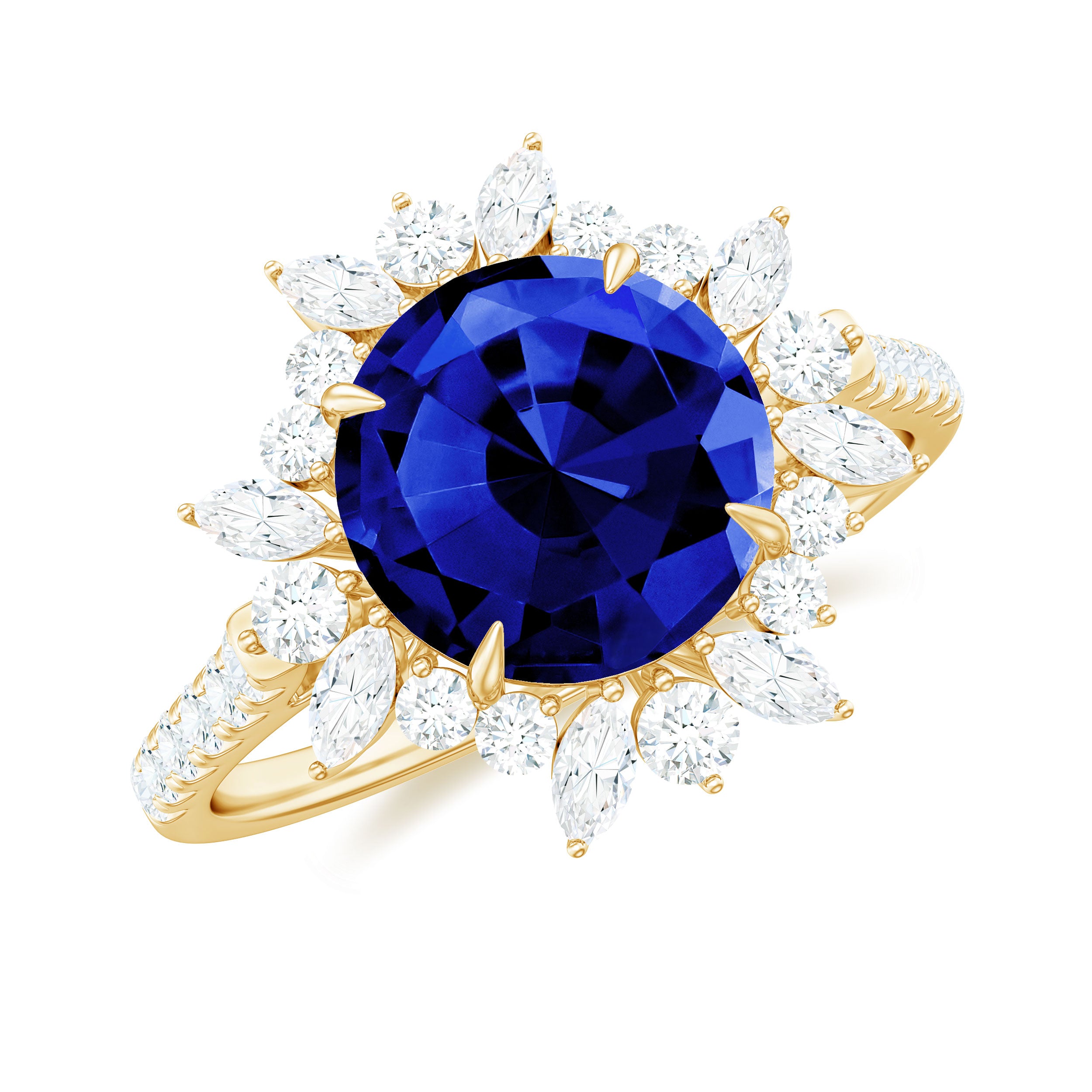 This Lab Created Blue Sapphire and Diamond Ring is charming and enchanting. It features a Round Shape Lab Created Blue Sapphire surrounded by a Diamond floral halo. Made from Gold, this cocktail ring is a magnificent piece of jewelry that will complement your outfit perfectly.