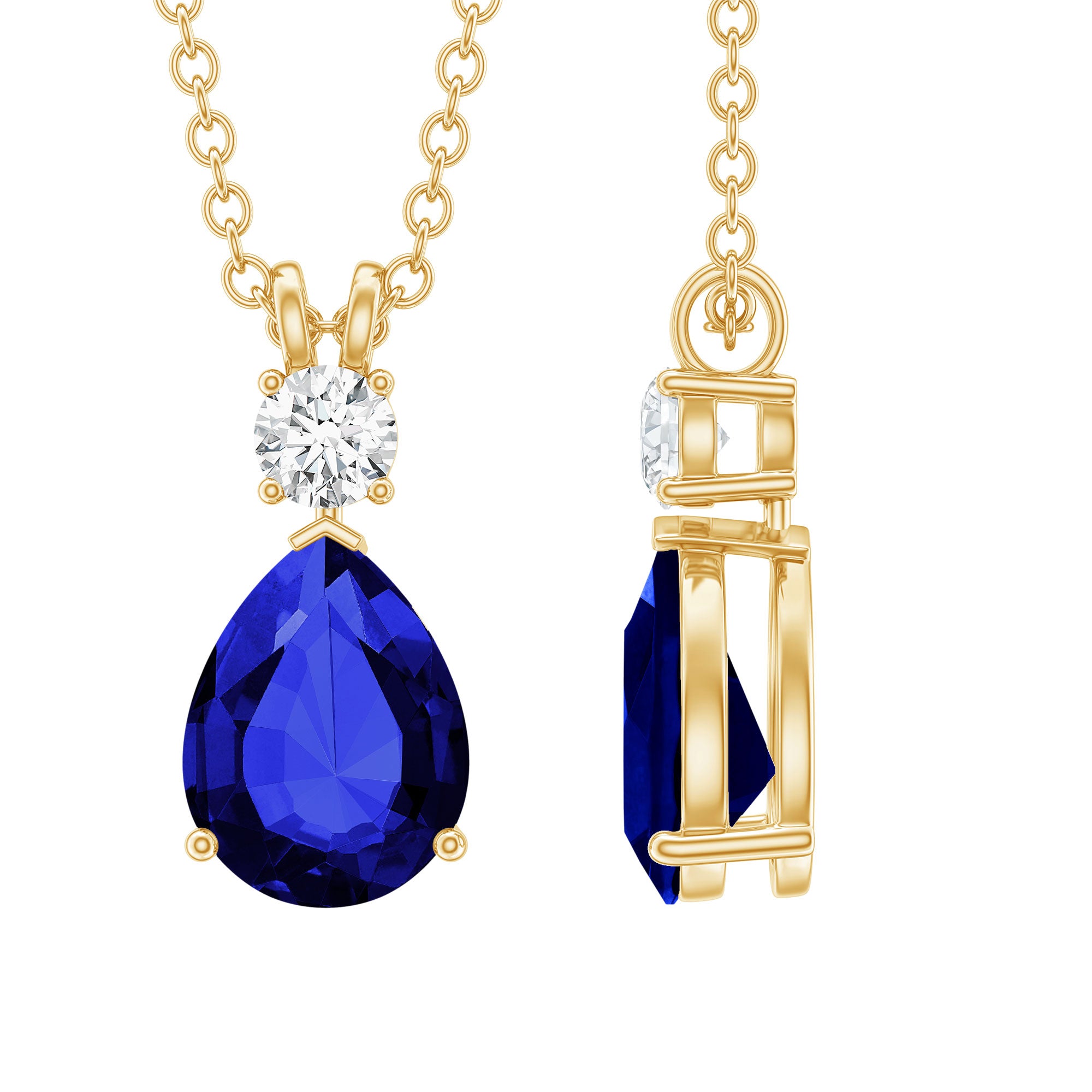 Make her heart skip a beat with this Lab Grown Blue Sapphire Necklace. Designed with care and attention to detail, this Drop Pendant features a 6X8 MM pear shaped lab grown blue sapphire set securely in prong setting. Above the main stone sits a 3 MM round cut moissanite that adds an extra hint of brilliance. The Teardrop Pendant hangs gracefully from a fine chain, resting beautifully on your neckline and catching the light with every movement. Curated with AAAA quality lab created blue sapphire and D-VS1 quality moissanite stone, this Pear Shaped Necklace combines modern craftsmanship with a touch of luxury. Its teardrop shape gives it a classic yet modern appeal, making it suitable for both casual outings and special occasions. The simple design of this Blue Sapphire and Moissanite Necklace highlights the natural beauty of the gemstone. It can easily be worn alone for a minimal look or paired with other jewelry for a more layered style. Perfect for everyday wear or as a thoughtful gift, this beauty symbolizes calmness, loyalty, and inner strength.