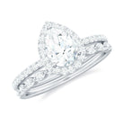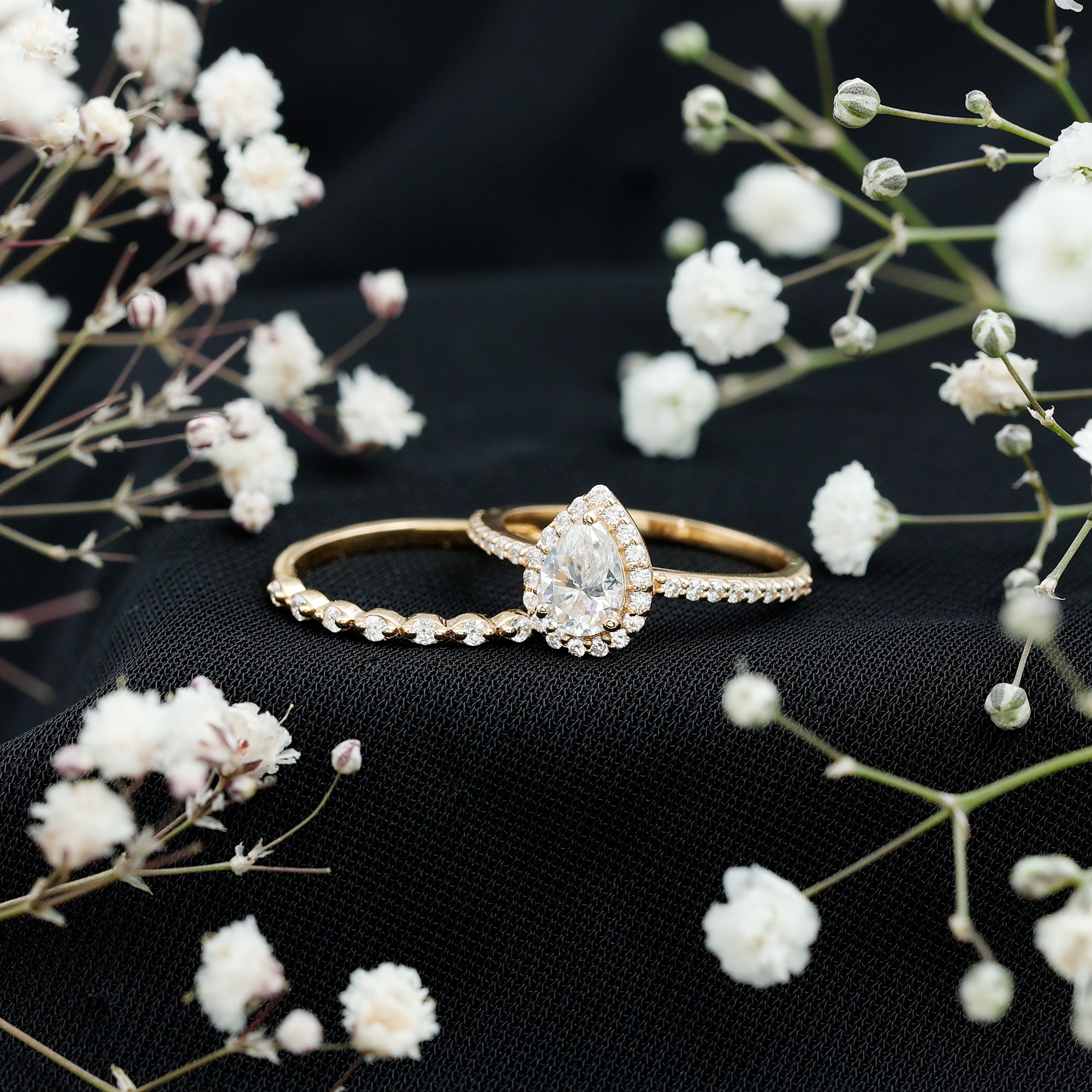 Make your forever shine with a mix of modern brilliance and classic charm. This stunning Lab Grown Diamond Bridal Ring Set features a Teardrop Engagement Ring paired with a matching Designer Wedding Band, crafted to honor your love in the most sophisticated manner. The 5X7 MM pear shaped lab created diamond center stone shines with remarkable clarity, effortlessly drawing in light and attention. Encircling this breathtaking focal stone is a diamond halo, which also embellishes the band as side stones, adding a delicate sparkle with every movement. Created with care and sustainability in mind, this Diamond Engagement Ring Set offers all the allure of natural gemstones. Available in US ring sizes 3 to 13, this Wedding Engagement Ring Set ensures a perfect fit for every bride-to-be. Packaged in a luxurious jewelry box, this Teardrop Wedding Ring Set is ready for proposals and cherished memories. Timeless, elegant, and ethically made, it delivers a sparkle that lasts for generations.