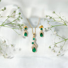We know how you always need Jewelry to bring spark to those dull, lazy days and so we bring this Emerald and Diamond Jewelry Set. Crafted with precision and care, the Emerald Jewelry Set includes a stunning pendant necklace and matching stud earrings, perfect for both special occasions and everyday elegance. The necklace features a 5X7MM pear shaped lab created emerald as its centerpiece, securely set in prong setting. Flanking the emerald are sparkling round diamond stones with round cut lab created emeralds, creating a harmonious designer pattern that is both natural and stylish. The pendant hangs gracefully from a durable cable chain via a standard bail, resting beautifully on the neckline. The matching stud earrings are equally captivating, each featuring a 4X6 MM lab created emerald accented with delicate diamond stones. Screw-back closures ensure comfort and security, making them ideal for all-day wear without worry. Crafted from AAAA quality lab created emeralds and HI-SI-quality diamonds, the Designer Necklace Set offers a striking contrast that draws the eye and adds sophistication to any ensemble. Versatile and timeless, the Necklace and Earrings Set can be worn together for a coordinated statement or separately for subtle elegance.