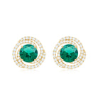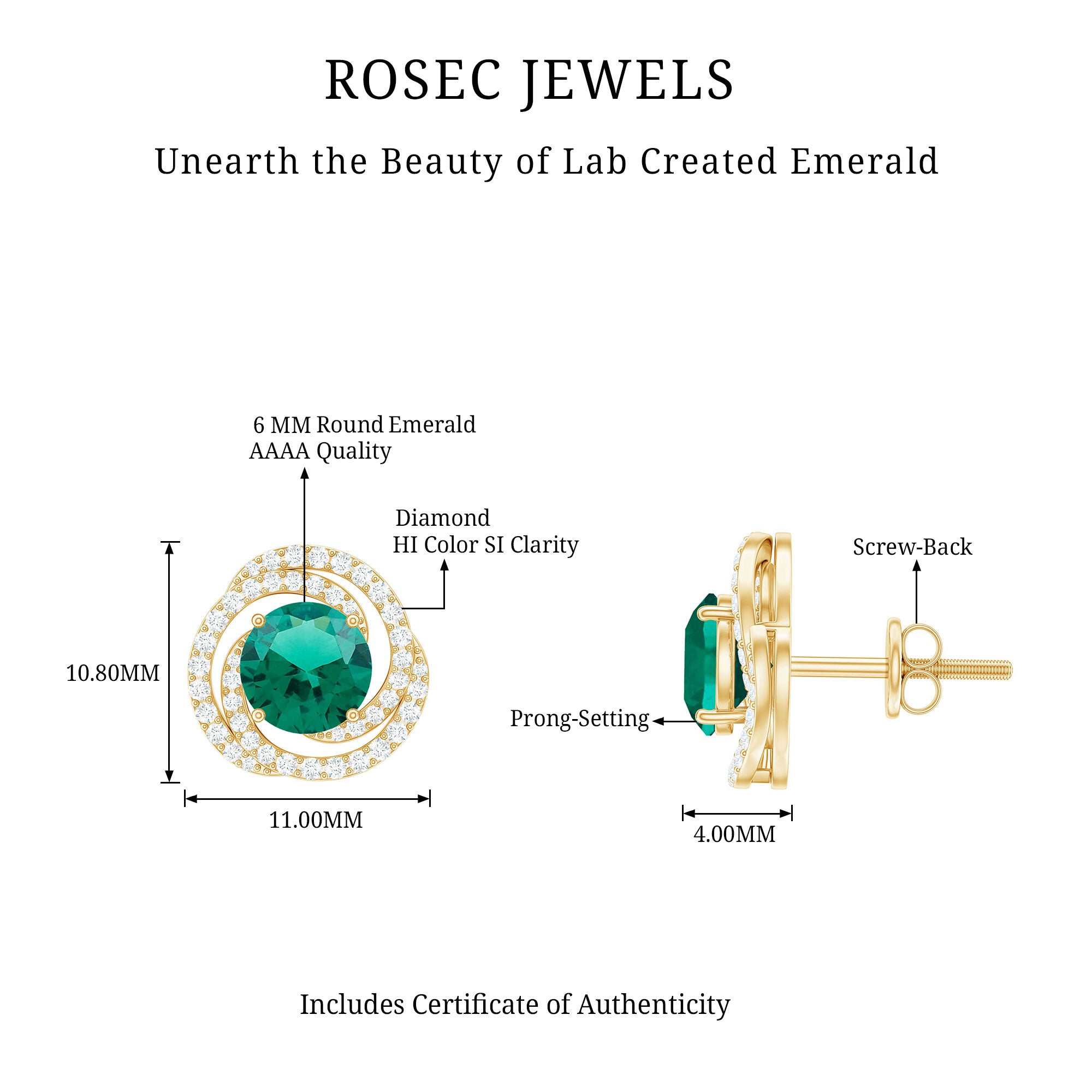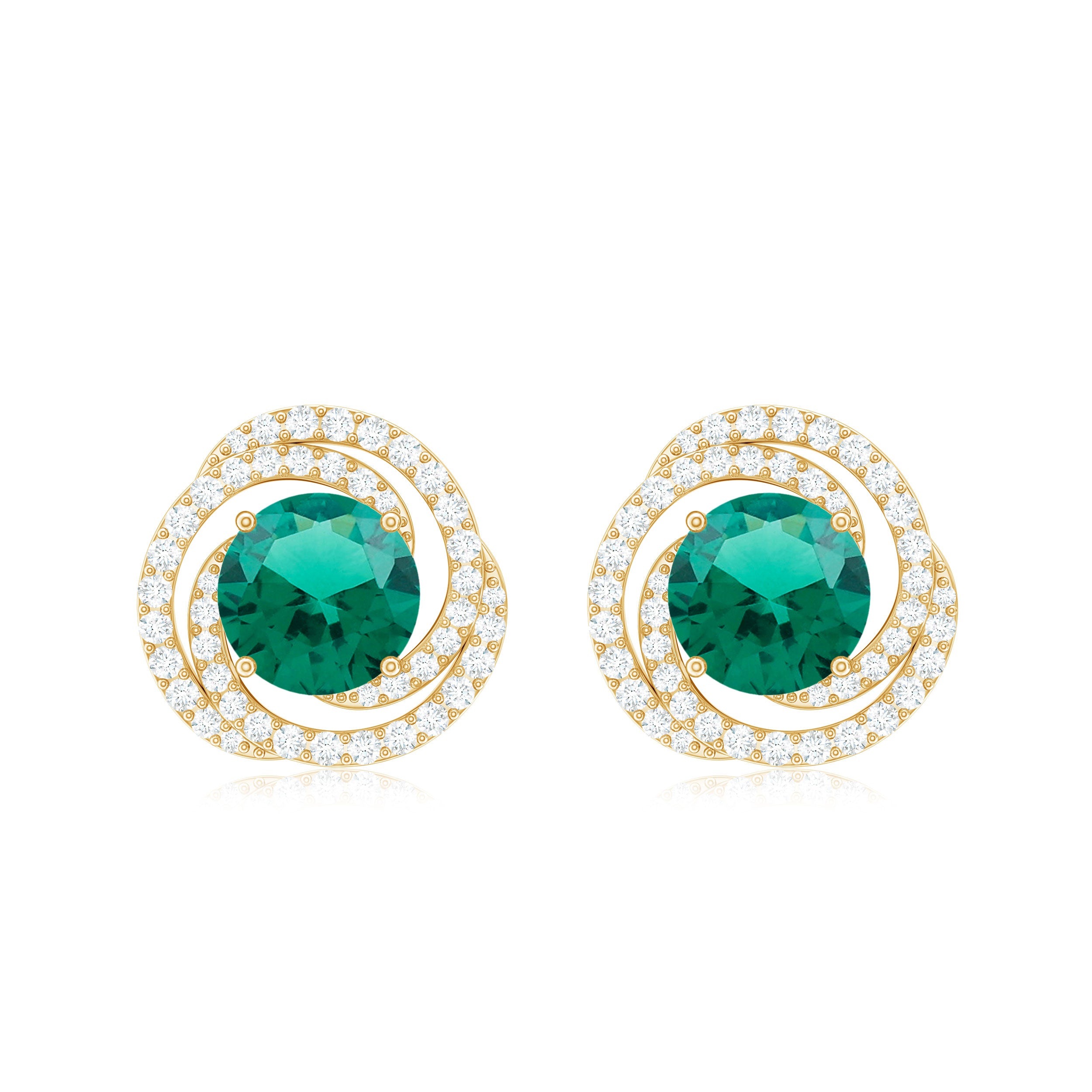 Like a gentle swirl of elegance, these Emerald Stud Earrings are made to shine with timeless beauty and charm. At the center of each earring sits a 6 MM round shaped lab created emerald, securely held in prong setting. Around the center stone, small diamonds twist in a graceful spiral design, adding a soft shimmer that catches the light from every angle. The mix of bright green and sparkling white creates a eye-catching contrast that feels both modern and classic. These Spiral Earrings are carefully crafted with fine detailing, giving them a smooth and elegant finish. They come with secure screw back closures for a comfortable fit, so you can wear them easily all day or evening. Perfect for any special occasion, these Emerald and Diamond Earrings make a thoughtful gift for anniversaries, birthdays, or Valentine’s Day. They are also a beautiful way to treat yourself with something elegant and meaningful. With their delicate design and graceful shine, these Lab Grown Emerald Earrings bring a touch of sophistication to any look.