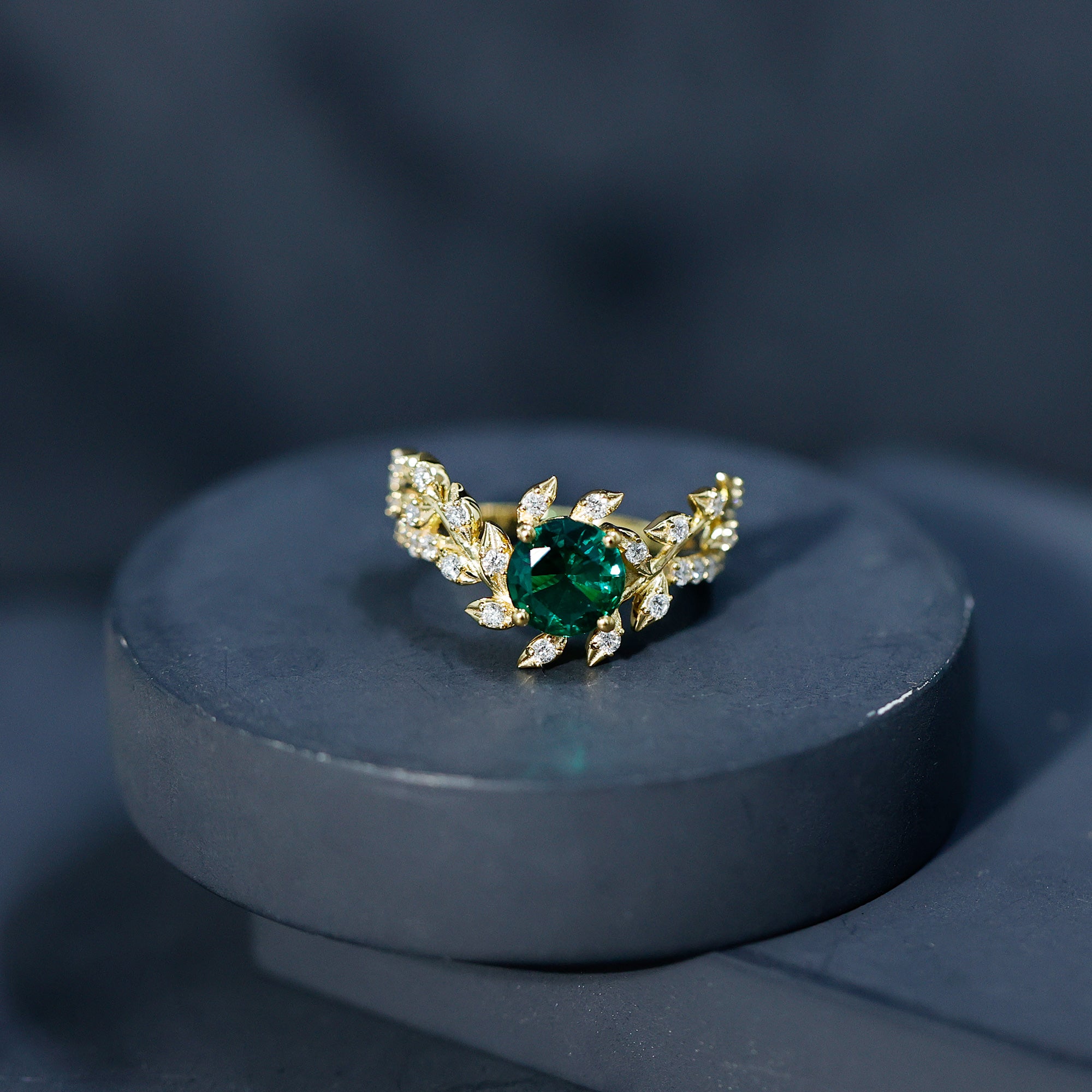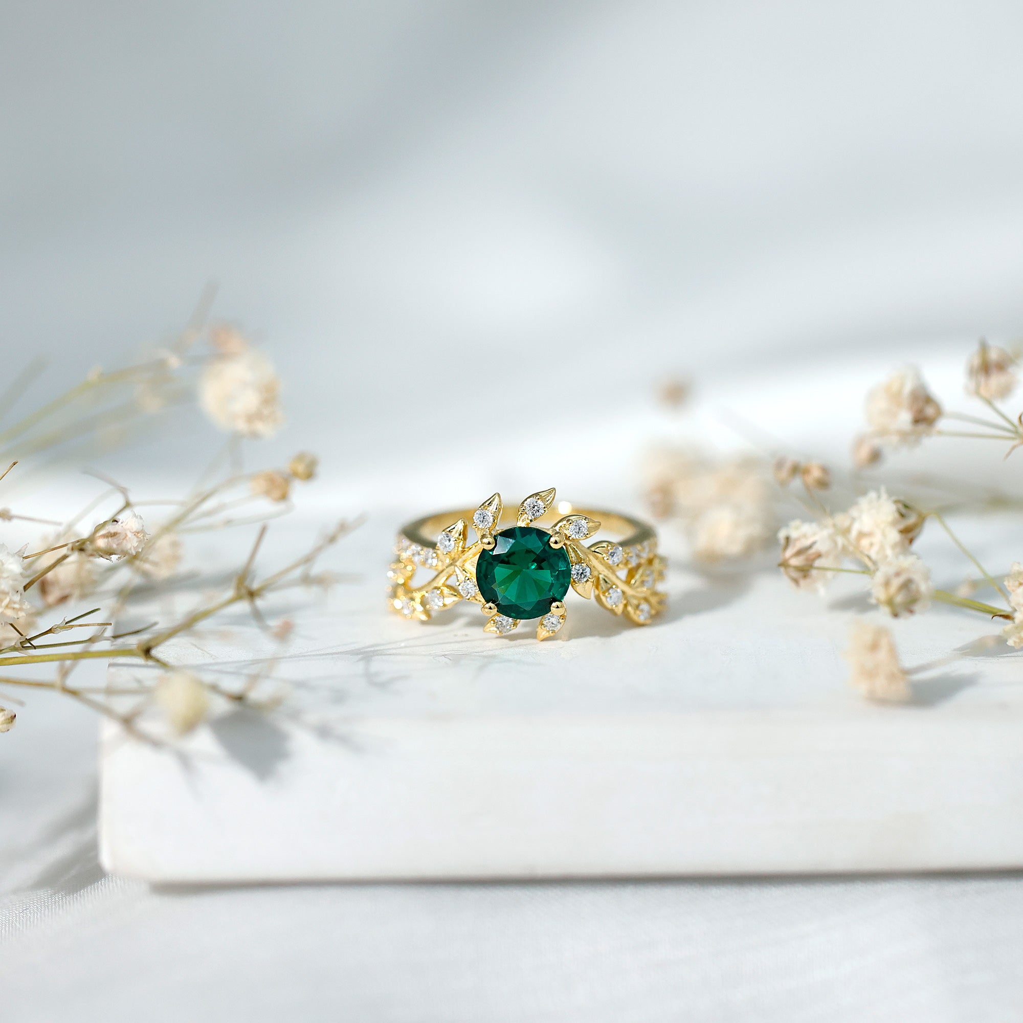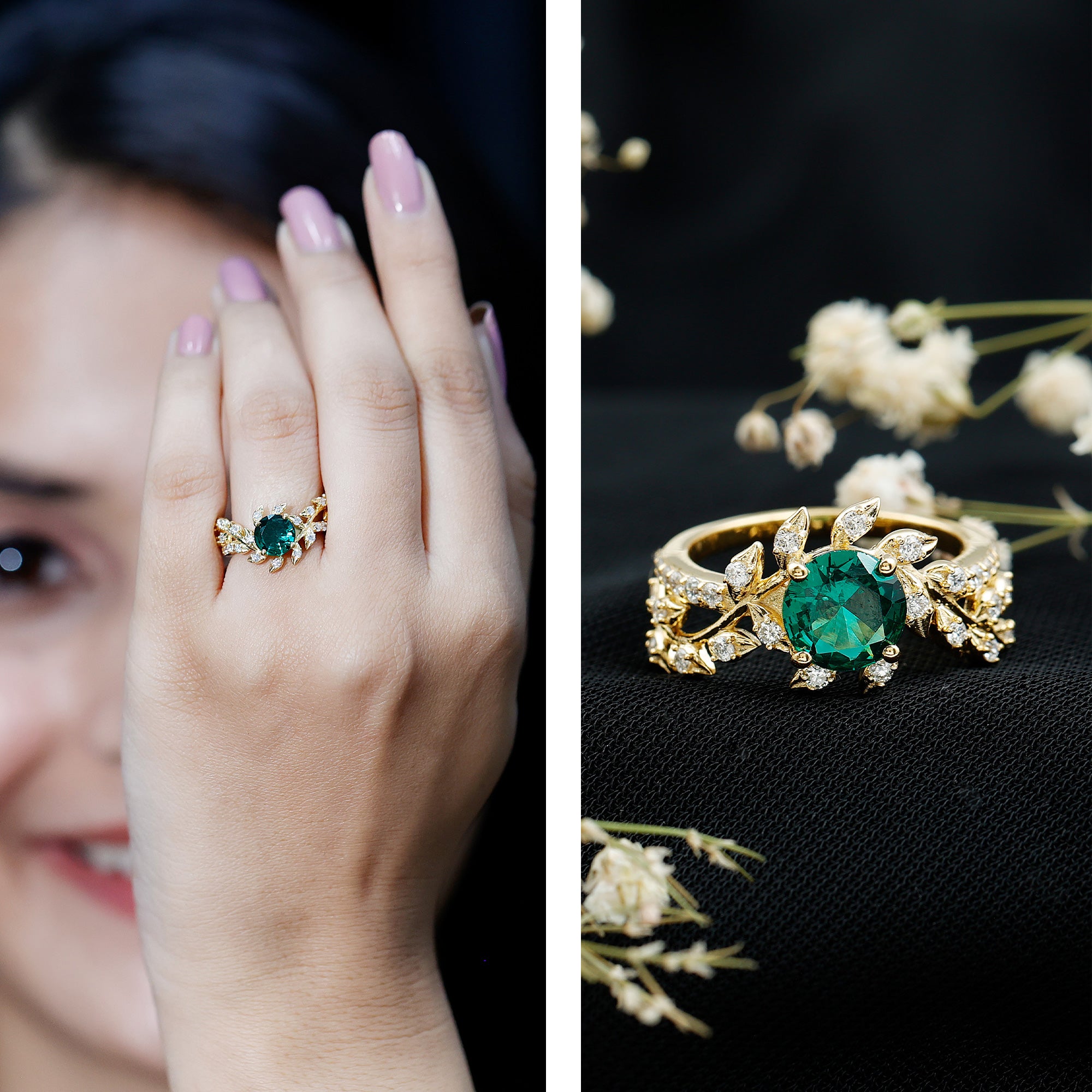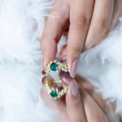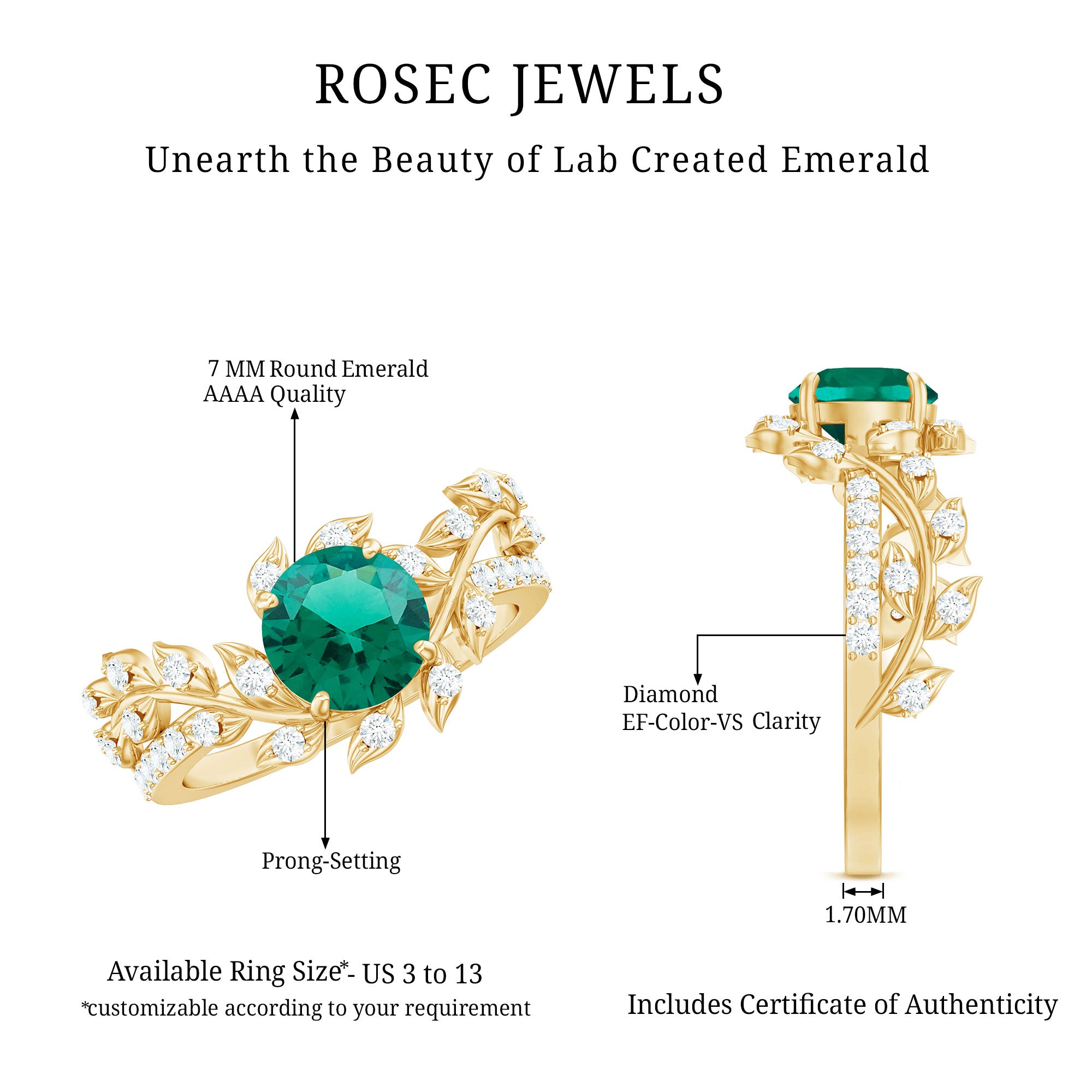 Like a love story wrapped in gold, this enchanting Emerald Engagement Ring brings together natural beauty and timeless design. Crafted in 14K yellow gold plated silver, this Leaf and Vine Engagement Ring is designed to feel like a walk through a blooming garden. At the center is a 7 MM round shaped lab created emerald, set in prong setting that lets the gemstone take center stage. Surrounding the center stone are delicate vine and leaf motifs, carefully shaped to follow the curve of the band. What makes this piece truly special is the way it blends organic elegance with a vintage-inspired touch. Each leaf on the band is accented with round lab grown diamonds, giving the Nature Inspired Ring a soft sparkle that catches the light with every movement. Additional round diamonds on the shank add extra brilliance, finishing the design with thoughtful detail from every angle. This ring tells a story, one of love that grows stronger over time, just like nature itself. It is a piece made for romantic hearts, for moments that matter, and for the person who finds beauty in the little details. Whether it is an engagement ring, a meaningful gift, or a symbol of something close to your heart, this Emerald and Diamond Ring is a beautiful reminder that love, like nature, is always in bloom.