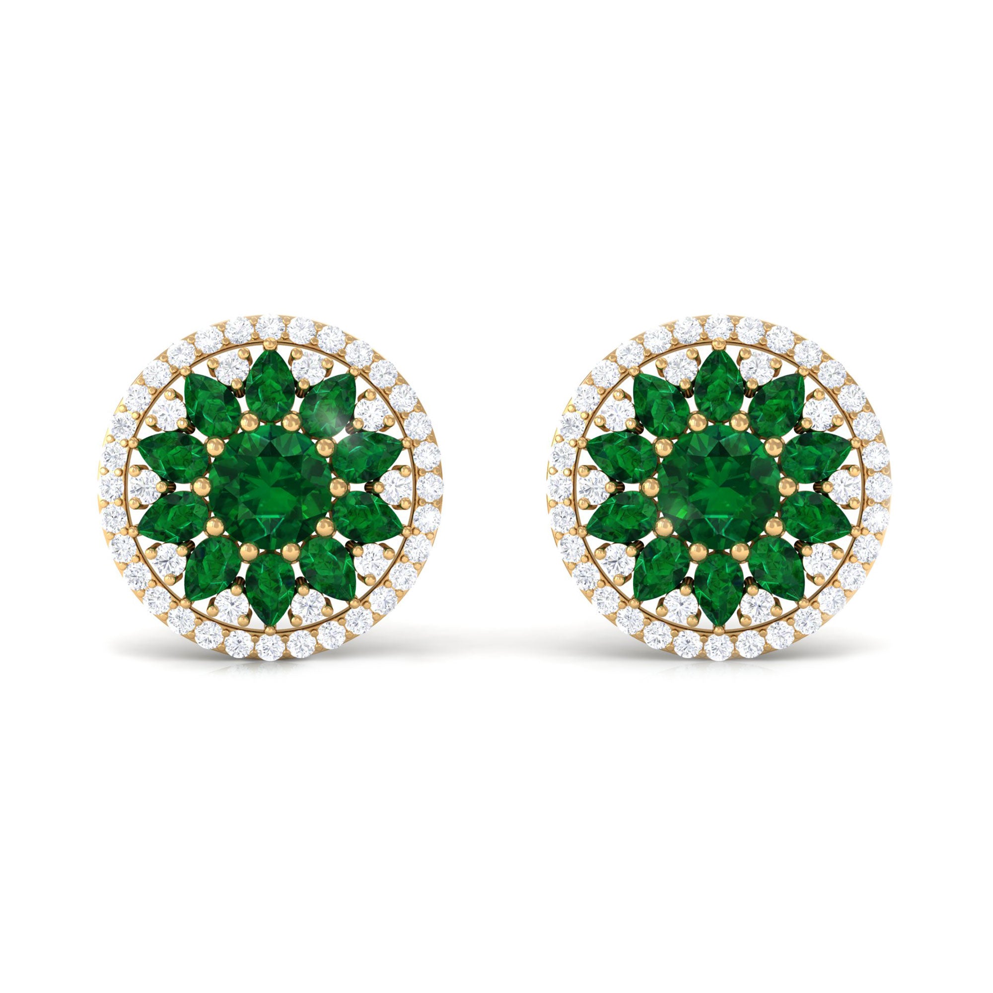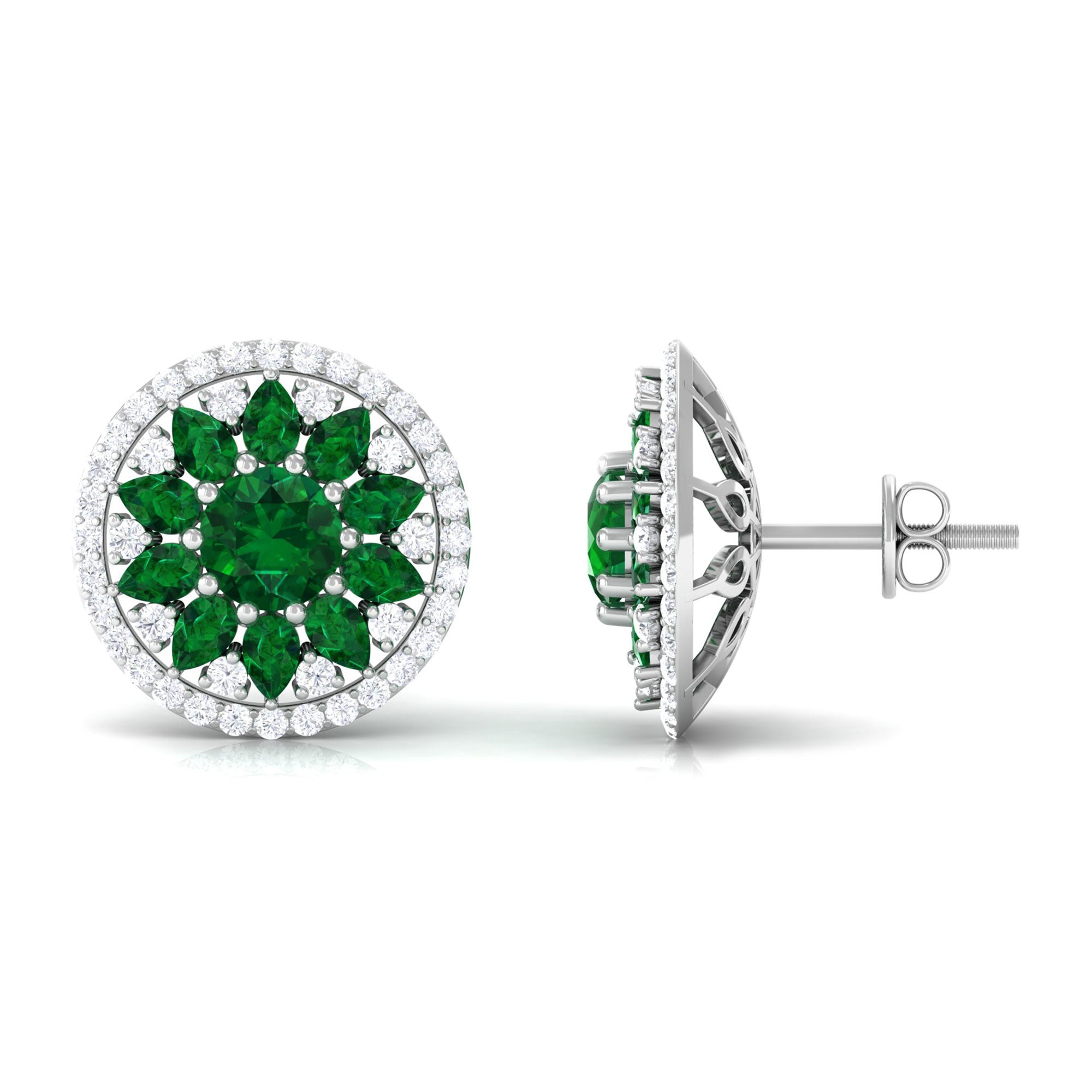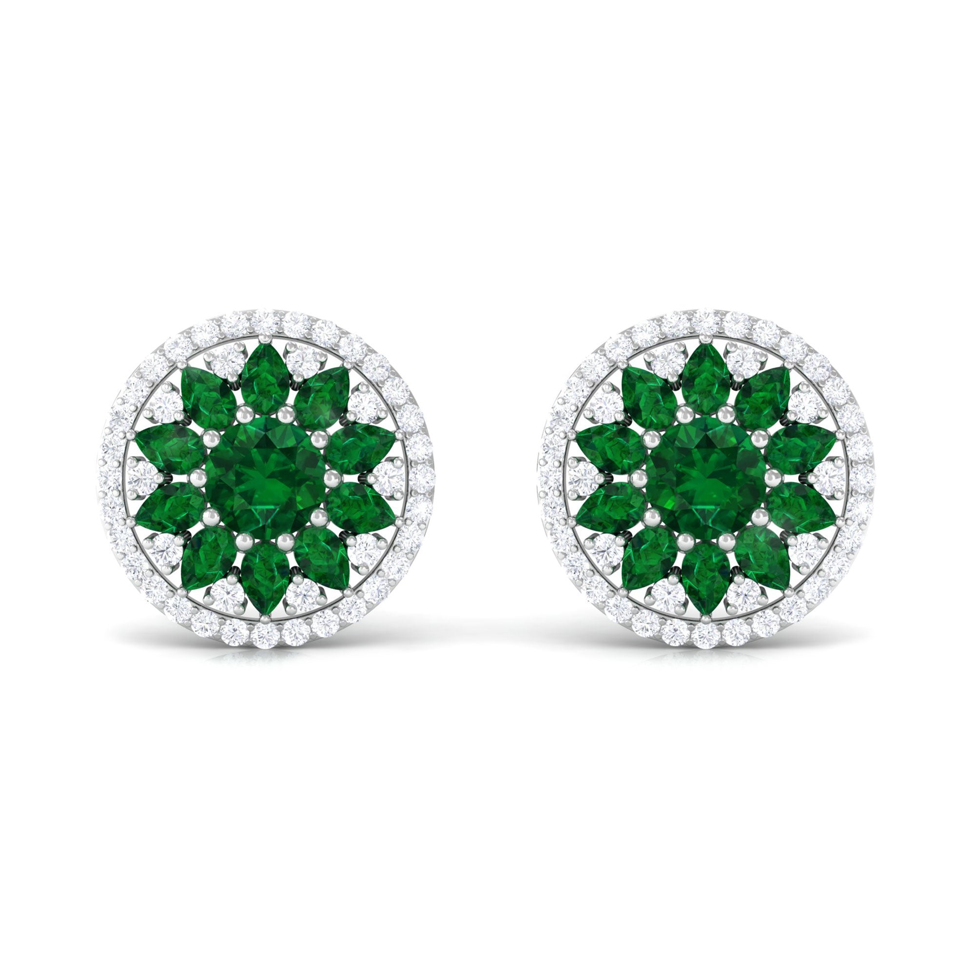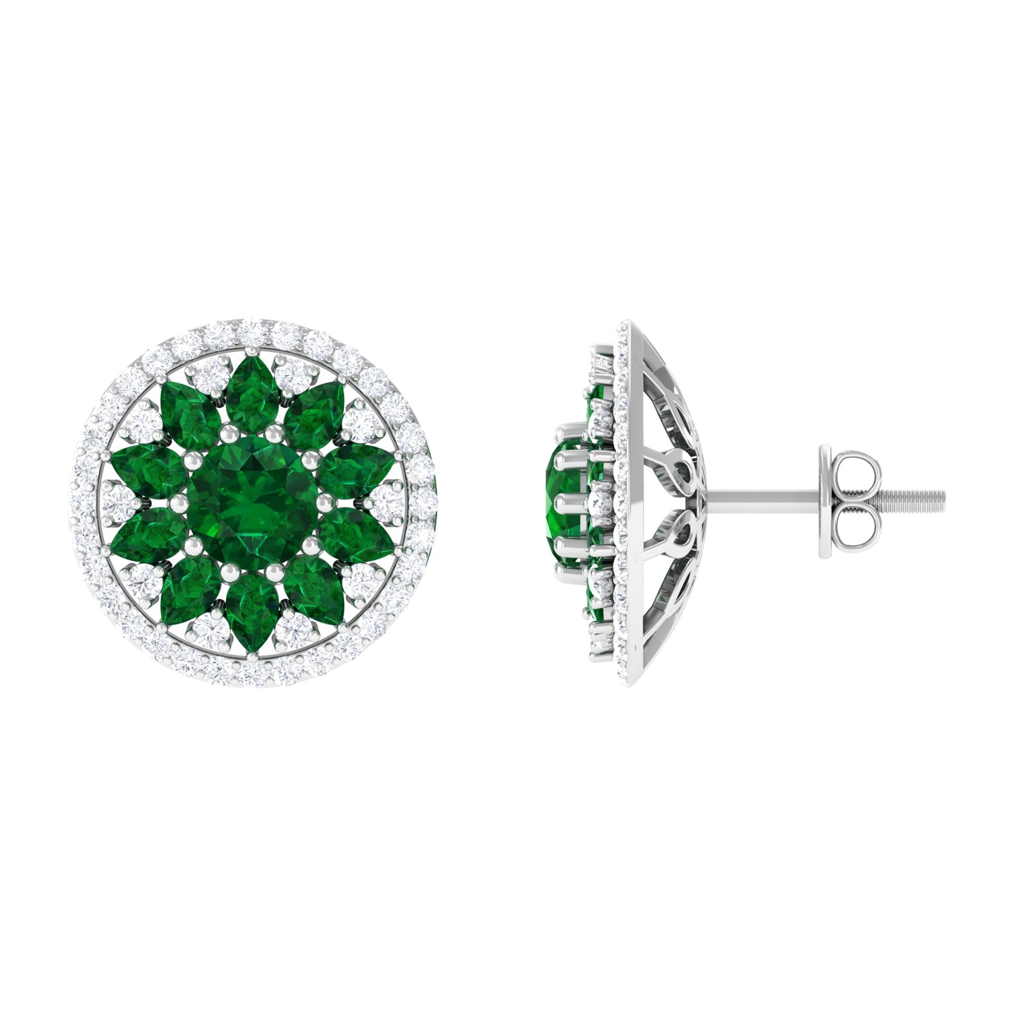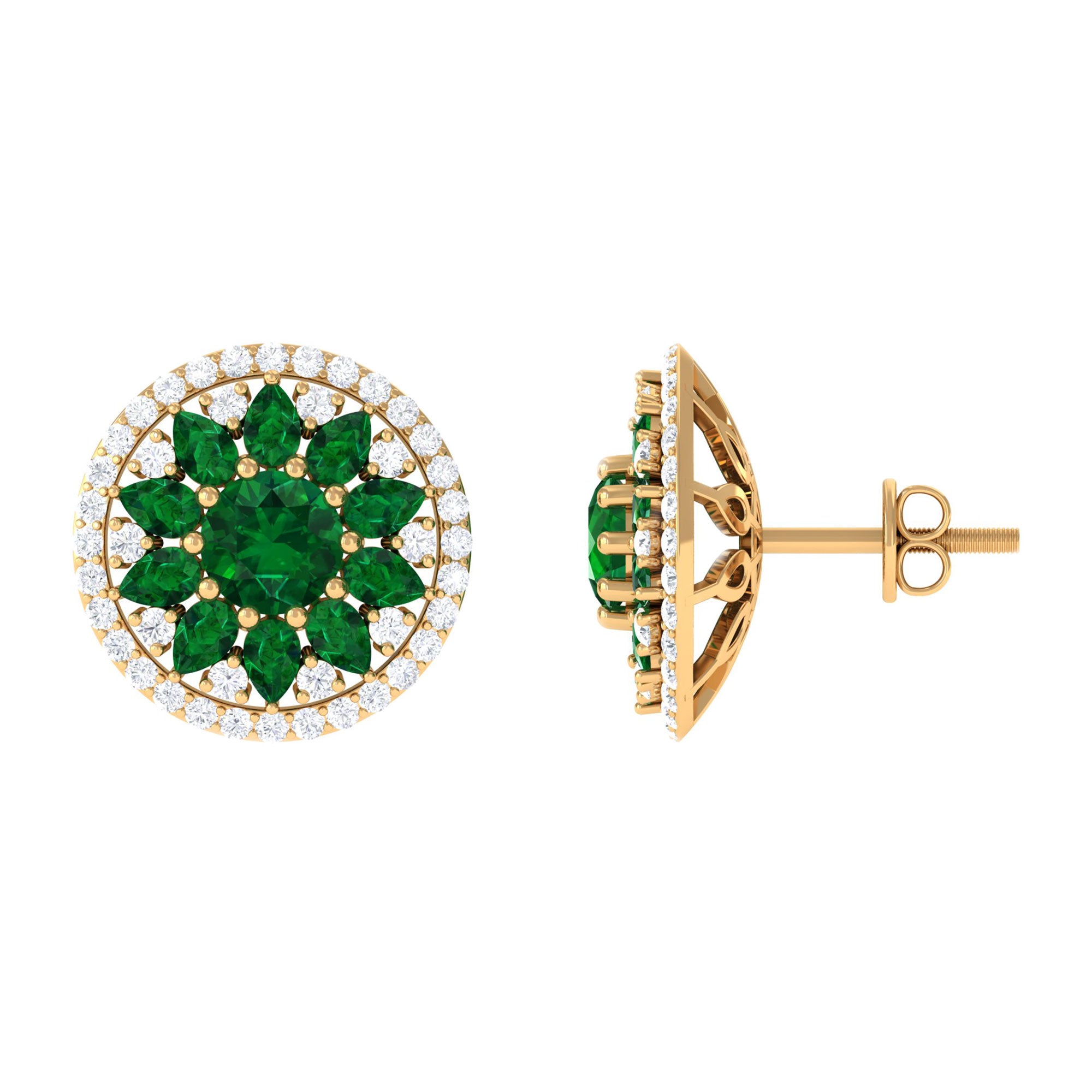 These Lab Created Emerald Stud Earrings are a true celebration of elegance and beauty, inspired by the delicate charm of a blooming flower. They feature a brilliant 4 MM round lab created Emerald, surrounded by pear shaped Emeralds that form a stunning floral pattern. Encircling the emerald petals are sparkling round Moissanite stones, adding a halo of brilliance that enhances the vibrant green center. Each stone is set carefully in secure prong setting, ensuring maximum sparkle and security. The detailed craftsmanship highlights the beauty of every gemstone, creating a luxurious yet refined look. Made in a timeless stud style, these Statement Earrings feature a screw back closure for a comfortable and secure fit. Their bold and radiant design makes them perfect as statement or cocktail earrings, adding a touch of glamour to any outfit. Whether worn with a traditional dress or a modern ensemble, these Emerald and Moissanite Earrings instantly elevate your look with sophistication and charm. Ideal for special occasions or as a thoughtful gift, these Circle Stud Earrings bring together the brilliance of fine gemstones and the artistry of expert craftsmanship.
