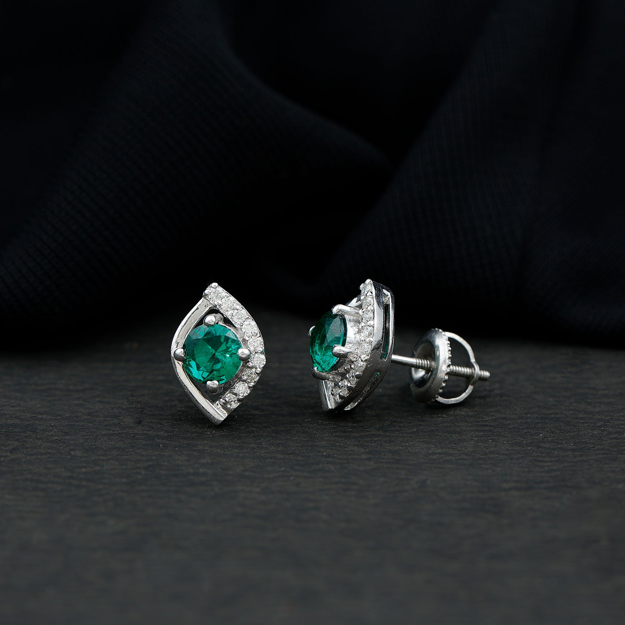 As a perfect blend of timeless elegance and natures beauty, these Lab Grown Emerald Earrings create a classy look with their enduring charm. Crafted from white Gold plated silver, these Leaf Stud Earrings reflect the style and beauty that will stand the test of time. Crafted with attention to detail, these Studs are adorned with 5 MM round brilliant cut lab created emerald set in prong setting in the center of a leaf motif halfly adorned with dainty moissanite stones. Elevate your style with the exquisite combination of rich green hues and radiant sparkle, making these Designer Stud Earrings a perfect and glamorous accessory for any momentous event or everyday luxury. These Green Stud Earrings are an everyday staple with their classic beauty that would be cherished for years. Delight in the captivating elegance with this stunning pair that steals the show with their charismatic appearance. Dress up your look with this classic beauty that has AAAA quality lab made emerald and D-VS1 quality moissanite, emitting sparkle.