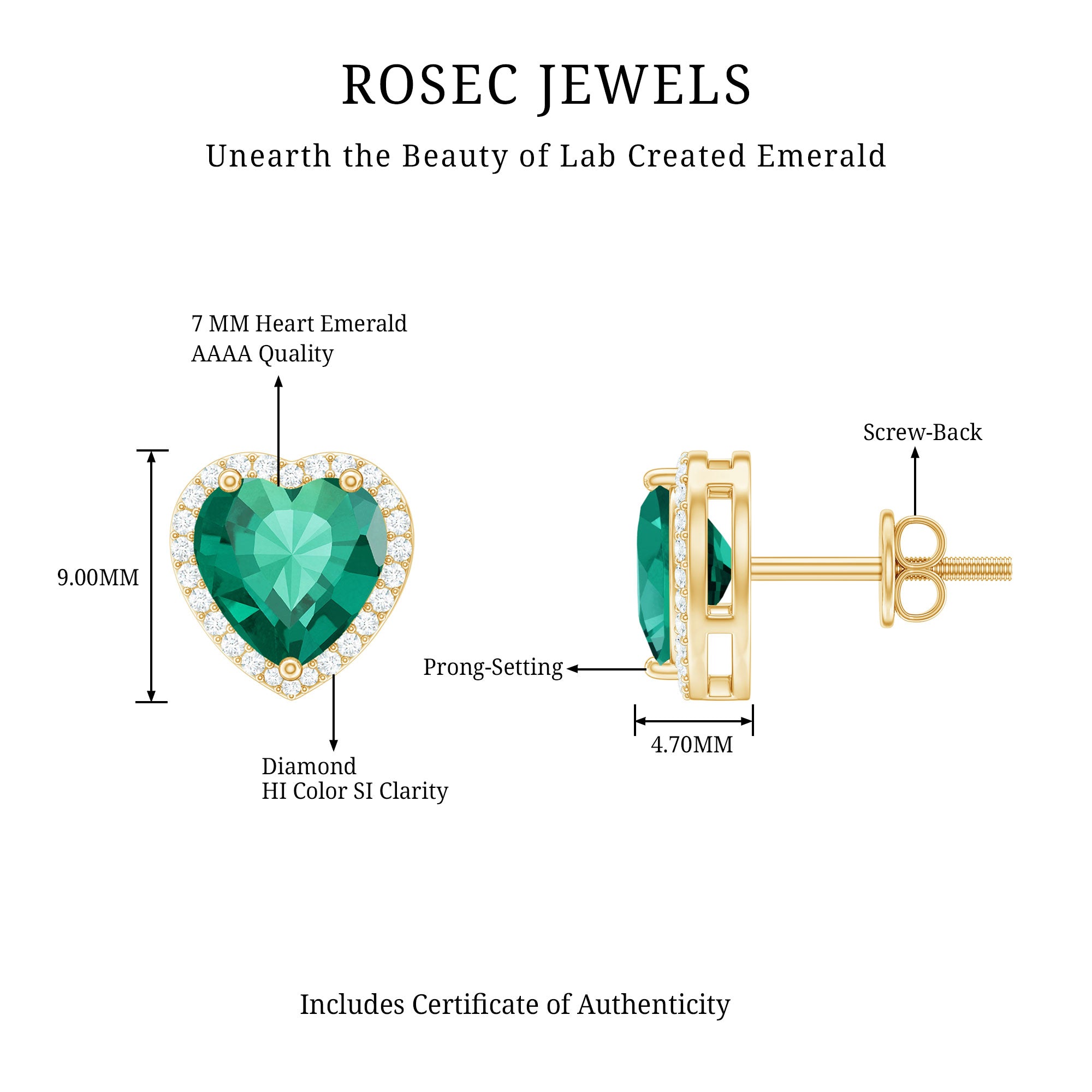 This Valentine’s Day, make her heart race with these stunning Heart Shaped Stud Earrings, a dazzling representation of love, affection, and everlasting beauty. They feature a 7 MM heart shaped lab grown emerald that shines with vibrant color and clarity. Encircling the center stone is a sparkling round cut diamond halo, skillfully arranged to boost the brilliance and make them shine from every angle. The sparkle of the HI-SI quality diamonds pairs perfectly with the deep richness of the AAAA quality lab made emerald, creating a radiant glow that is hard to overlook. Thoughtfully crafted with a screw back closure, these Emerald Stud Earrings are not just gorgeous but also secure and comfy for all-day wear, making them perfect for any occasion, from romantic date nights to everyday elegance. Whether you are celebrating your first Valentine’s Day together or giving her a token of your everlasting love, these Halo Stud Earrings are a lovely and meaningful option. Packaged in a premium gift box and accompanied by a certificate of authenticity, these Emerald and Diamond Earrings are set to make her feel treasured and absolutely stunning.