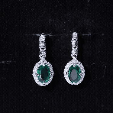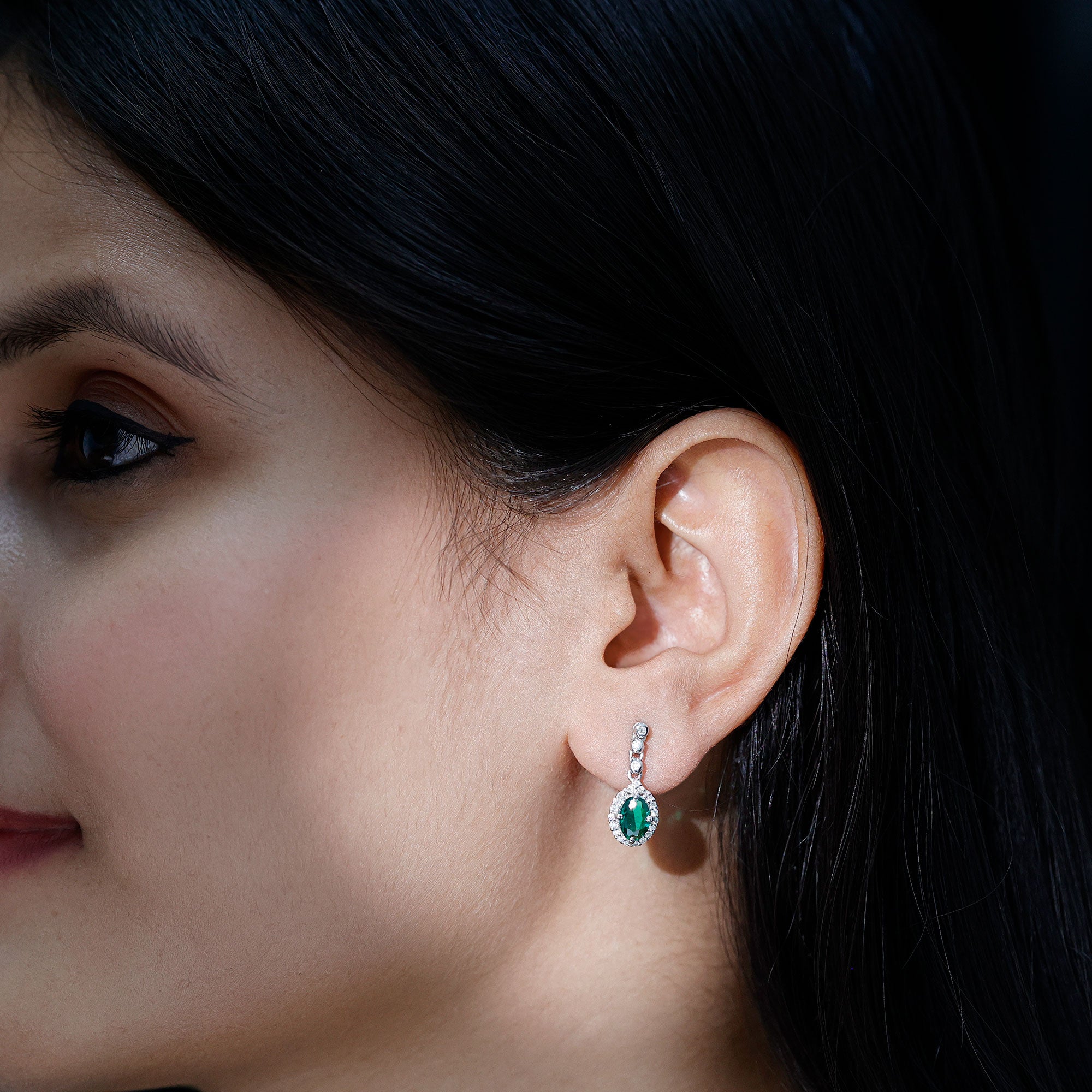 These vintage-inspired Lab Grown Emerald Vintage Earrings are a beloved piece of jewelry, making them perfect for your wedding day. As breathtaking Wedding Earrings For Bride, they are sure to dazzle with their timeless and subtle sparkle. The vibrant burst of color from the AAAA quality lab-created emerald and D-VS1 quality Moissanite creates a striking effect, ideal for the bride desiring a bold look. Crafted from white gold plated silver, these Drop Earrings feature a 5X7 MM oval-shaped lab emerald in a prong setting, surrounded by a halo of round cut moissanite and accented by three bezel set moissanite stones at the top. These gorgeous Emerald Drop Earrings are the ultimate bridal accessory, secured with a Screw back closure. The exquisite craftsmanship and skilled artisanship have made these drop-style earrings effortlessly chic, showcasing a subtle glamour that enhances bridal sophistication and elegance. They are guaranteed to add a vibrant touch to your outfit.