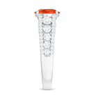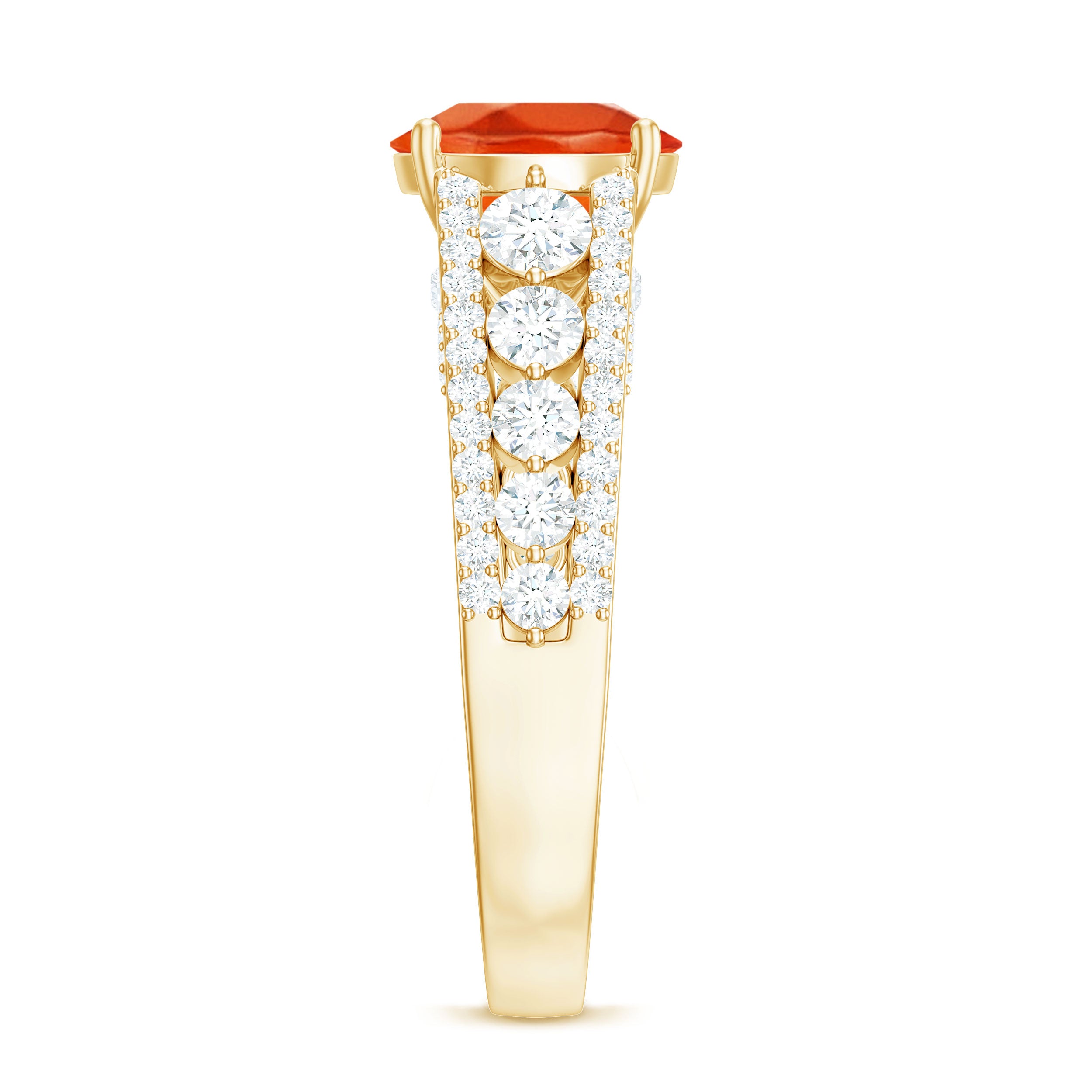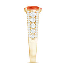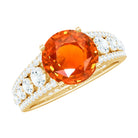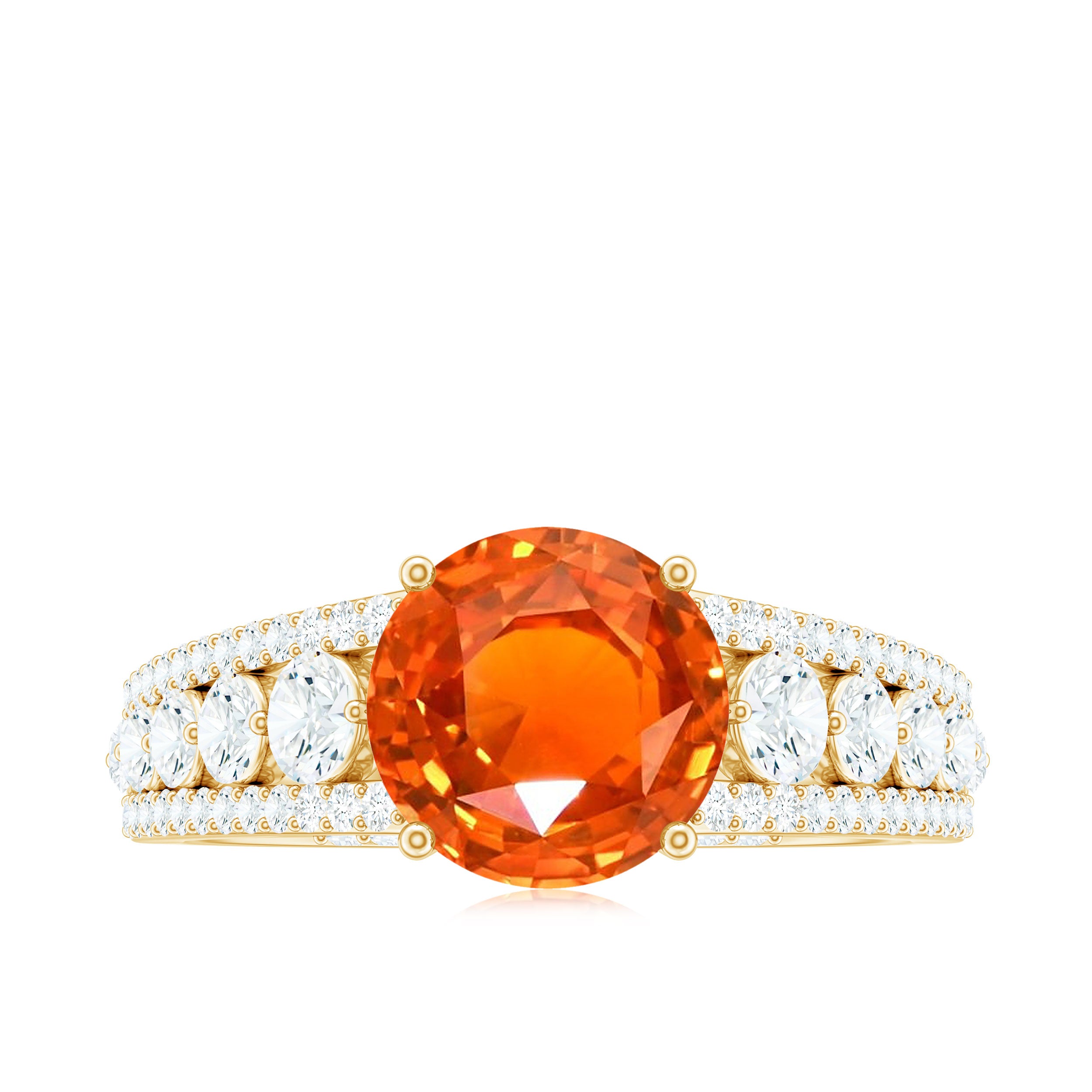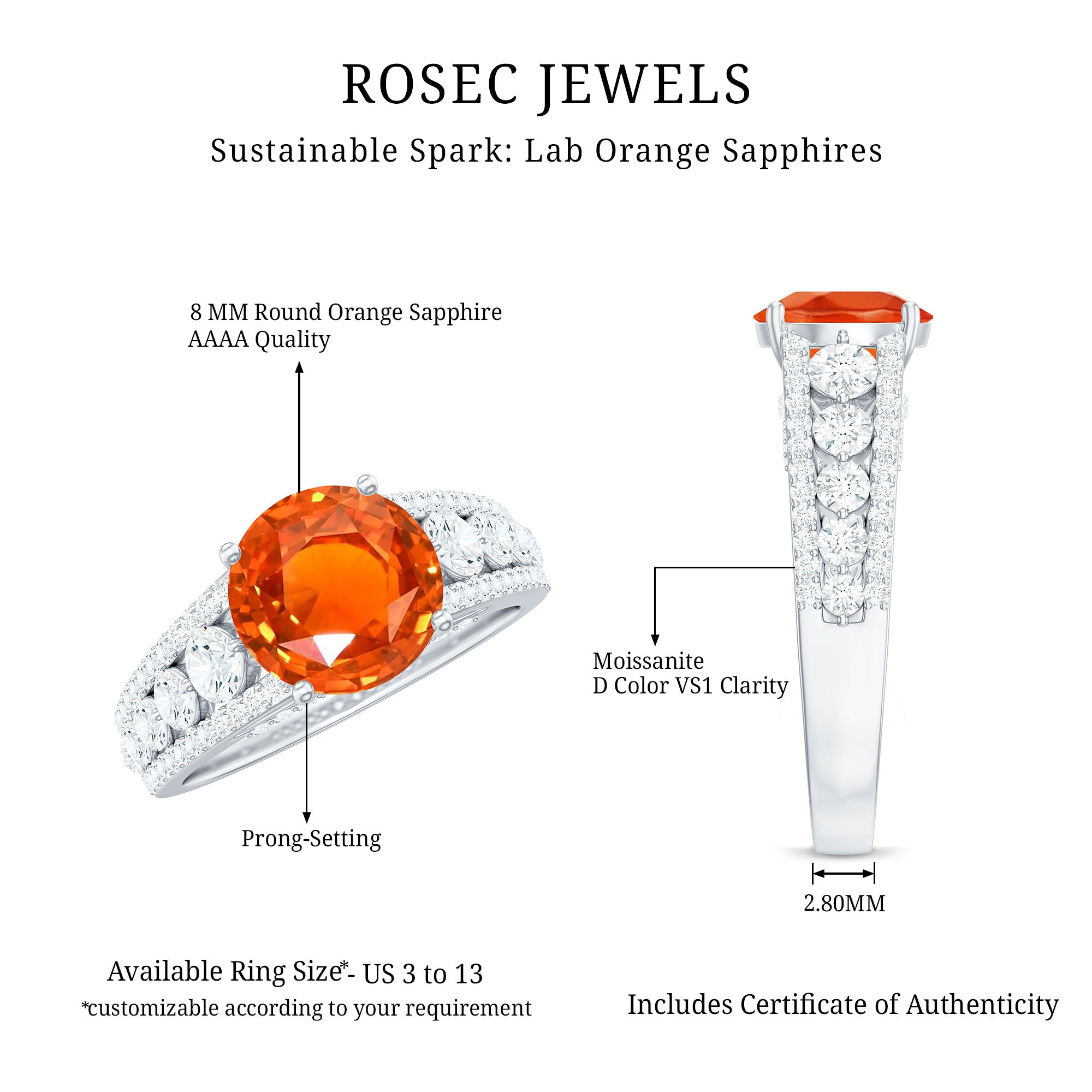 Youll take her breath away when you present this amazing Engagement Ring showcasing Round Shape Lab Created Orange Sapphire as the center stone secured by 4 Prong Setting, additional Round Hidden Moissanite sparkles across the bridge for extra charm. Graduated size Moissanite line the center of the shank while two rows of Round Moissanite line each side of the band. Make your partners day truly unforgettable by giving her the fascinating Statement Ring.