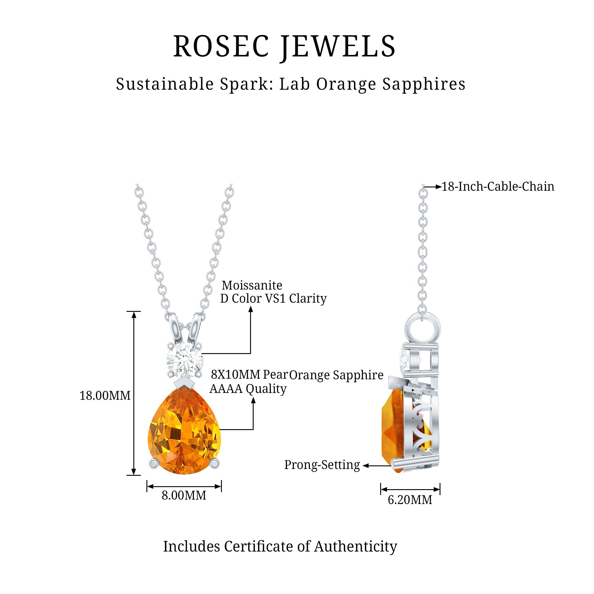 Radiating effortless elegance, this Lab Grown Orange Sapphire Cocktail Necklace effortlessly complements your special looks. This pendant features a Pear Shape Lab Created Orange Sapphire securely held in Prong Setting with a Round Shape Moissanite. This pendant exudes the classic shine of D-VS1 quality moissanite which makes it perfect to complete the entire look. This Teardrop Pendant Necklace captures the timeless allure and symbolizes everlasting love, making it a cherished token of affection. This pendant will be delivered to you in a classic jewelry box with the certificate of gemstone authentication.