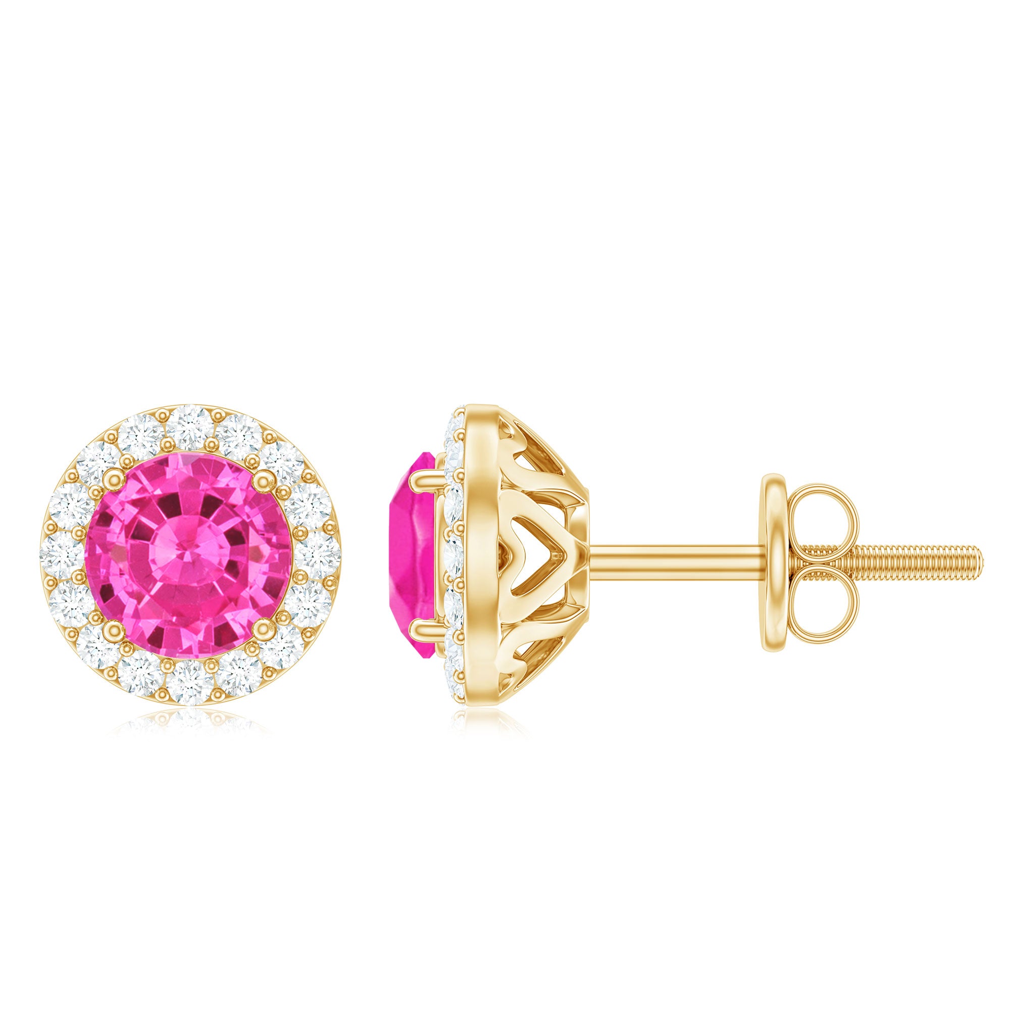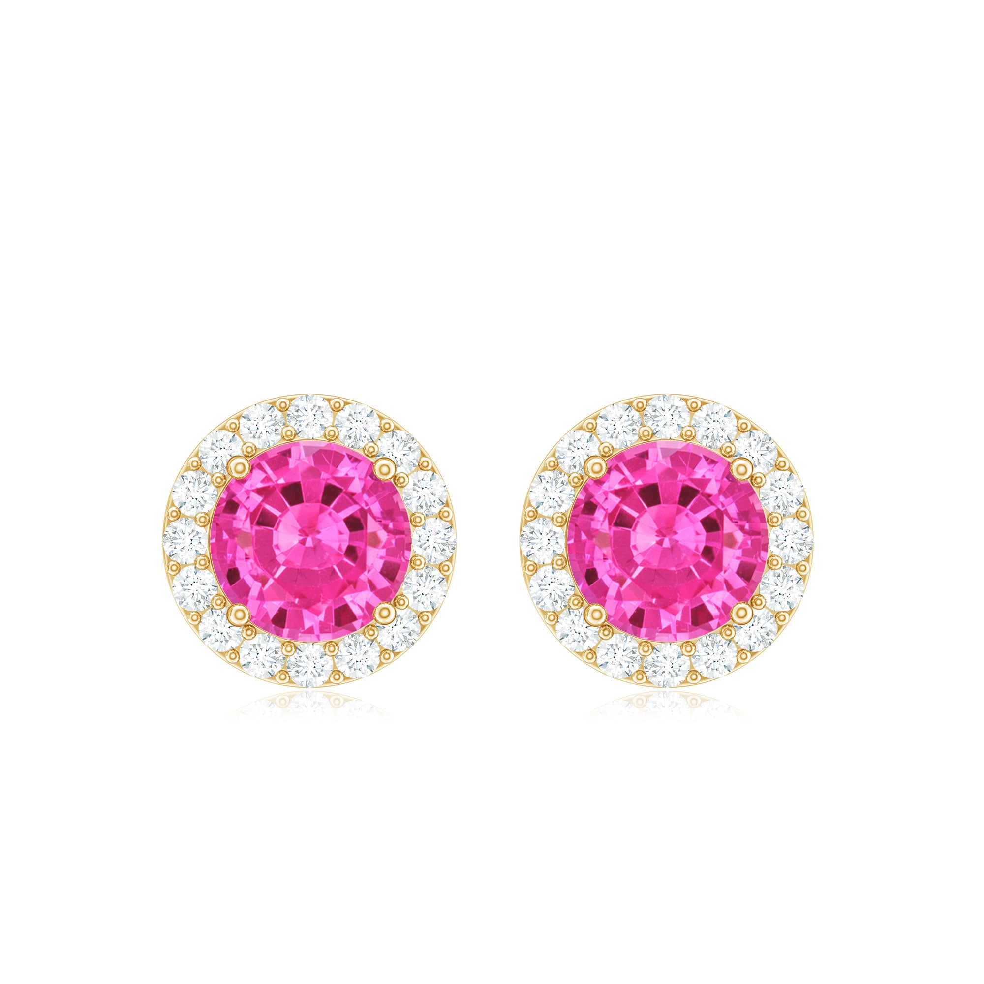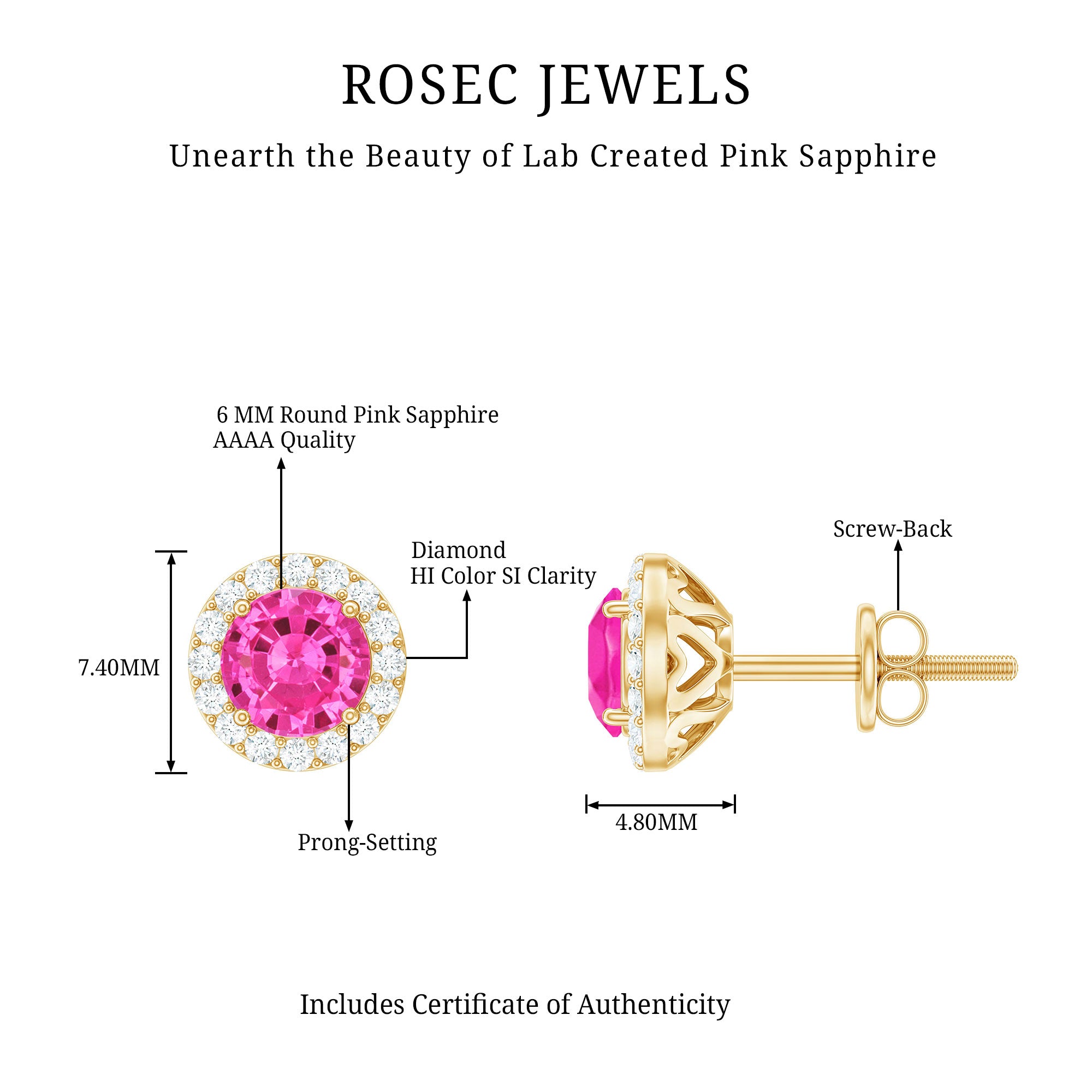 Soft, graceful, and full of charm, these Lab Grown Pink Sapphire Earrings bring a gentle sparkle that brightens every look. Each earring features a 6 MM round cut lab created pink sapphire, glowing with a soft blush tone that feels both romantic and timeless. The stone is securely held in prong setting. Encircling the pink sapphire is a fine halo of dazzling diamonds, adding a touch of brilliance that perfectly complements the delicate hue of the center stone. The combination of the pink sapphire and the white diamonds creates a balanced and elegant design that stands out with effortless beauty. Crafted in a sustainable lab environment, these Pink Sapphire Stud Earrings showcase high quality artistry and ethical craftsmanship. Their modern design makes them versatile for any occasion, whether it is an evening event, a formal gathering, or simply an everyday moment when you want to feel a little more special. Lightweight and comfortable, these Pink Sapphire and Diamond Earrings are made for easy and all-day wear while maintaining their elegant sparkle. The graceful style and radiant glow make these Halo Earrings a lovely addition to any jewelry collection.