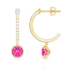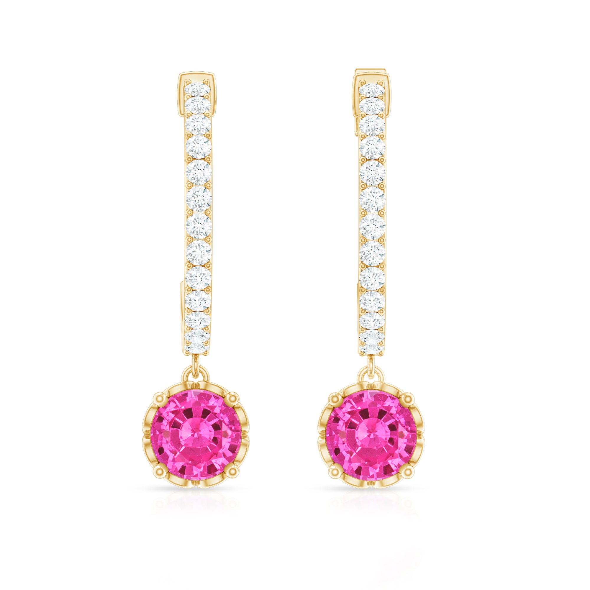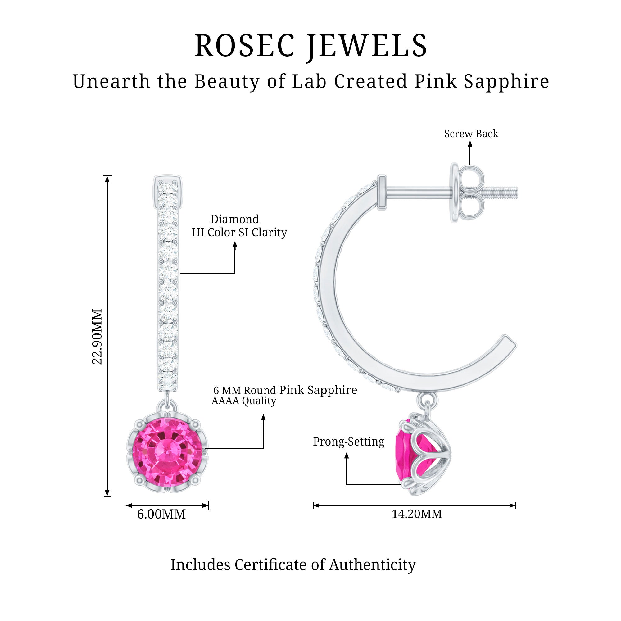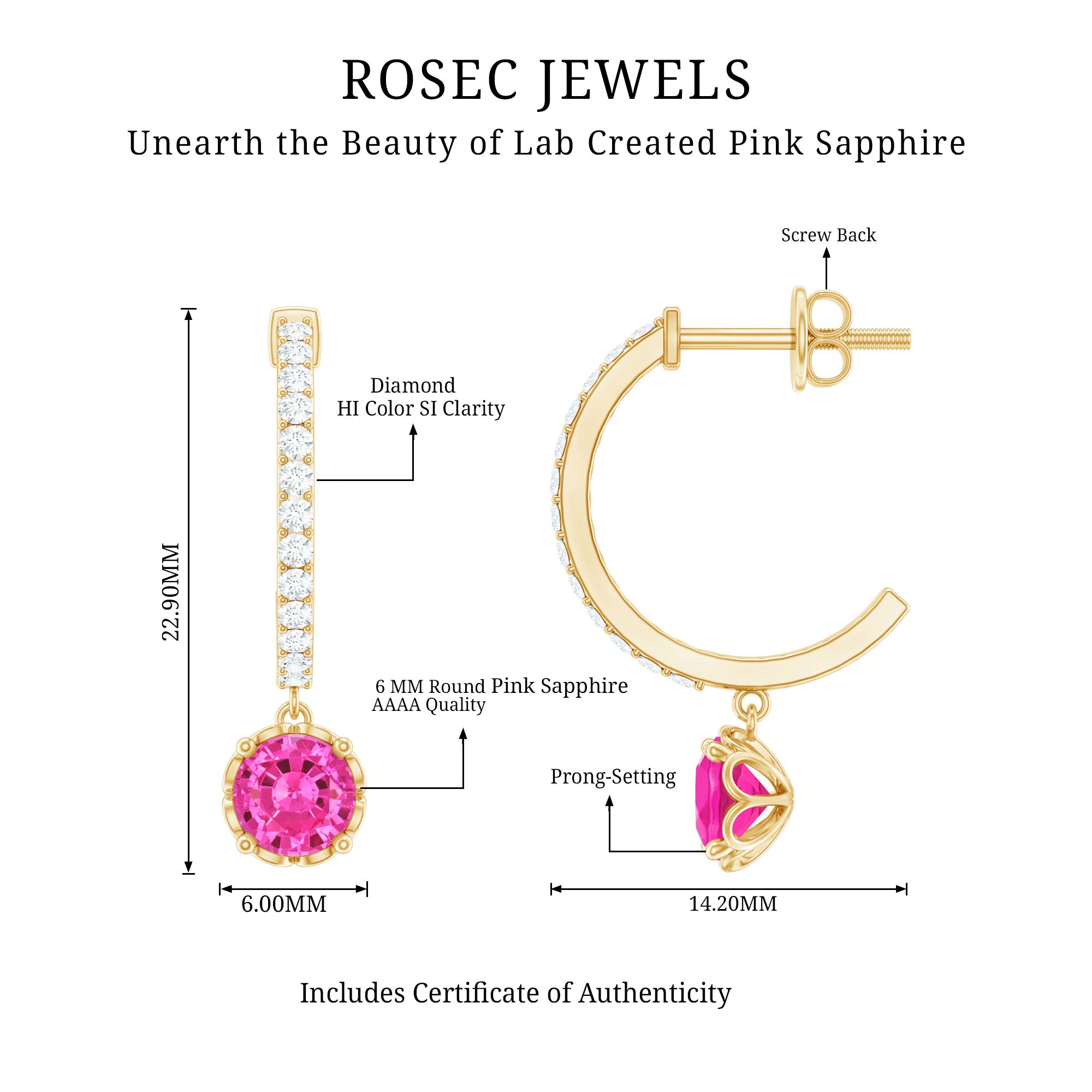 Bring a soft touch of elegance to your look with these beautiful Lab Grown Pink Sapphire Earrings. Designed to glow with grace and charm, these Hoop Drop Earrings blend classic style with a modern twist. Each earring showcases a radiant 5 MM round cut lab created pink sapphire, sparkling with a gentle blush tone that adds warmth and femininity to any outfit. The stone dangles gracefully from a smooth half hoop design, creating a refined and graceful silhouette. The half hoops are delicately lined with shimmering round cut diamonds that add a soft sparkle, enhancing the beauty of the pink sapphire without overpowering it. Crafted with care and precision, these Pink Sapphire and Diamond Earrings are perfect for women who love to express elegance in a simple yet striking way. Whether you are getting ready for a special celebration or just want to add a bit of sparkle to your everyday look, these Pink Sapphire Hoop Earrings make the perfect choice. Designed with secure screw-back closures, they offer both comfort and confidence, allowing you to wear them all day with ease.