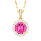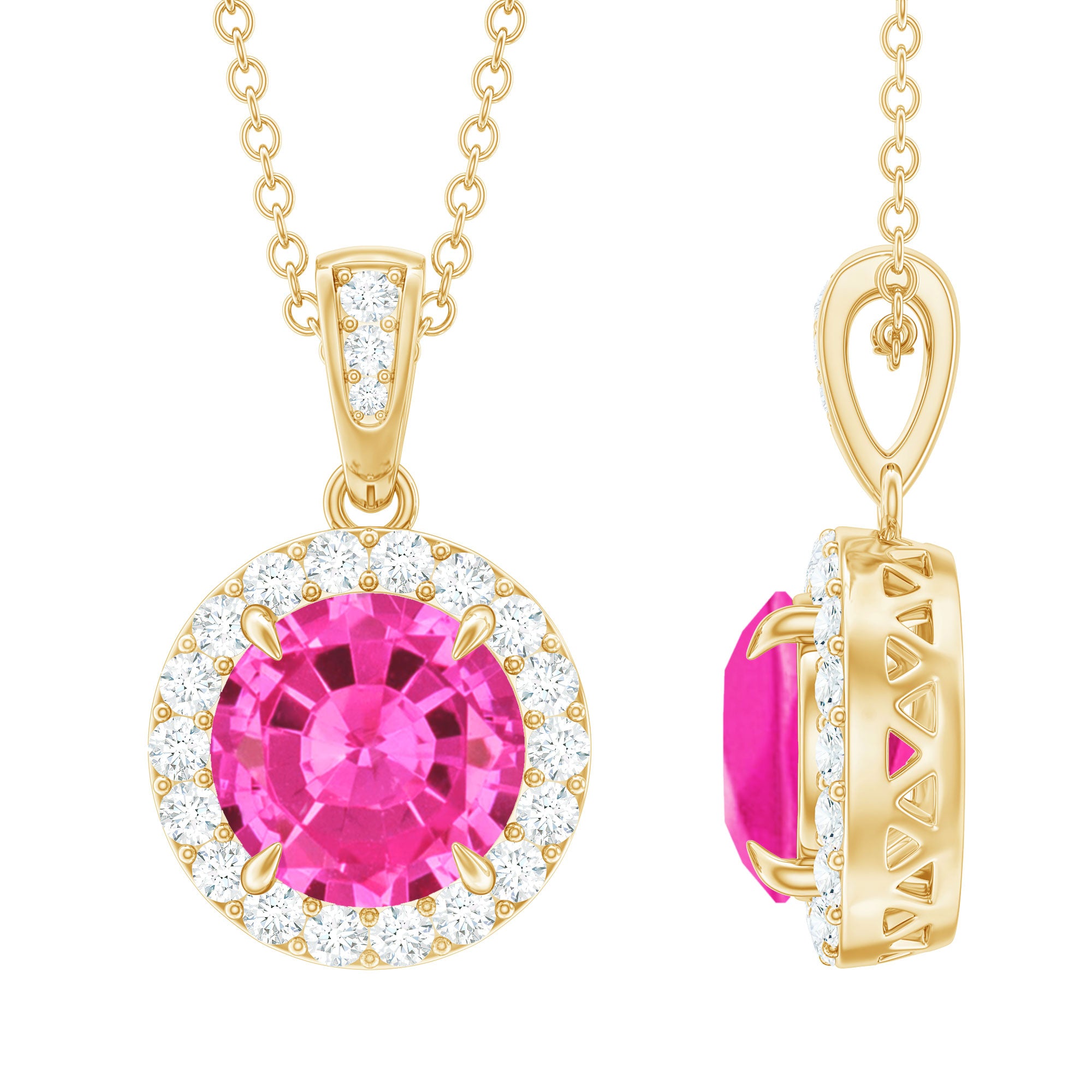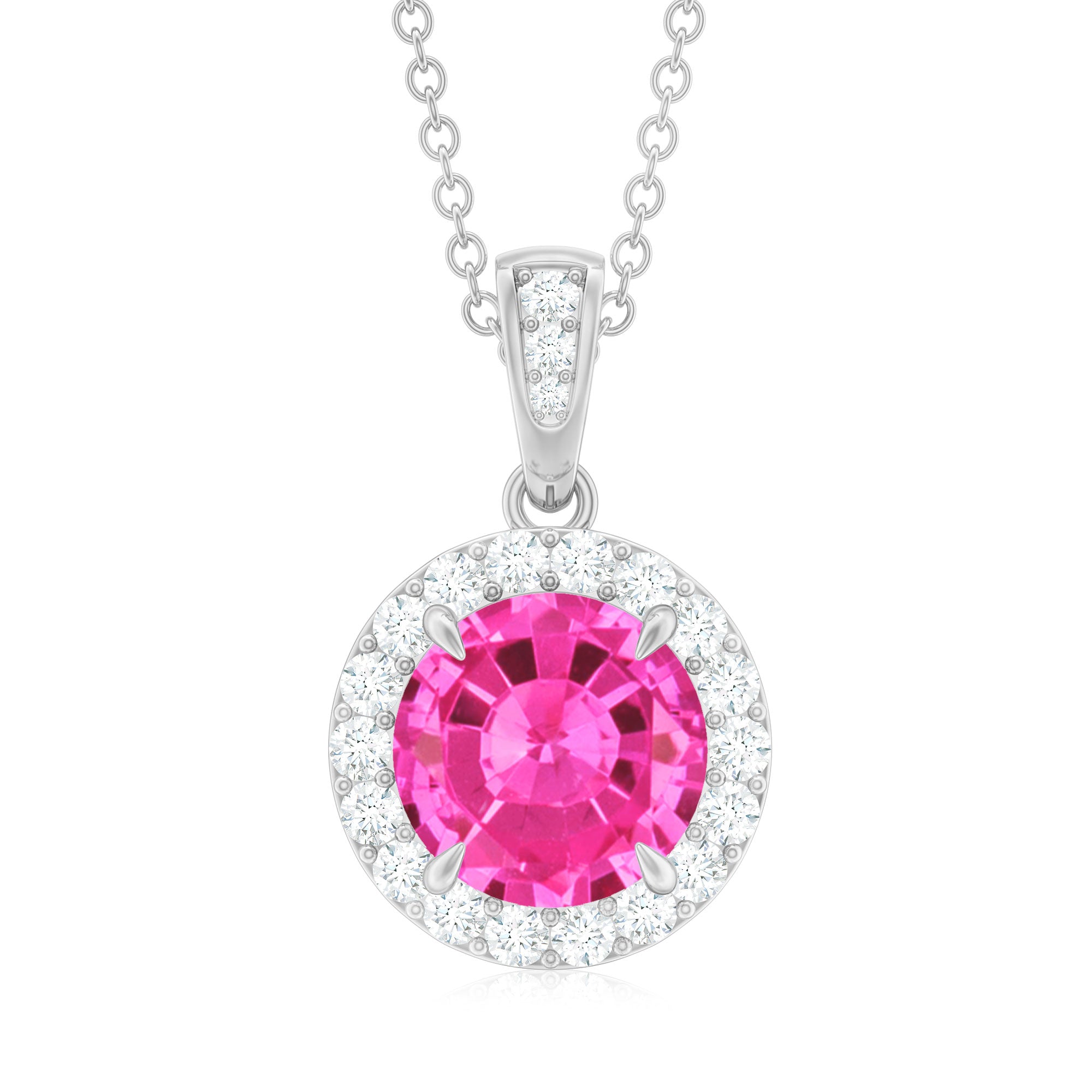 Experience the breathtaking beauty of this exquisite pendant necklace. A round created pink sapphire is adorned with a radiant Diamond halo, emphasizing its brilliance. Held securely in a claw setting, the created sapphire shines with dazzling allure from all angles. A lustrous bale with Diamond accents adds to its charm. An enchanting wear that captivates the eyes and heart.