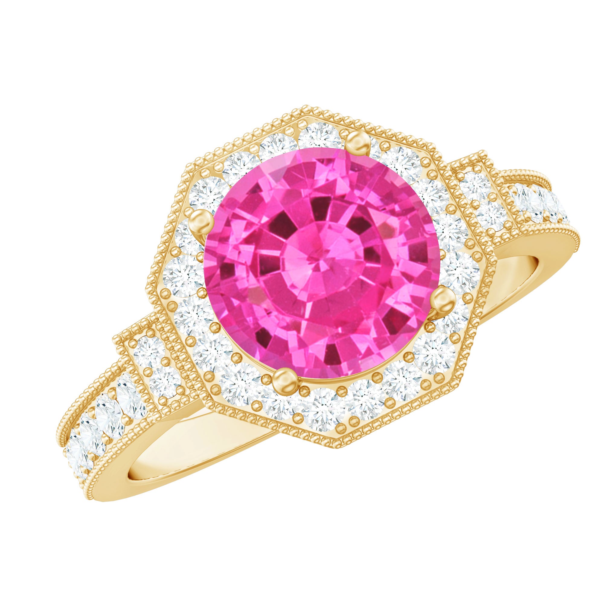 Make a statement with this Vintage Inspired Engagement Ring that is bursting with charm and personality. At the heart of the design is a stunning 8 MM round cut lab created pink sapphire, set securely in prong setting. Surrounding the pink sapphire is a geometric shape halo of real round cut diamonds, carefully chosen for their HI-SI quality. The halo’s unique geometric shape gives the Lab Grown Pink Sapphire Engagement Ring a modern twist while still keeping that timeless vintage feel. The band itself is beautifully detailed with beaded detailing, adding texture and elegance to the design. Diamonds are also set along the band, continuing the sparkle and making sure the Halo Engagement Ring shines from every angle. This Pink Sapphire and Diamond Ring combines classic elements with contemporary style, making it perfect for someone who loves vintage charm but wants a modern look. The AAAA quality lab created pink sapphire is both stunning and ethical, giving you peace of mind while enjoying its beauty. Whether you are popping the question or adding to your collection, this Vintage Sapphire Ring is a unique and thoughtful choice.