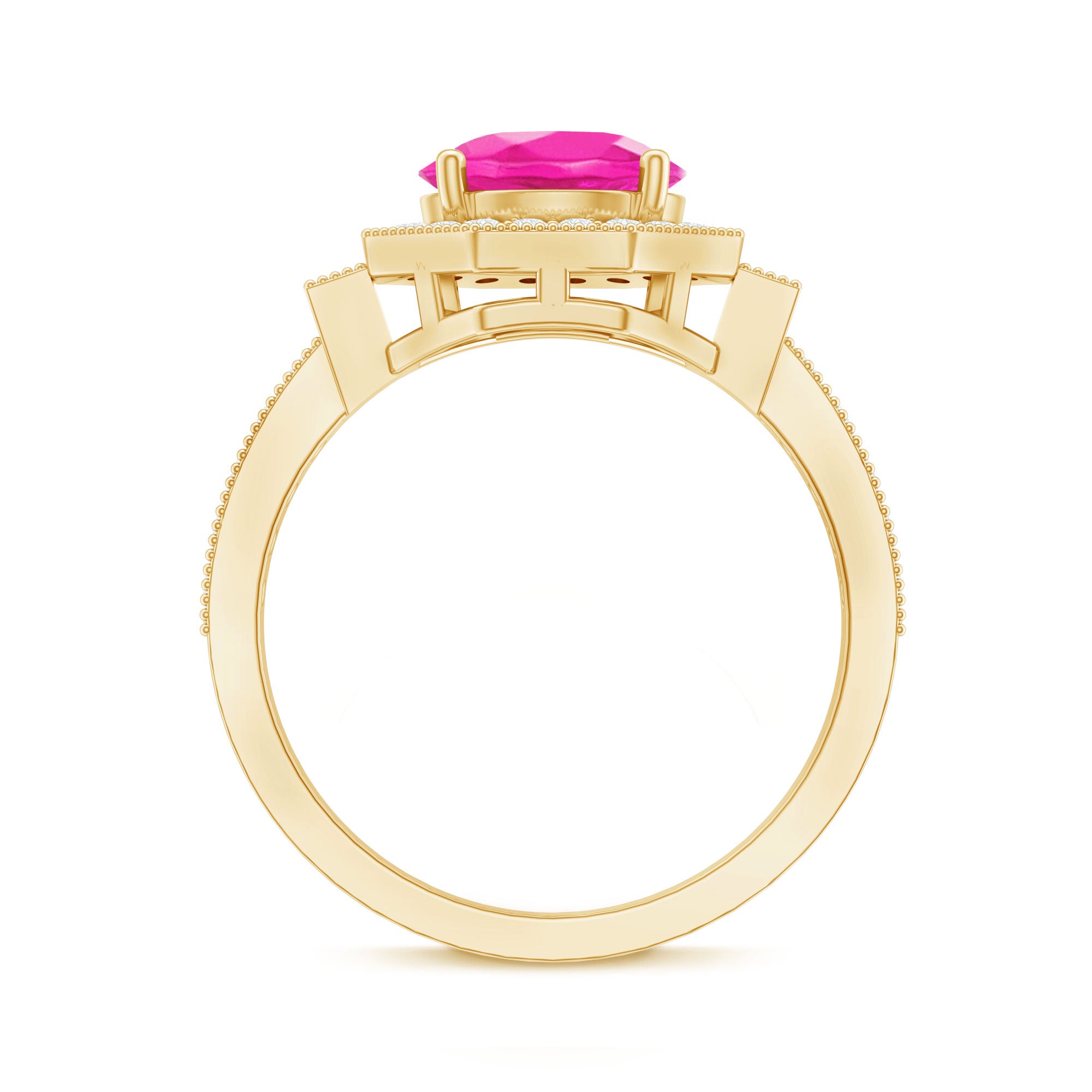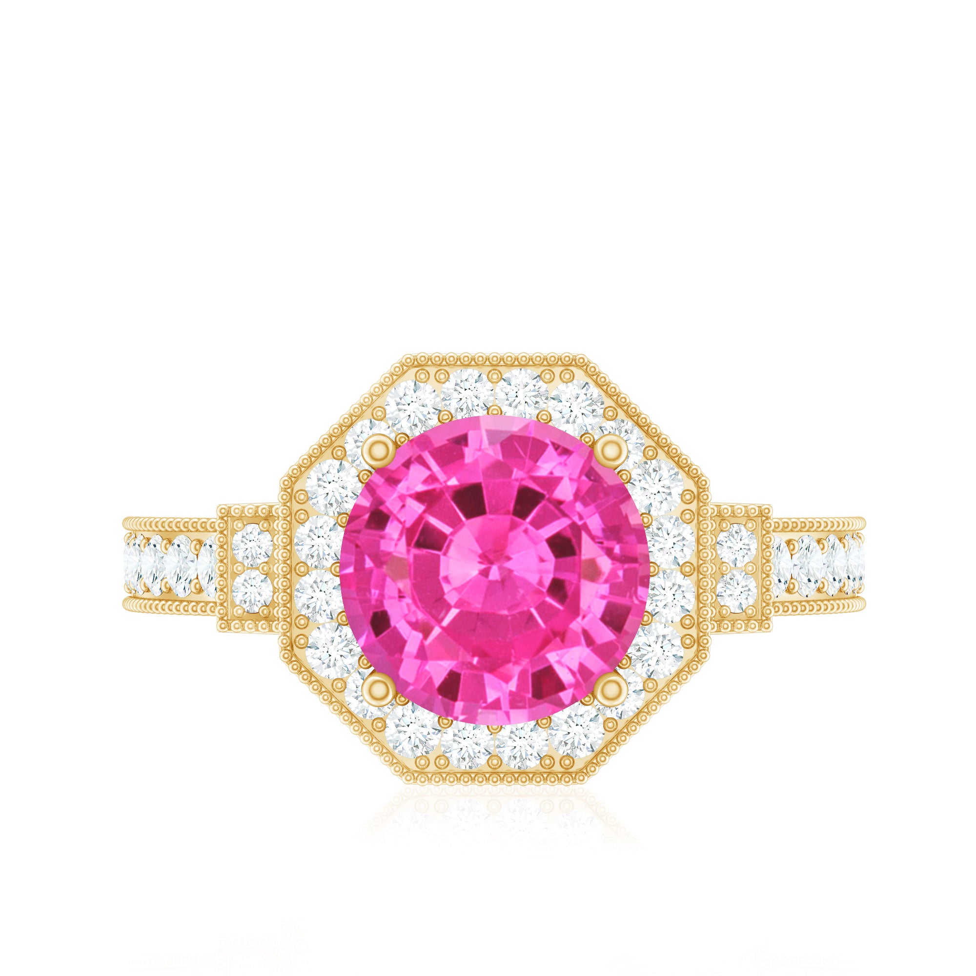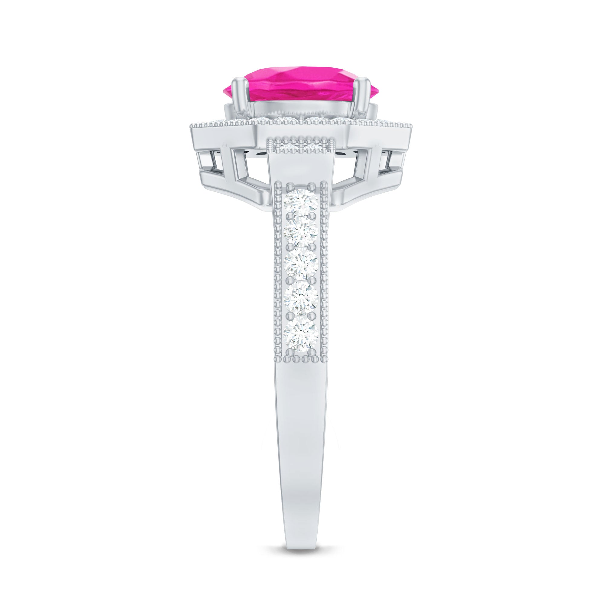 Make a statement with this Vintage Inspired Engagement Ring that is bursting with charm and personality. At the heart of the design is a stunning 8 MM round cut lab created pink sapphire, set securely in prong setting. Surrounding the pink sapphire is a geometric shape halo of real round cut diamonds, carefully chosen for their HI-SI quality. The halo’s unique geometric shape gives the Lab Grown Pink Sapphire Engagement Ring a modern twist while still keeping that timeless vintage feel. The band itself is beautifully detailed with beaded detailing, adding texture and elegance to the design. Diamonds are also set along the band, continuing the sparkle and making sure the Halo Engagement Ring shines from every angle. This Pink Sapphire and Diamond Ring combines classic elements with contemporary style, making it perfect for someone who loves vintage charm but wants a modern look. The AAAA quality lab created pink sapphire is both stunning and ethical, giving you peace of mind while enjoying its beauty. Whether you are popping the question or adding to your collection, this Vintage Sapphire Ring is a unique and thoughtful choice.