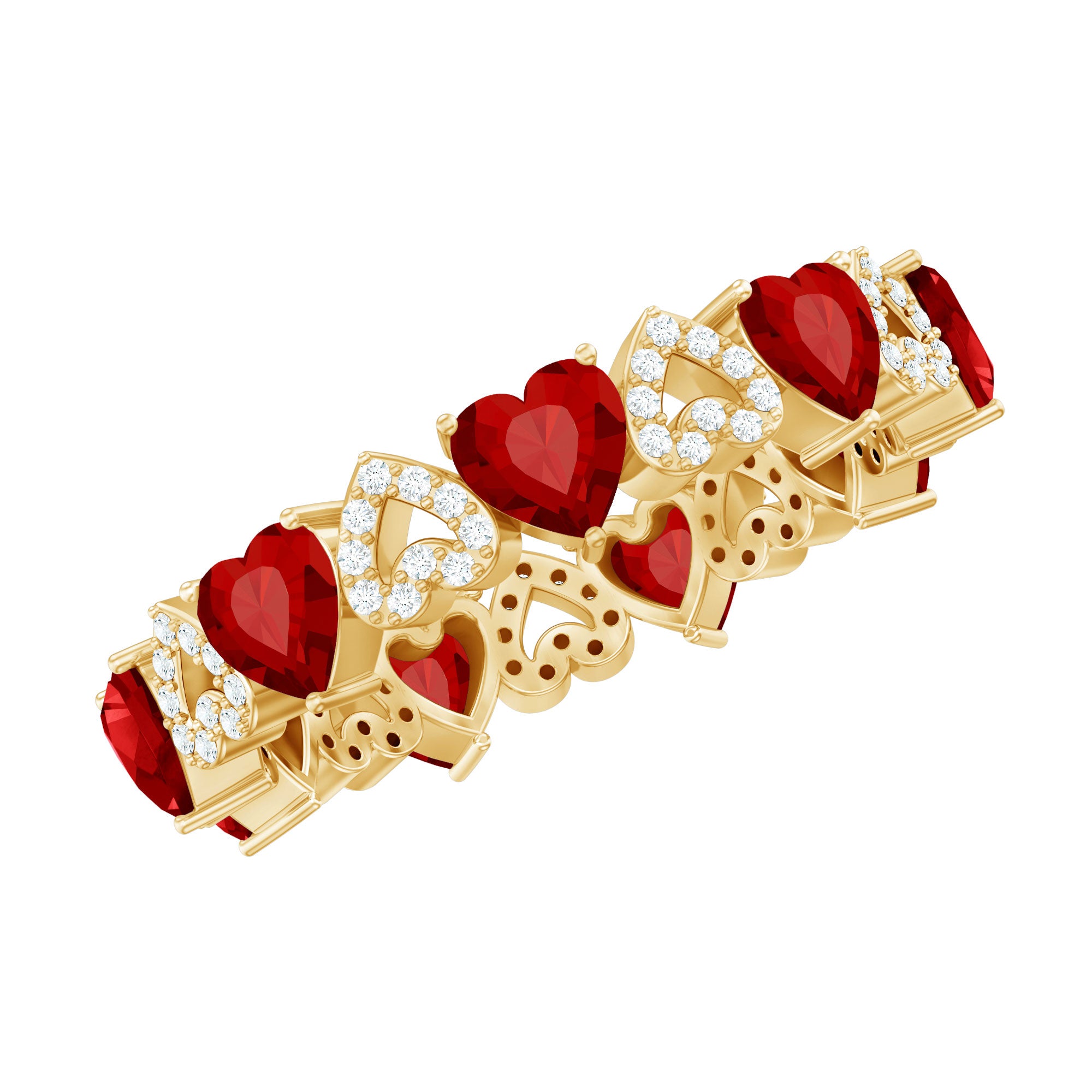 Capture her heart with the Created Ruby Heart Eternity Ring, featuring a heart-shaped created ruby and Round Shape Diamond stones adorning the heart motif. This ring is a perfect choice for celebrating the wedding anniversary and will make her heart beat with love for you.