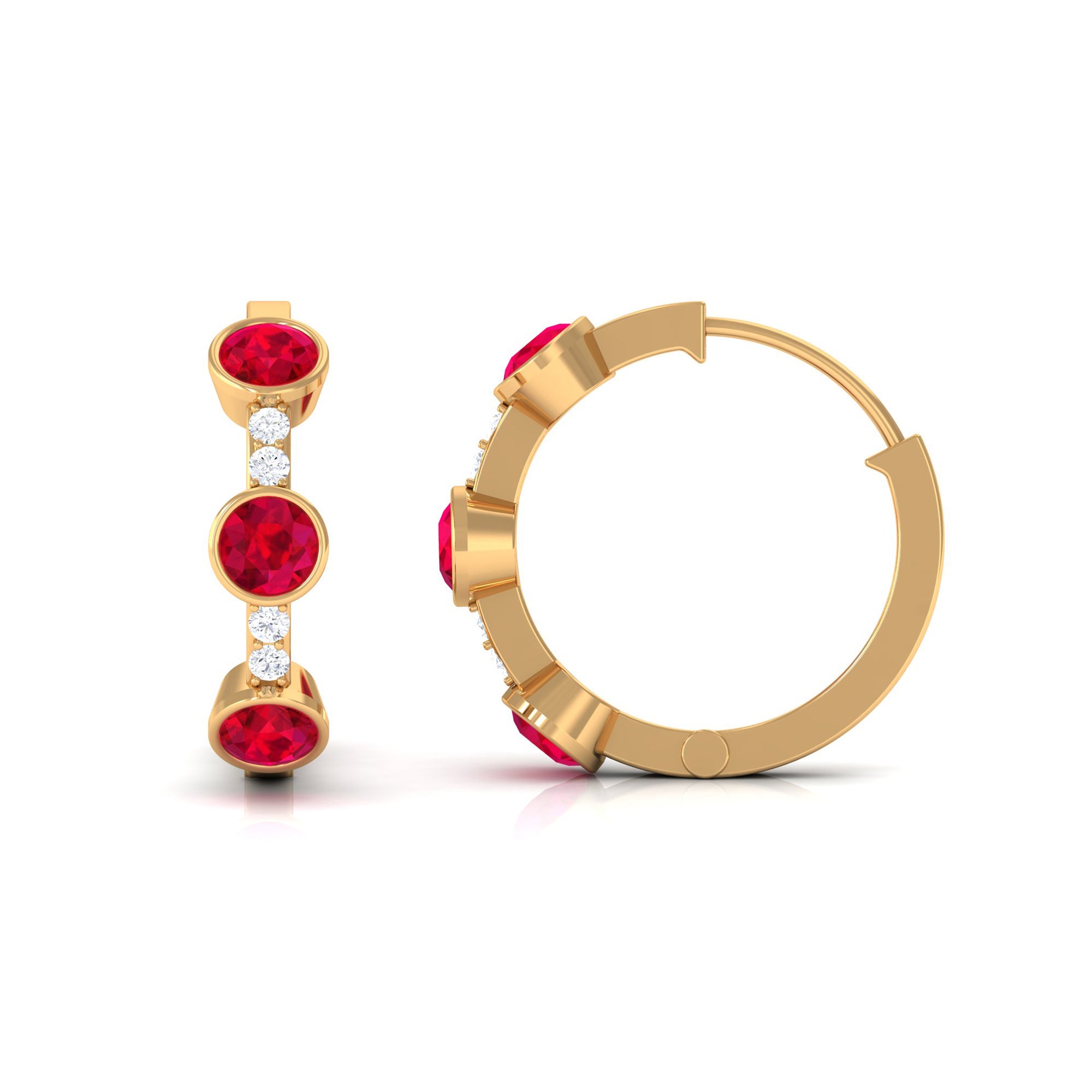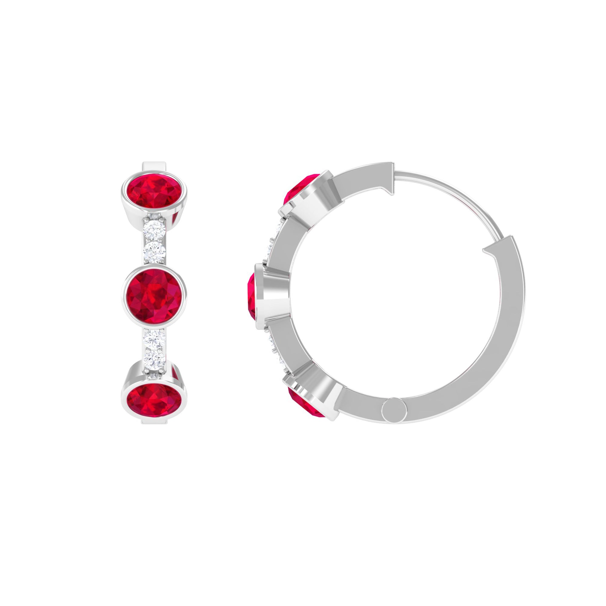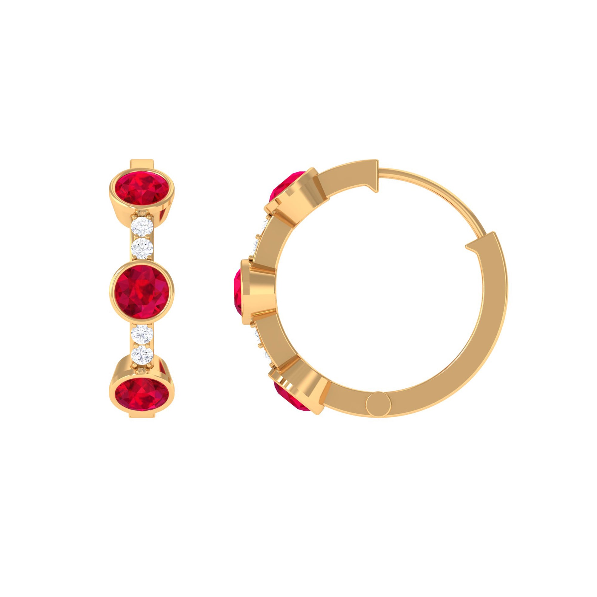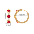 Tiny bursts of color and sparkle come together beautifully in these Ruby Hoop Earrings. Each earring features three round shaped lab created rubies, carefully set in bezel setting that holds the stones securely. Between the rubies, small natural diamonds are placed to add extra shimmer, creating a delicate contrast that makes the design truly eye-catching. The three stone design carries a special meaning, representing the past, present, and future. This makes the Ruby and Diamond Earrings a symbolic reminder of cherished memories, current moments, and the promises yet to come. Designed as hinged hoops, these Lab Grown Ruby Earrings are comfortable and easy to wear, allowing the stones to catch the light with every movement. Their versatile style makes them suitable for everyday wear or special occasions, adding just the right touch of luxury without being overpowering. Crafted with attention to detail, these Huggie Hoop Earrings are a perfect gift for a loved one or a meaningful addition to your own collection.