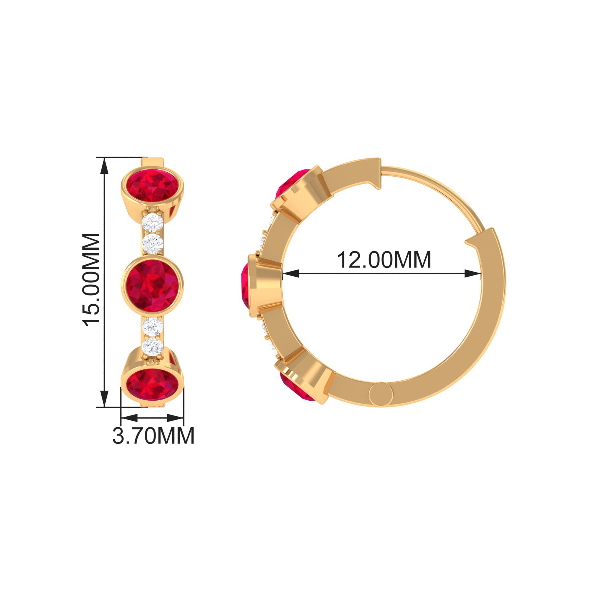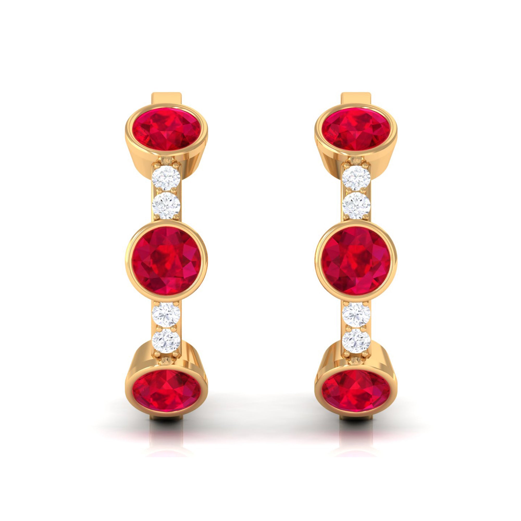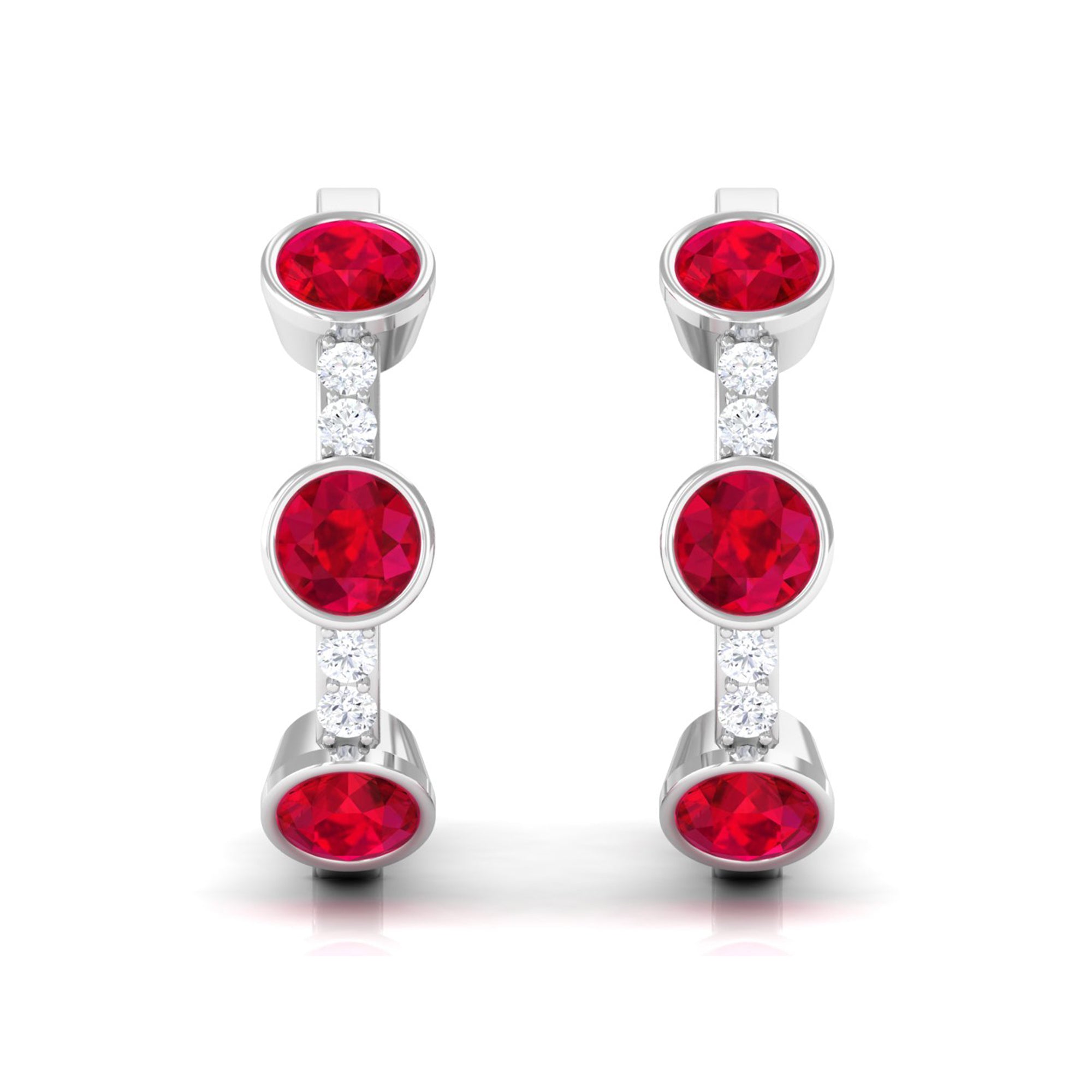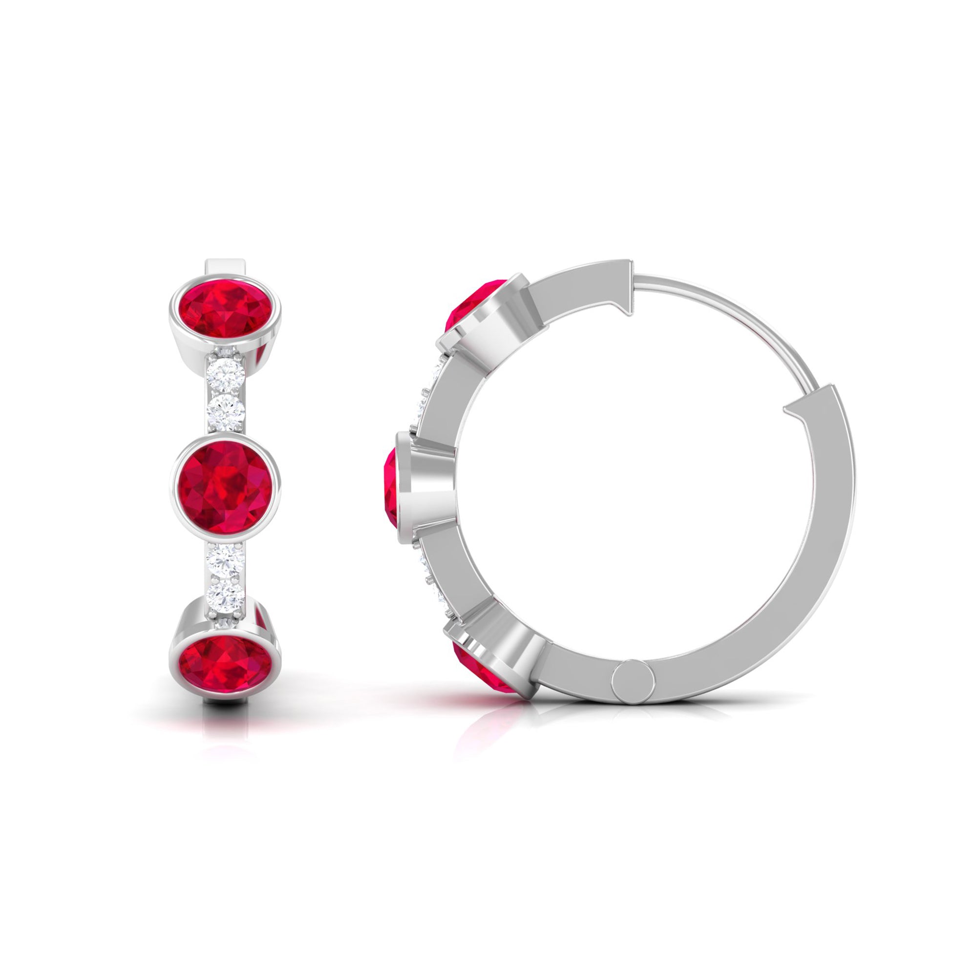 Tiny bursts of color and sparkle come together beautifully in these Ruby Hoop Earrings. Each earring features three round shaped lab created rubies, carefully set in bezel setting that holds the stones securely. Between the rubies, small natural diamonds are placed to add extra shimmer, creating a delicate contrast that makes the design truly eye-catching. The three stone design carries a special meaning, representing the past, present, and future. This makes the Ruby and Diamond Earrings a symbolic reminder of cherished memories, current moments, and the promises yet to come. Designed as hinged hoops, these Lab Grown Ruby Earrings are comfortable and easy to wear, allowing the stones to catch the light with every movement. Their versatile style makes them suitable for everyday wear or special occasions, adding just the right touch of luxury without being overpowering. Crafted with attention to detail, these Huggie Hoop Earrings are a perfect gift for a loved one or a meaningful addition to your own collection.