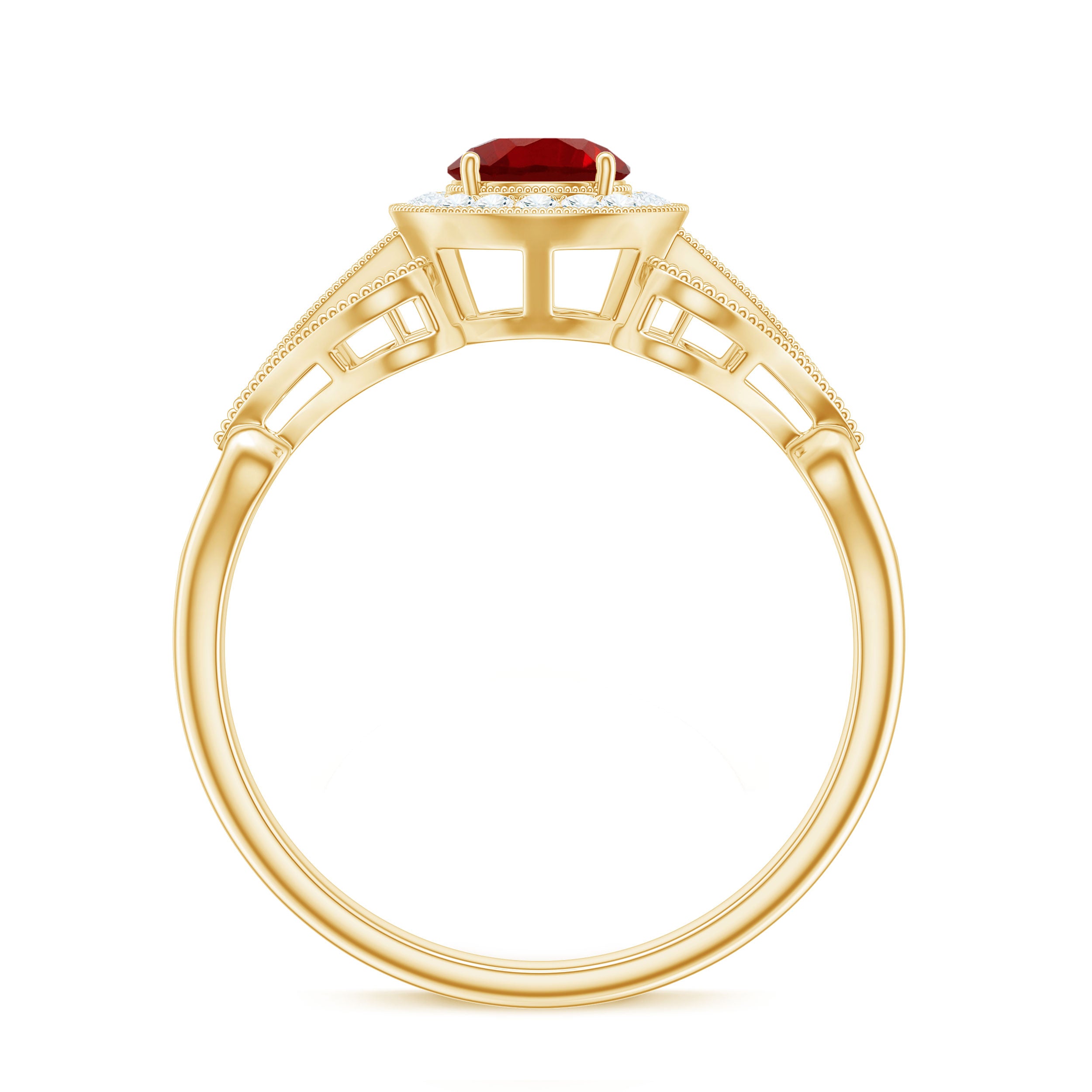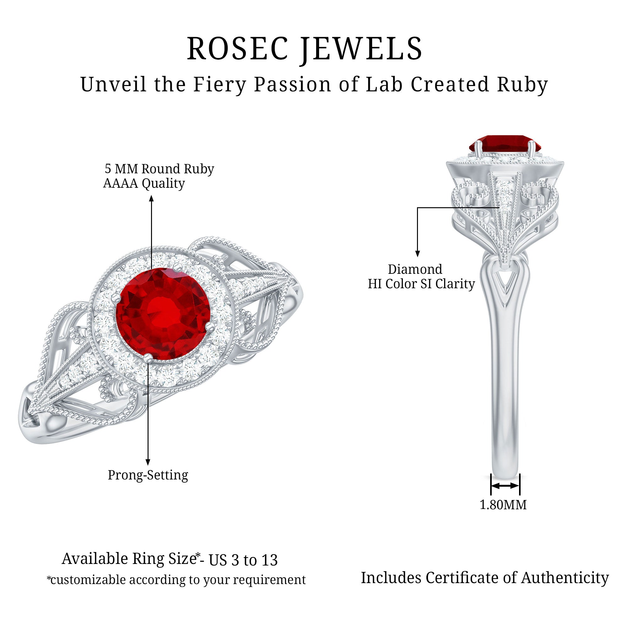 When your love story deserves something bold and beautiful, this Vintage Ruby Engagement Ring brings just the right mix of elegance and charm. Designed to feel both classic and special, it is the kind of piece that instantly catches the eye and holds the heart. At the center of the Antique Looking Engagement Ring is a stunning 5 MM round lab created ruby set in a secure prong setting. Surrounding the ruby is a delicate halo of sparkling diamonds, creating a soft shimmer that makes the ruby stand out even more. The band is where vintage inspiration truly shines. Fine beaded detailing runs along the sides, giving the Ruby and Diamond Ring an antique touch that feels romantic and full of character. Additional small round diamonds are set along the shoulders of the band, adding just enough sparkle without making the Vintage Ruby Ring feel too flashy. Every detail is carefully crafted to balance beauty with meaning, making it a lovely choice for someone who appreciates timeless design with a personal touch. The Lab Grown Ruby Ring comes in a beautiful box, ready to be gifted or treasured.
