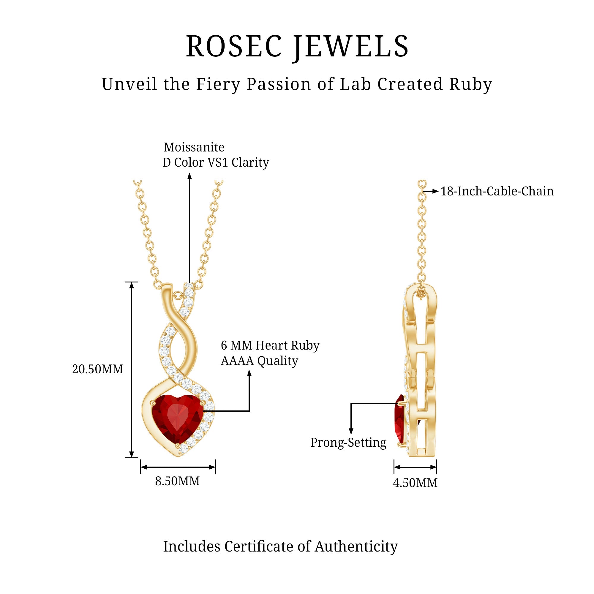 Share your feelings in a simple yet beautiful way with this Infinity Heart Necklace, made to show love that never ends. It is crafted in 14k yellow gold plated silver and features a 6 MM heart shaped lab created ruby, placed securely in prong setting. The deep red ruby sits inside a flowing infinity symbol, making it a strong reminder of lasting love and special bonds. To add a touch of sparkle, one side of the infinity loop is lined with round moissanite stones. The mix of AAAA quality lab grown ruby and D-VS1 quality moissanite creates a charming contrast that looks elegant. The Ruby Heart Necklace hangs from an adjustable chain that closes with a lobster clasp, so it is easy to wear at the length you like. Light in weight and comfortable to wear, this Ruby and Moissanite Necklace fits perfectly into both everyday looks and special moments. It is a sweet way to show love, friendship, or a promise that means a lot. Perfect for birthdays, anniversaries, or any small but meaningful occasion. With its heart and infinity design and thoughtful details, this Ruby Infinity Necklace is a lovely choice for anyone who enjoys jewelry that tells a story. Packed in a beautiful jewelry box, it is ready to be gifted or kept as a keepsake close to your heart.