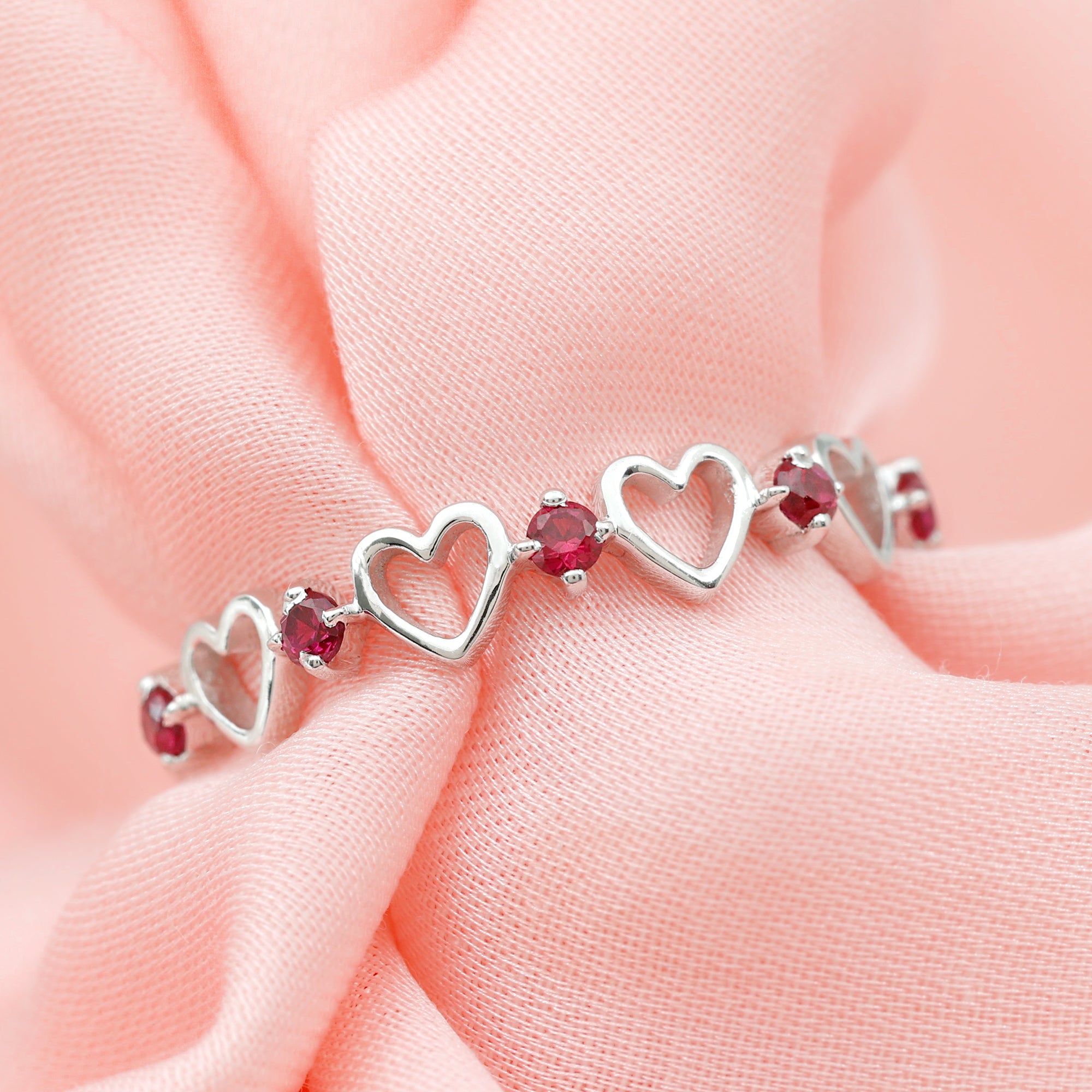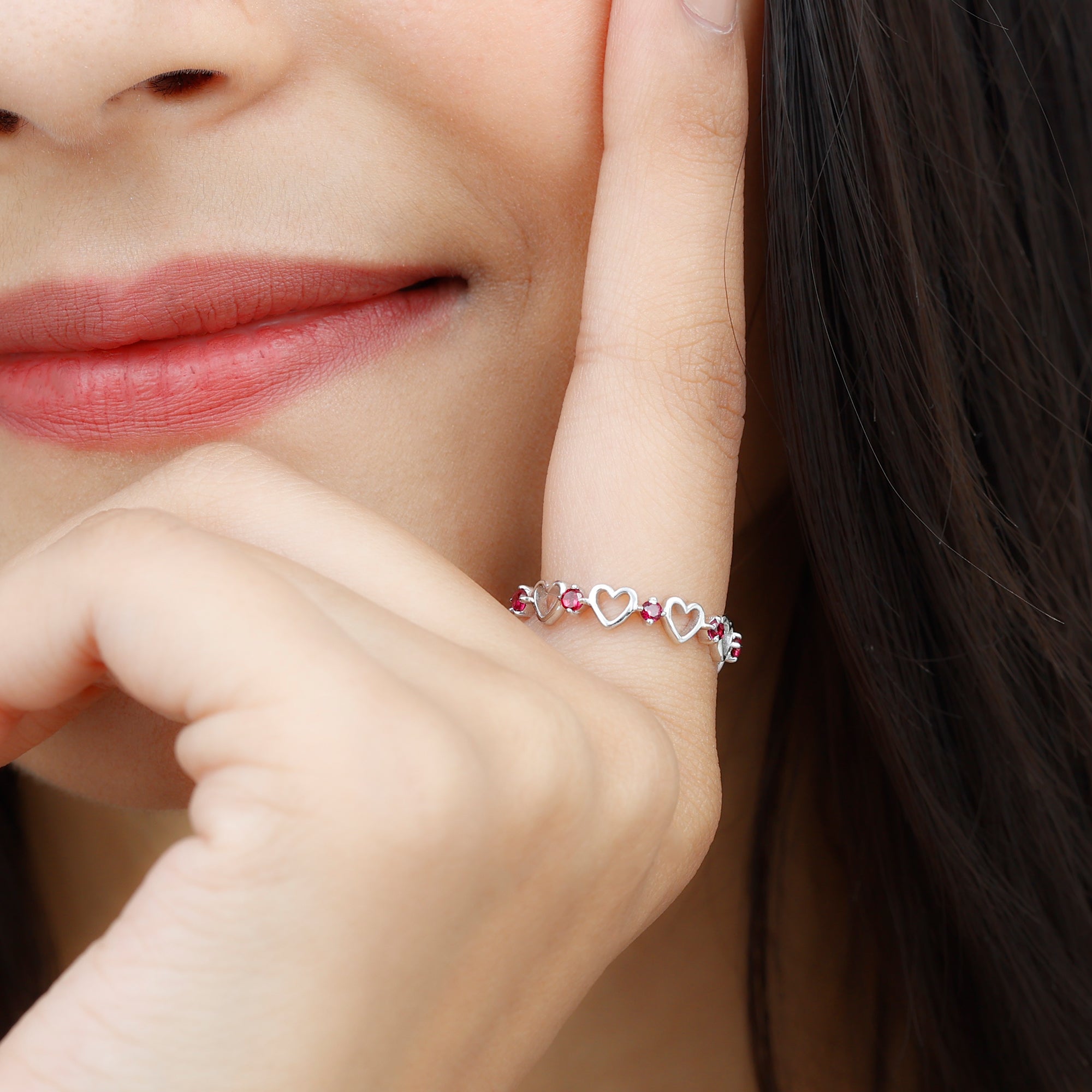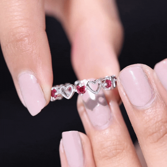 This stunning Ruby Eternity Ring is a captivating symbol of eternal love and beauty. The exquisite ring features Round Shape Ruby that encircle the band, symbolizing unending love and devotion. The open heart design adds a romantic touch, making it a meaningful gift for someone special or a beautiful addition to your jewelry collection. The vibrant red hue of the rubies contrasts beautifully creating a mesmerizing and timeless aesthetic. Whether as a promise ring, anniversary gift, or a celebration of love, the Open Heart Eternity Ring is a timeless and elegant choice that will be cherished for a lifetime. With its exquisite craftsmanship and timeless allure, this Promise Ring for Her is sure to make a statement and capture hearts.