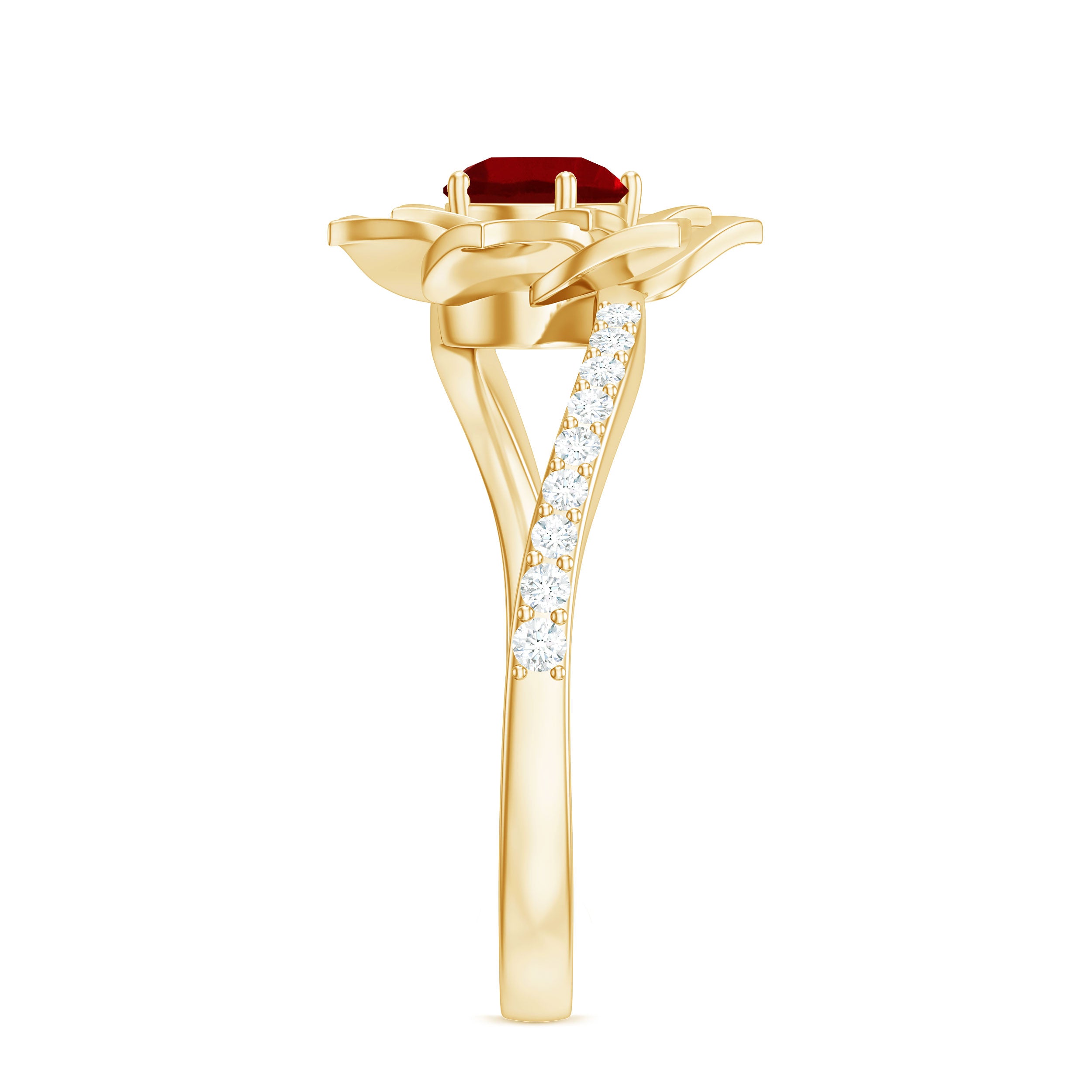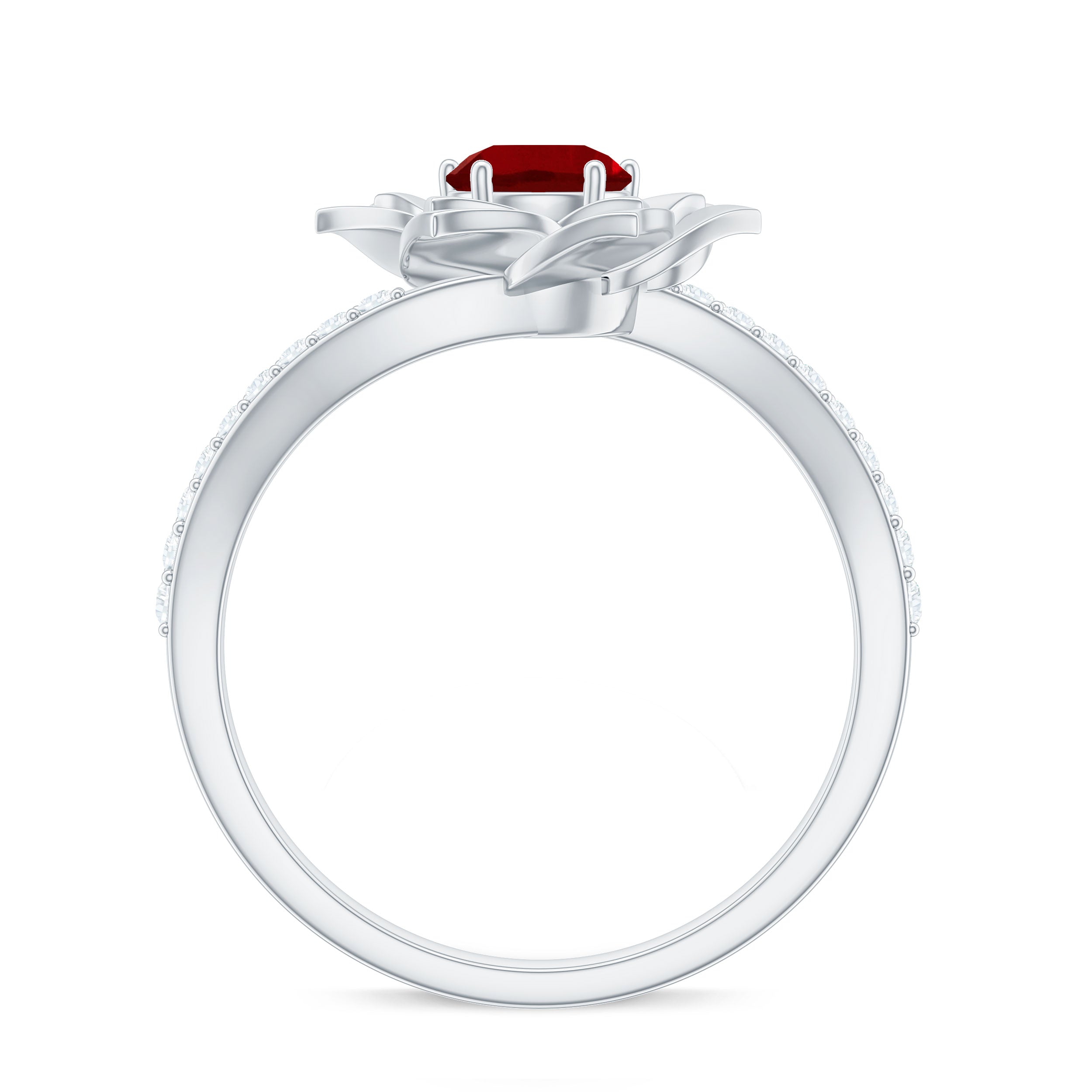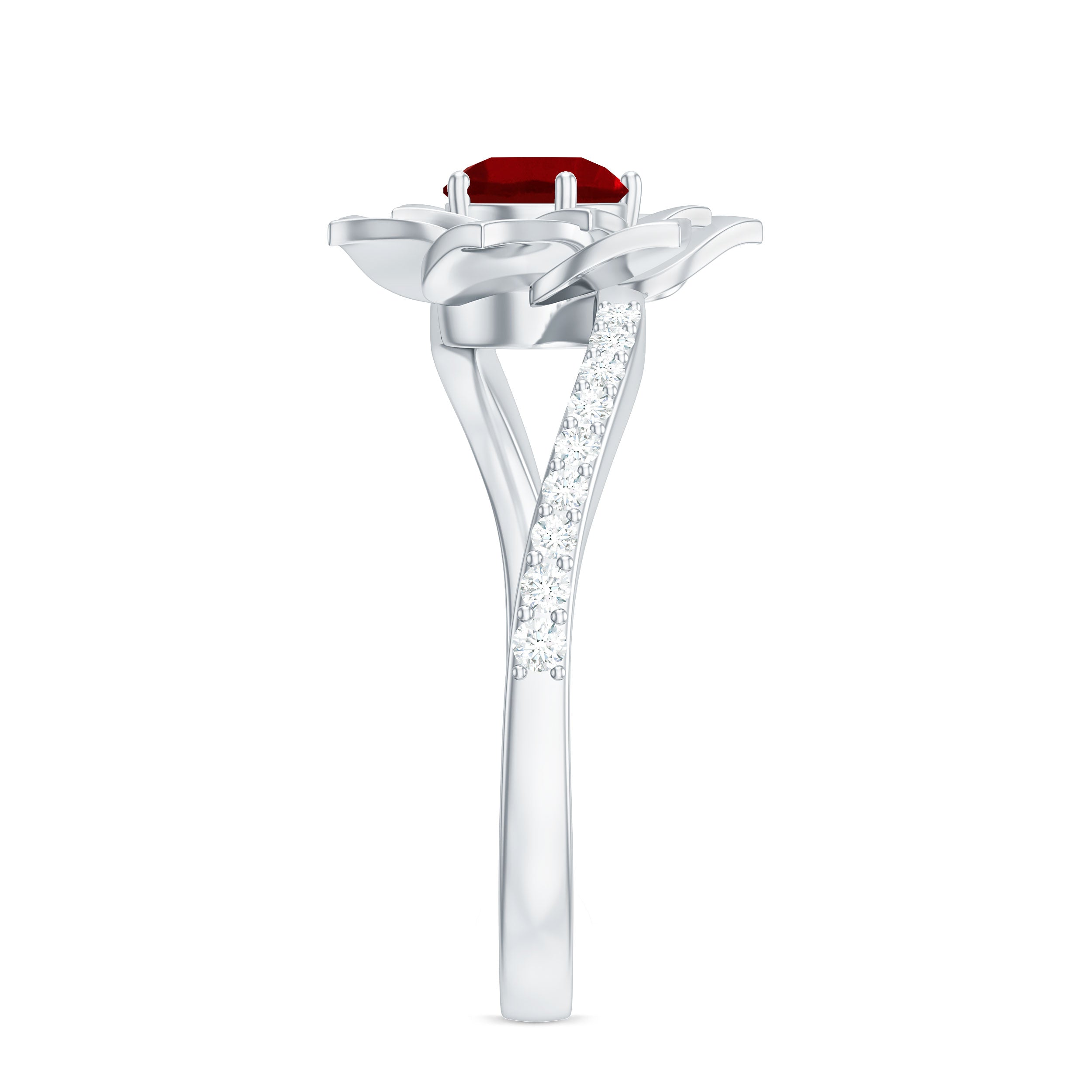 This lab created ruby rose flower engagement ring is designed for those who appreciate symbolism and artistry. The floral silhouette captures the essence of a blooming rose, representing love and commitment through thoughtful craftsmanship.