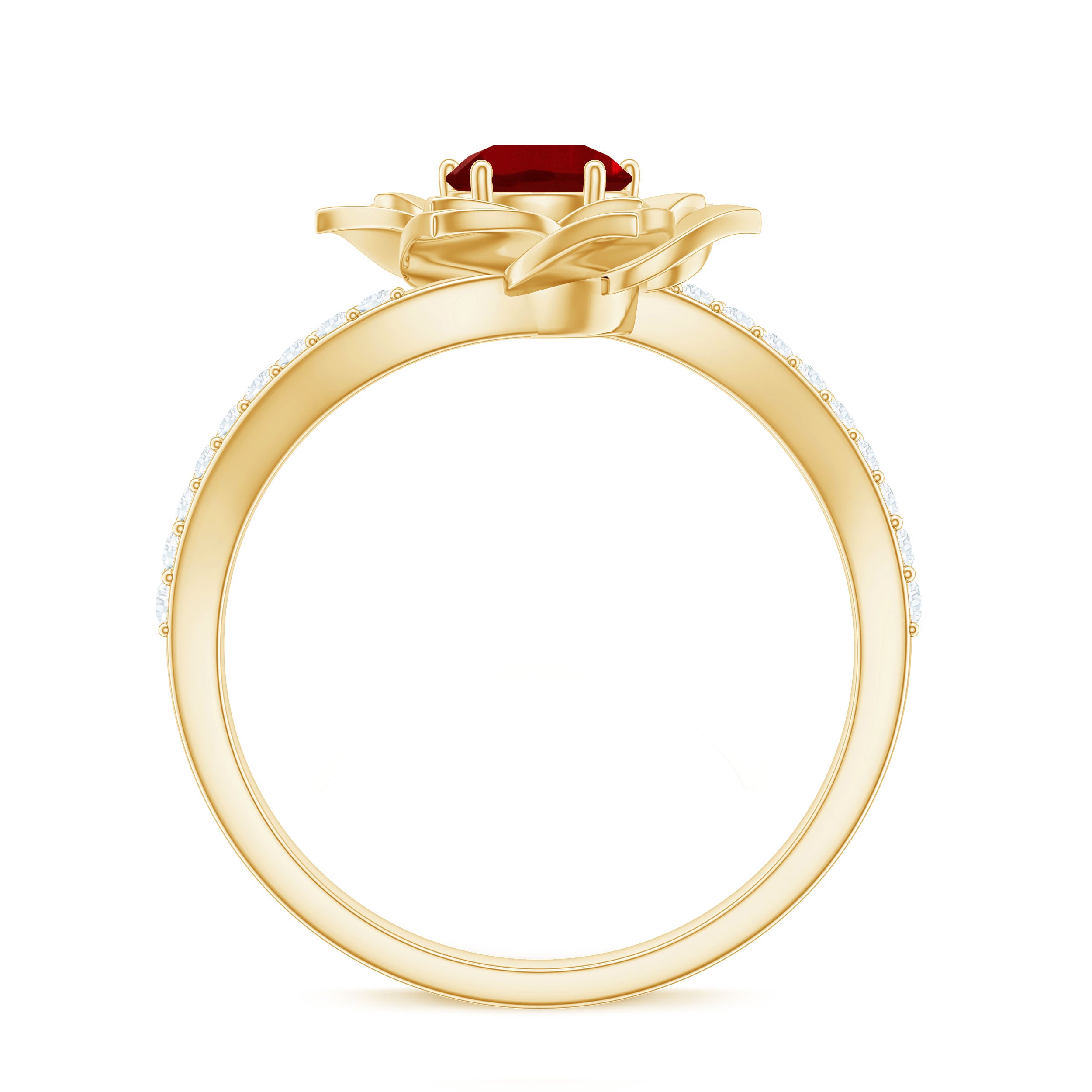At the center of the floral motif sits a lab created ruby, chosen for its rich red hue and consistent brilliance. The gemstone’s vibrant tone draws the eye inward, anchoring the design with warmth and intensity.