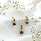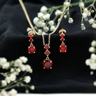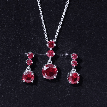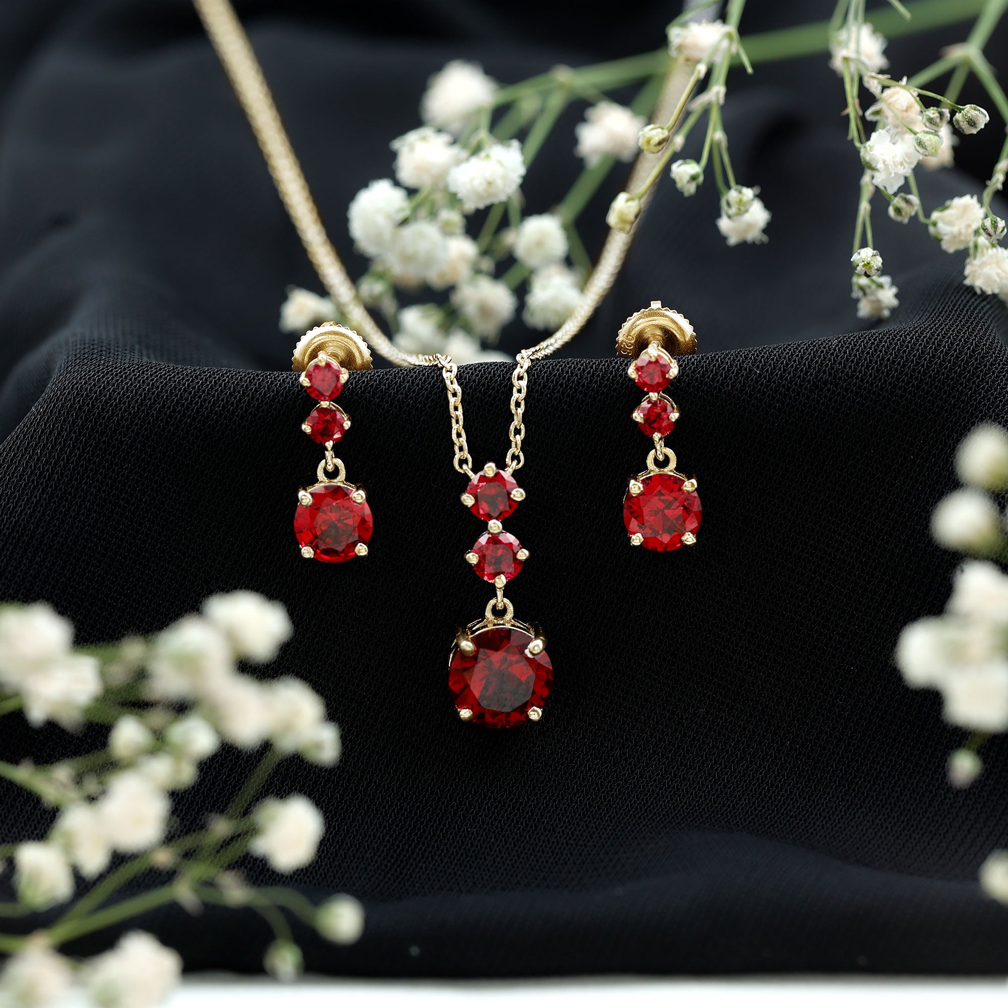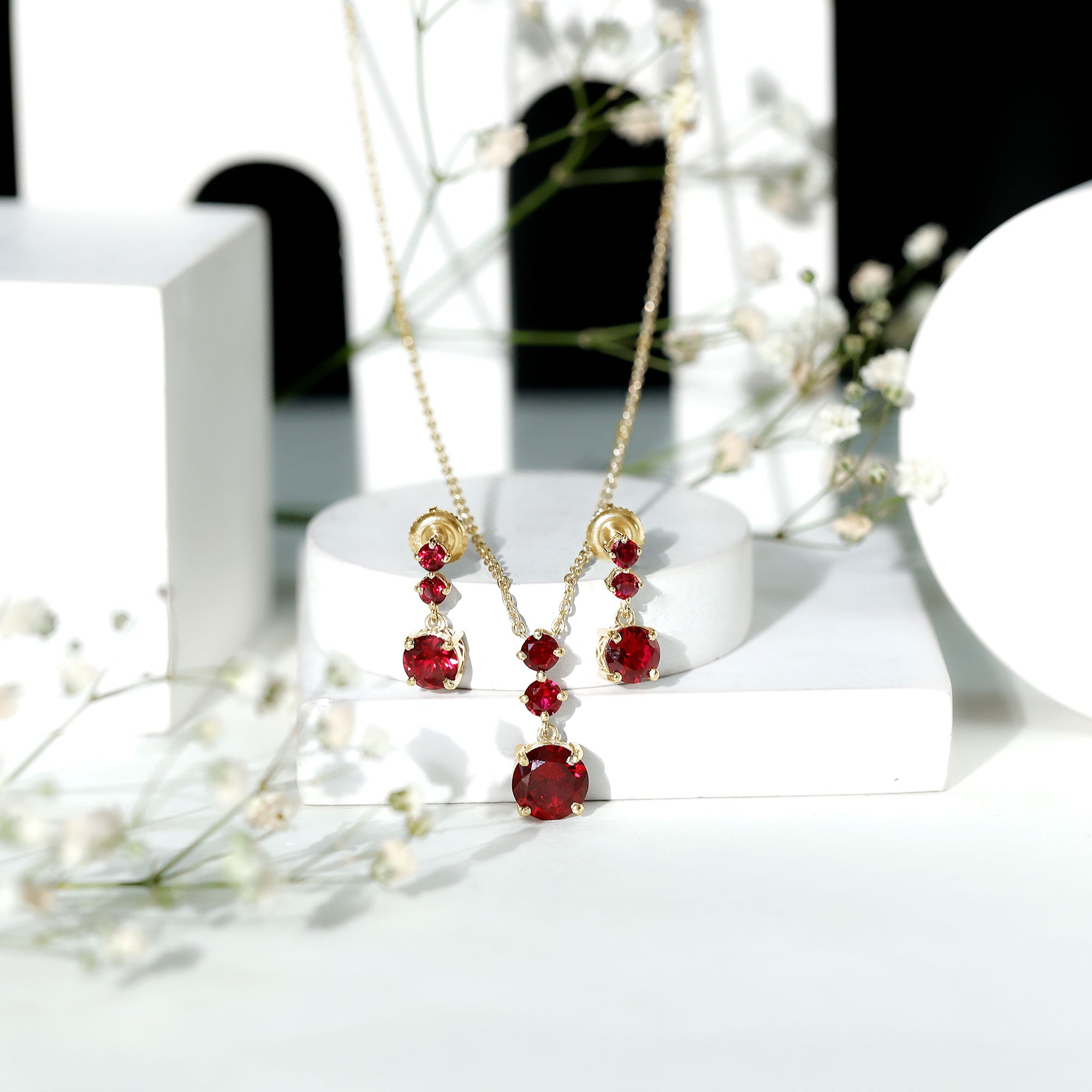 Capture the spotlight with this stunning Lab Created Ruby Earring and Pendant Set. Featuring a Lab Created Ruby Pendant with a 3 Stone design and matching Earrings, this jewelry set is the perfect accessory for you. Crafted in solid gold, it exudes enchanting appeal that will make you the talk of the town.