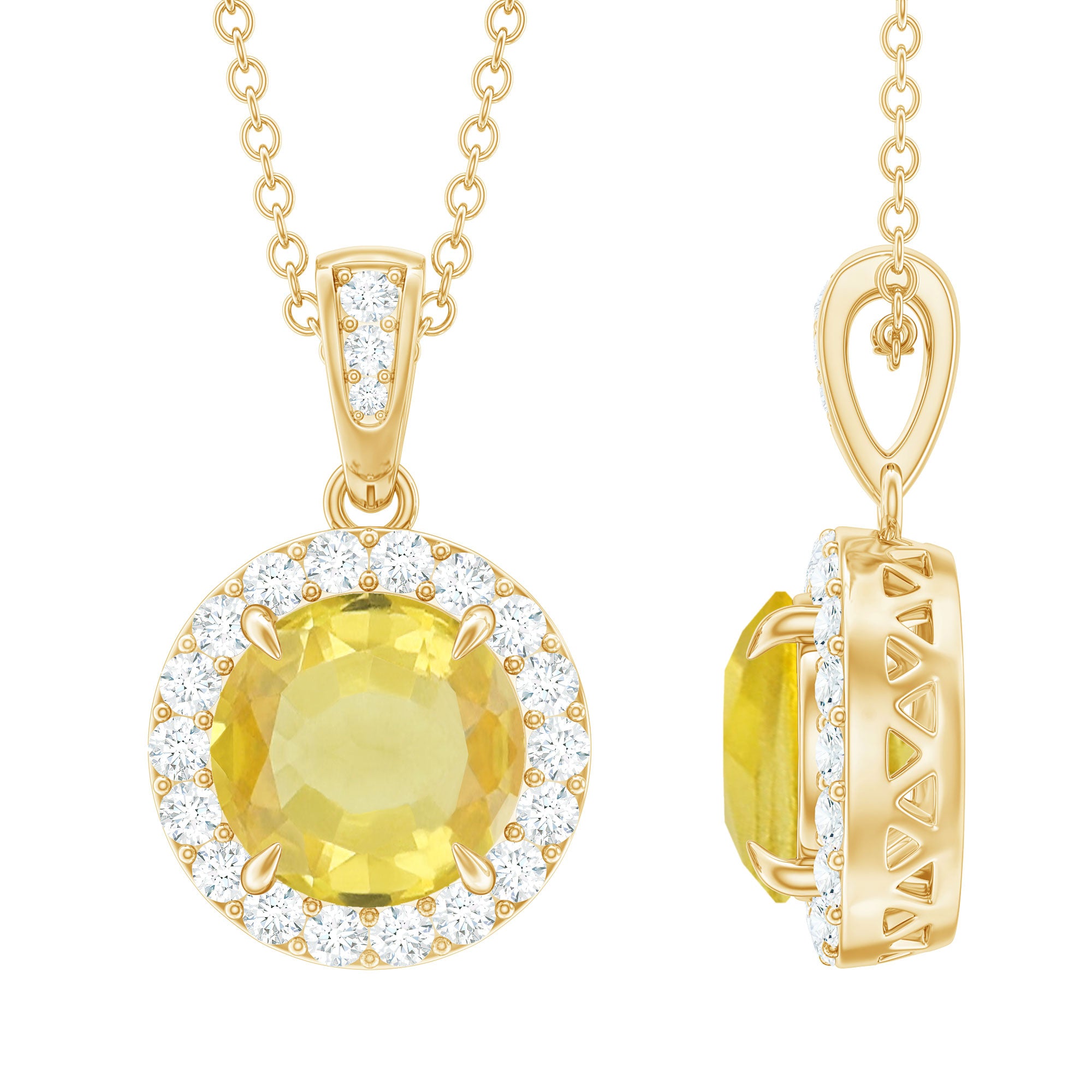 Witness the awe-inspiring splendor of this magnificent pendant necklace. Its centerpiece, a round created yellow sapphire, is elegantly encircled by a radiant Diamond halo, accentuating its brilliance in a mesmerizing display. The created yellow sapphire is securely held in place by a claw setting, allowing it to radiate dazzling allure from every perspective.