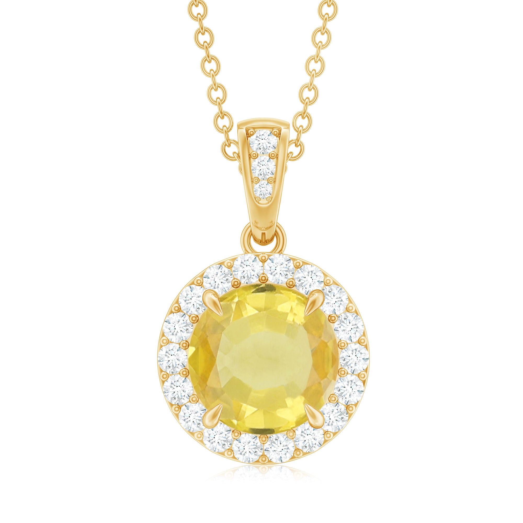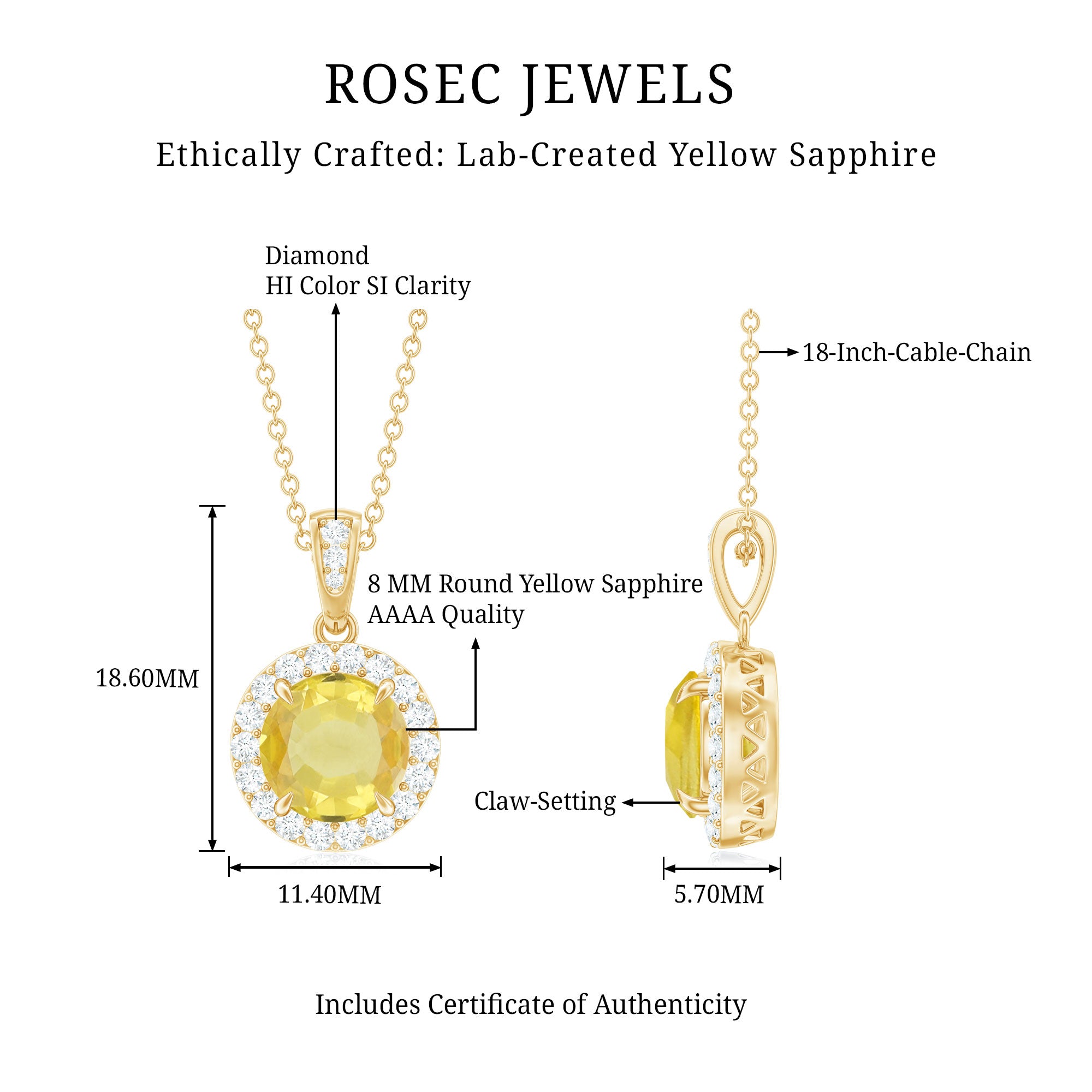 Witness the awe-inspiring splendor of this magnificent pendant necklace. Its centerpiece, a round created yellow sapphire, is elegantly encircled by a radiant Diamond halo, accentuating its brilliance in a mesmerizing display. The created yellow sapphire is securely held in place by a claw setting, allowing it to radiate dazzling allure from every perspective.