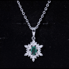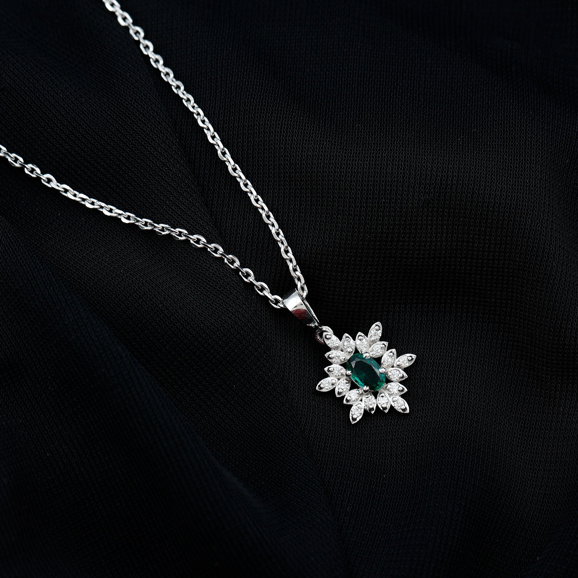 This beautiful Art Deco Pendant, crafted from 14k white gold plated silver, is exactly what you need to enhance your neckline for that special event. It showcases a stunning 4X6 MM oval cut lab grown emerald stone, securely held in prong setting, and surrounded by detailed leaf motifs embellished with smaller Moissanite stones that amplify its charm. The simple bail links the Vintage Pendant Necklace to a fine cable chain. This Wedding Pendant serves as the ideal finishing touch for your big day. Every aspect of the necklace demonstrates exceptional craftsmanship, making it a wonderful gift for milestones, celebrations, or just a special treat for yourself. Channel the elegance and allure of a past era along with the beauty of nature by choosing this exquisite piece for brides-to-be who appreciate jewelry that seamlessly combines retro elements with a contemporary flair. Indulge in a hint of timeless luxury with this Lab Grown Emerald Pendant Necklace, which is beautifully packaged and includes a certificate of authenticity.